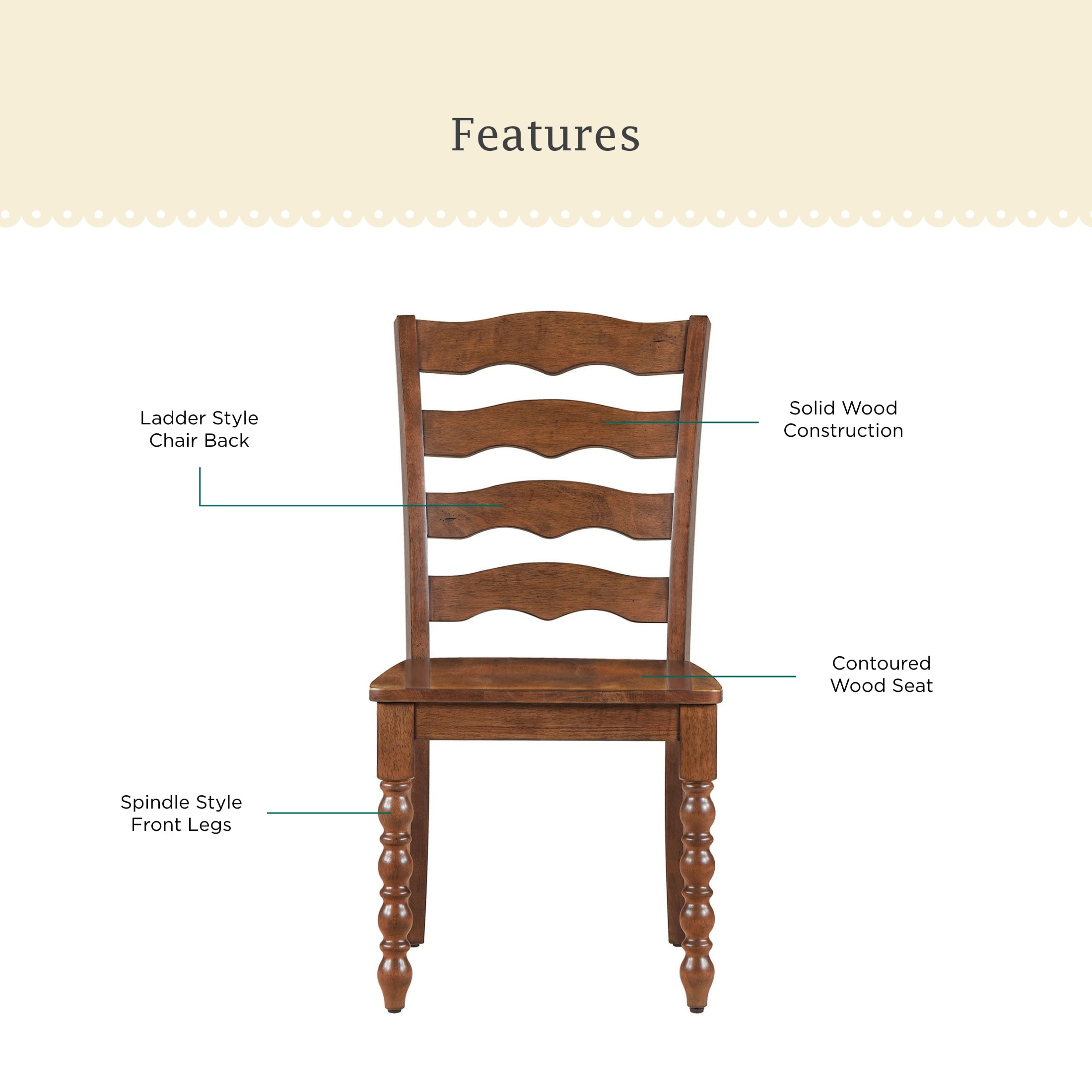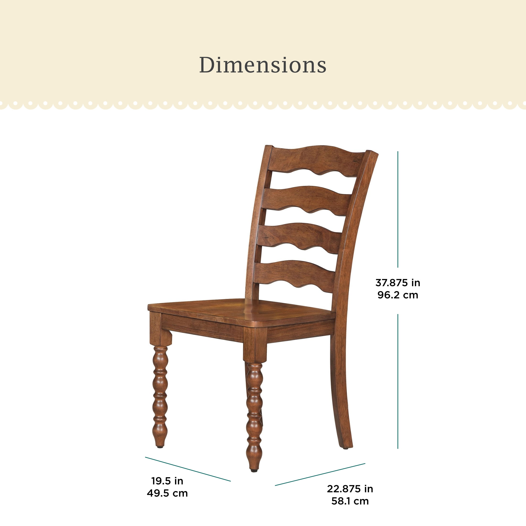 Set of 2 Chairs: Ideal for dining rooms or kitchen dining areas Solid Wood Construction: Durable and long-lasting, ideal for everyday use Spindle-Style Front Legs: Adds a touch of classic farmhouse charm Ladder-Style Chair Back: Provides comfortable support and an elegant look Available in Two Finishes: Choose between homestead brown and white to match your decor Pairs with Pioneer Woman Dining Tables: Versatile design complements any Pioneer Woman dining table (sold separately) Easy to Assemble: Hassle-free setup so you can enjoy your new stools quickly Product Dimensions: 19.5 IN W x 22.875 IN D x 37.875 IN H (49.5 CM x 58.1 CM x 96.2 CM) Product Weight: 39.7 lb (17.19 kg) Packaging Dimensions: 40.625 IN x 21.625 IN x 10.75 IN Packaging Weight: 43.2 LB (19.6 kg) Model# PW1425004710064, PW1425004710065