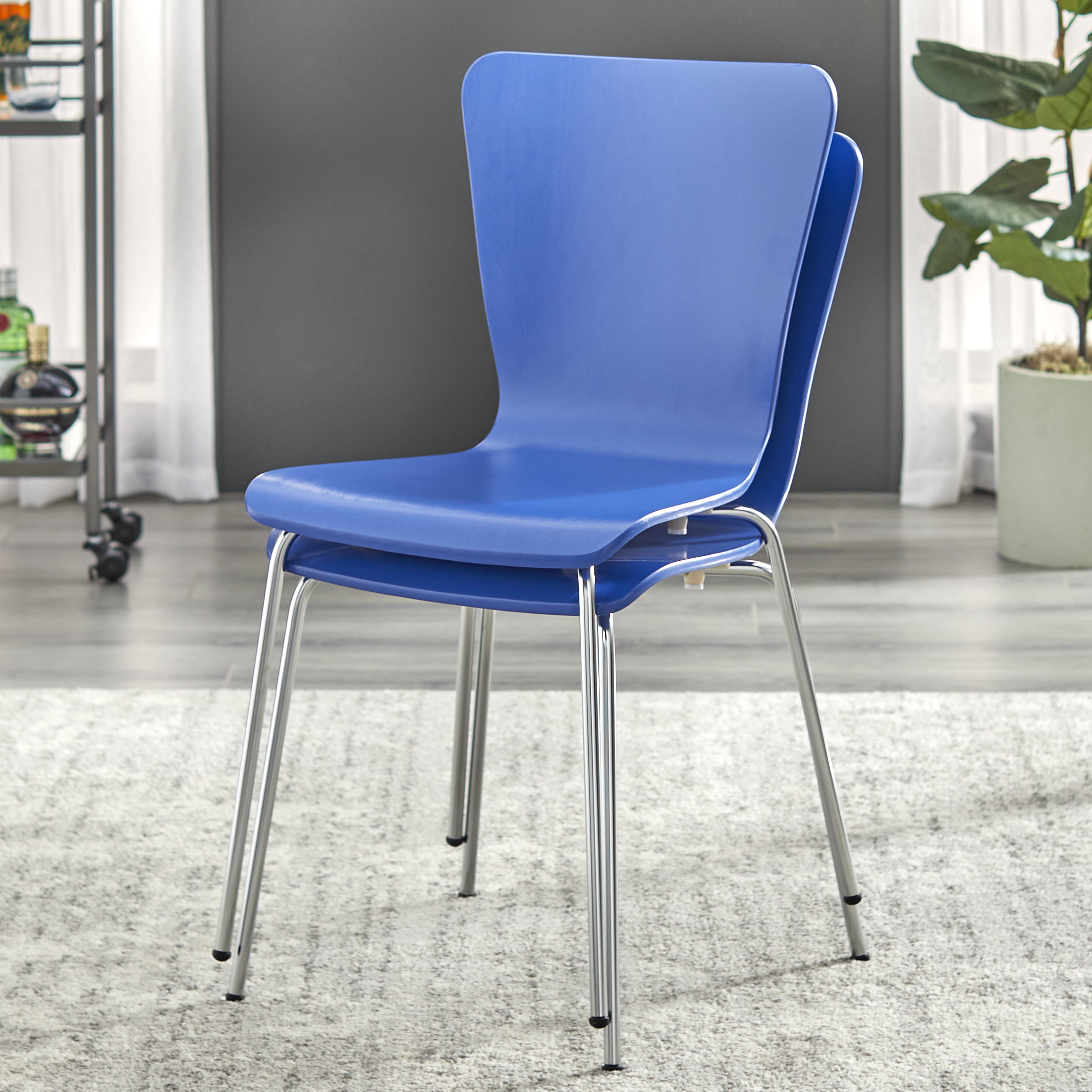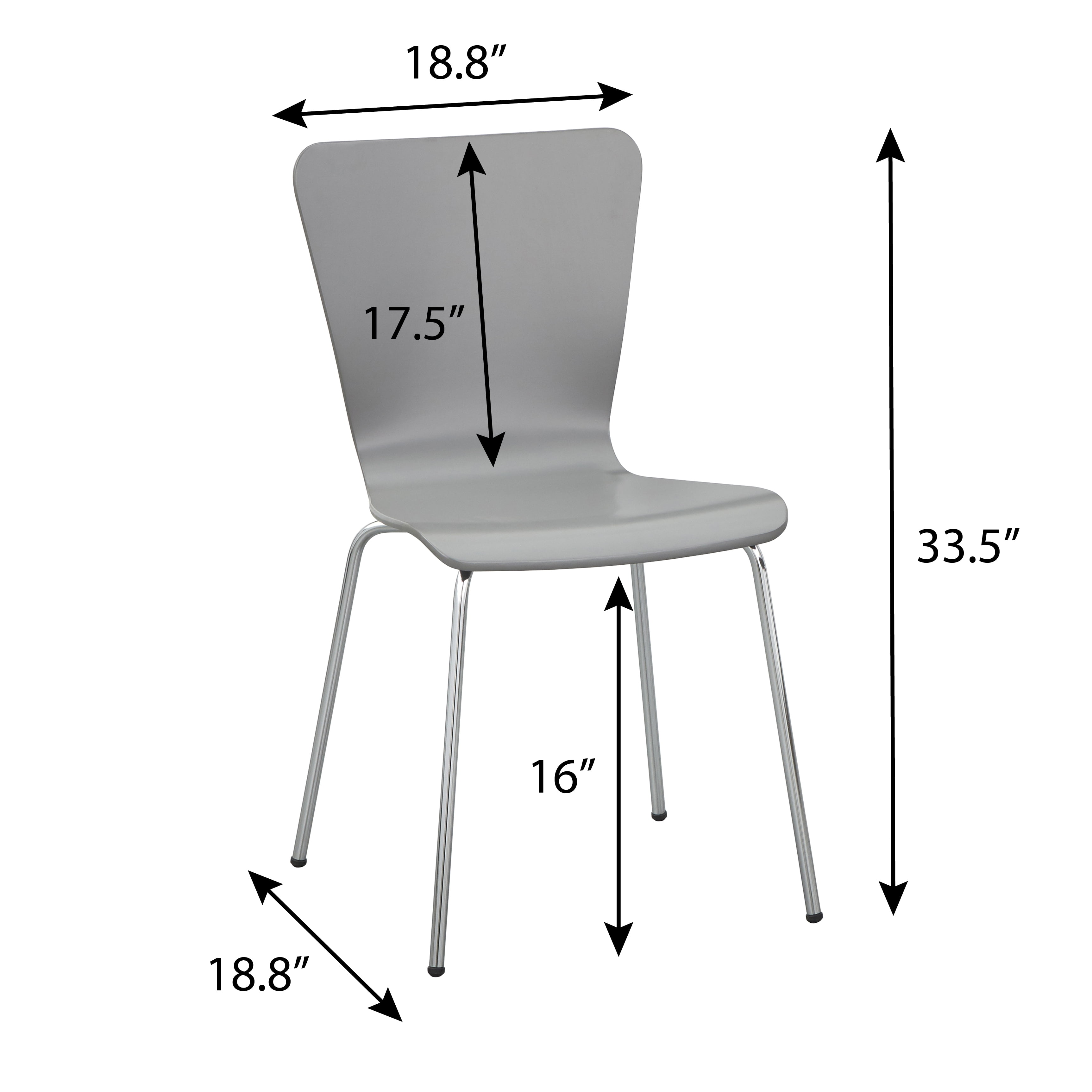 Chair Dimensions: 18.8″ W x 18.8″ D x 33.5″ H Seat Height: 16″ Made of bentwood and metal Availbalbe in black, blue, charcoal gray, dark green, pink, red, white and yellow Polished chrome legs Chairs stack for easy storage Ships in 1 box For indoor use only