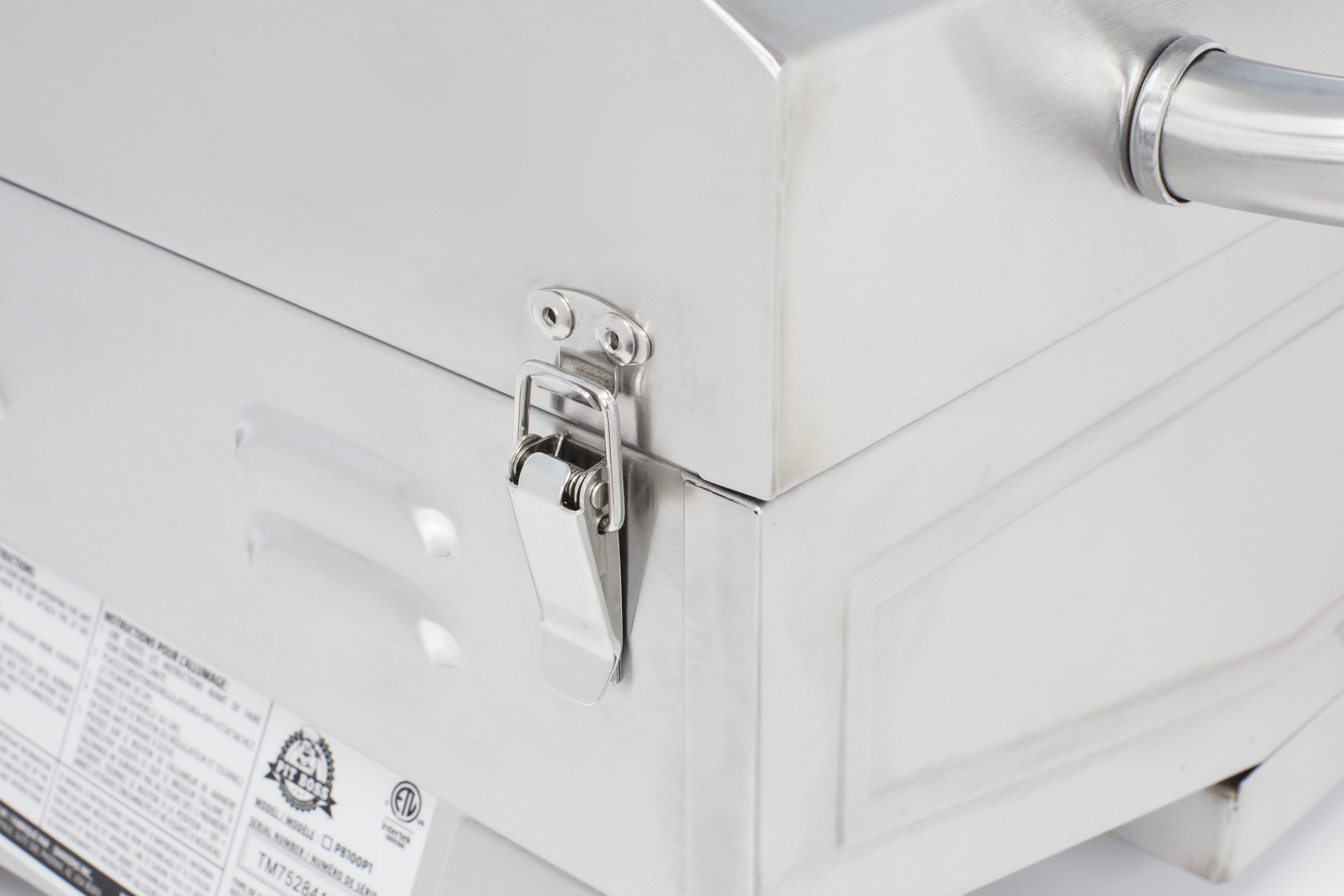 Stainless Steel body and hood with dome thermometer and latching hood. 10,000 BTU stainless Steel “U” shaped burner operates on 1 lb cylinder. Folding stainless Steel legs for easy portability. Push-button ignition and lower grease tray slides out for easy access. Easy to clean. Durable and reliable, the strong construction prevents rote and offers long-lasting use.