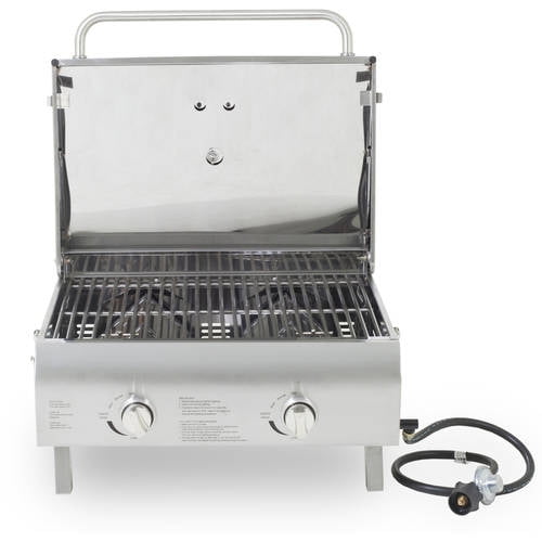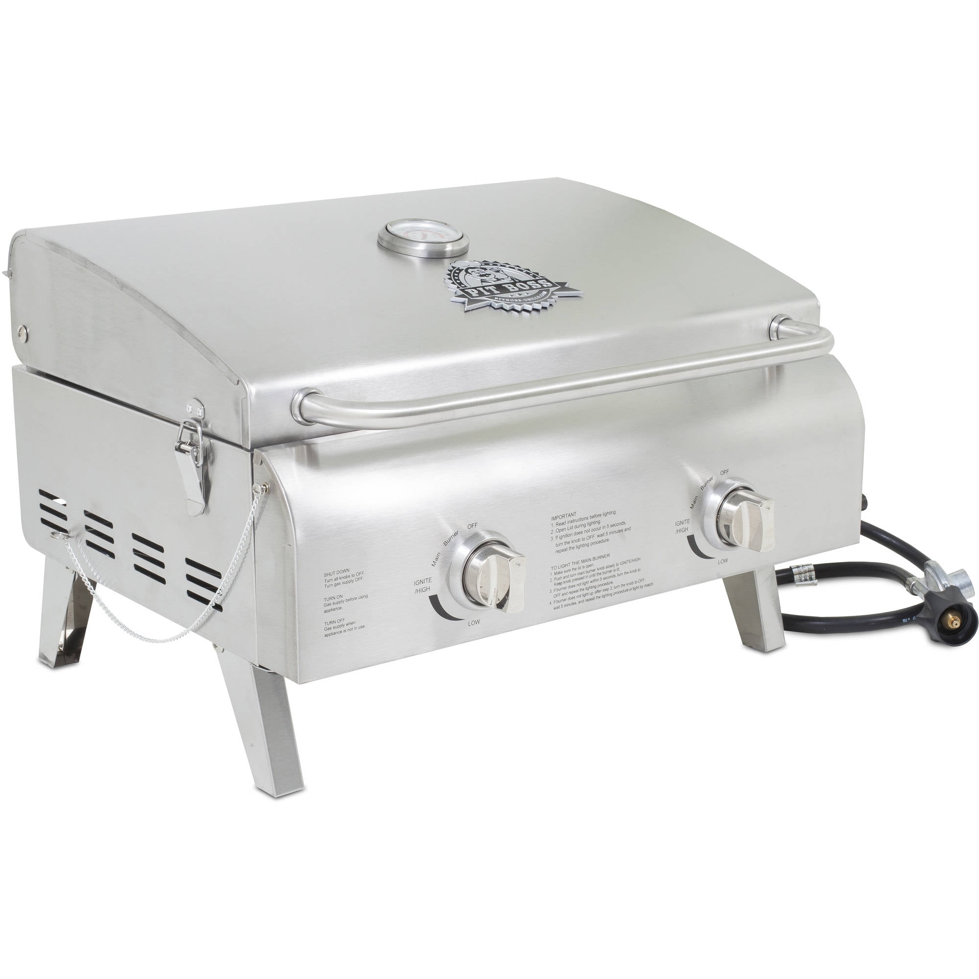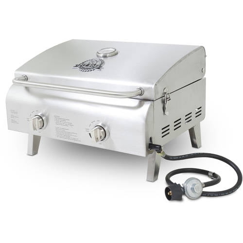 Pit Boss 2-Burner Portable Gas Grill, Pit Boss 2- Burner has a Stainless steel exterior. Features 275 sq in of cooking surface and 20,000 BTU 100 sq in warming rack included Pit Boss 2-Burner is fueled by propane This mobile unit offers 304 inches of stainless steel cooking grids Sleek design push and turn ignition ABS controls and a built-in dome thermometer Includes grilling essentials From Bigger, Hotter and Heavier Pit Boss Grills to the heavy-duty and reliable accessories, Pit Boss has you covered. Rust resistant Easy to clean and dishwasher safe