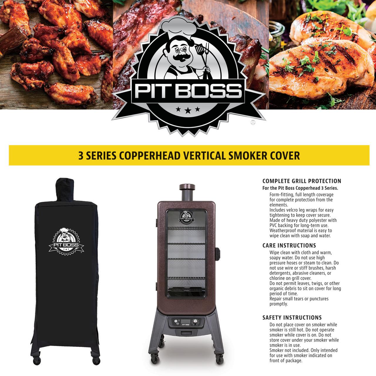 Custom-sized smoker cover Heavy-duty polyester and PVC backing Weather resistant Tailored design for perfect fit Convenient locking drawstring Large Pit Boss logo Velcro straps ensure secure fit Style: 73351