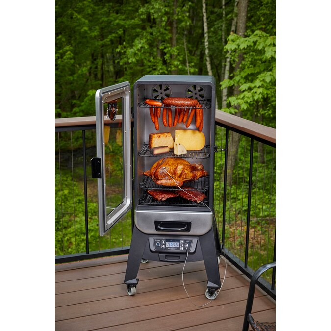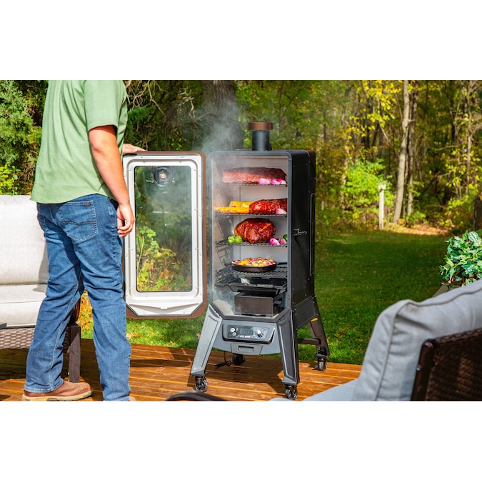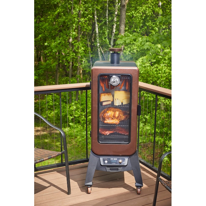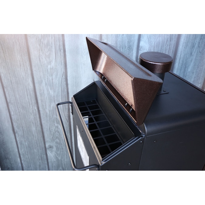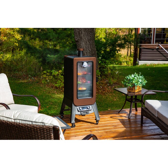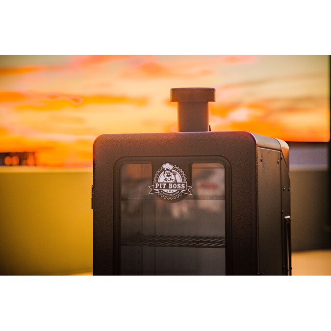 Innovation meets the outdoors with Pit Boss’ all new 3-Series Vertical Pellet Smoker. Never before has smoking been this versatile. The large front window eliminates the need for peek-a-boo cooking and its elevated frame makes transferring your meal from the smoker to the table a breeze. With the PB 3 Series Pellet Smoker there is no need to fret about cooking lengths. Its sleek design is not only unique, it is also functional. The Pit Boss 3 Series Pellet Smoker features 4 locking caster wheels, an easy to read digital controller and a stunning hammer tone copper finish. The multiple position racking system ensures you’ll have enough room to smoke anything your heart (or stomach) desires. Experience how Pit Boss is redefining the smoker industry in your own backyard today!