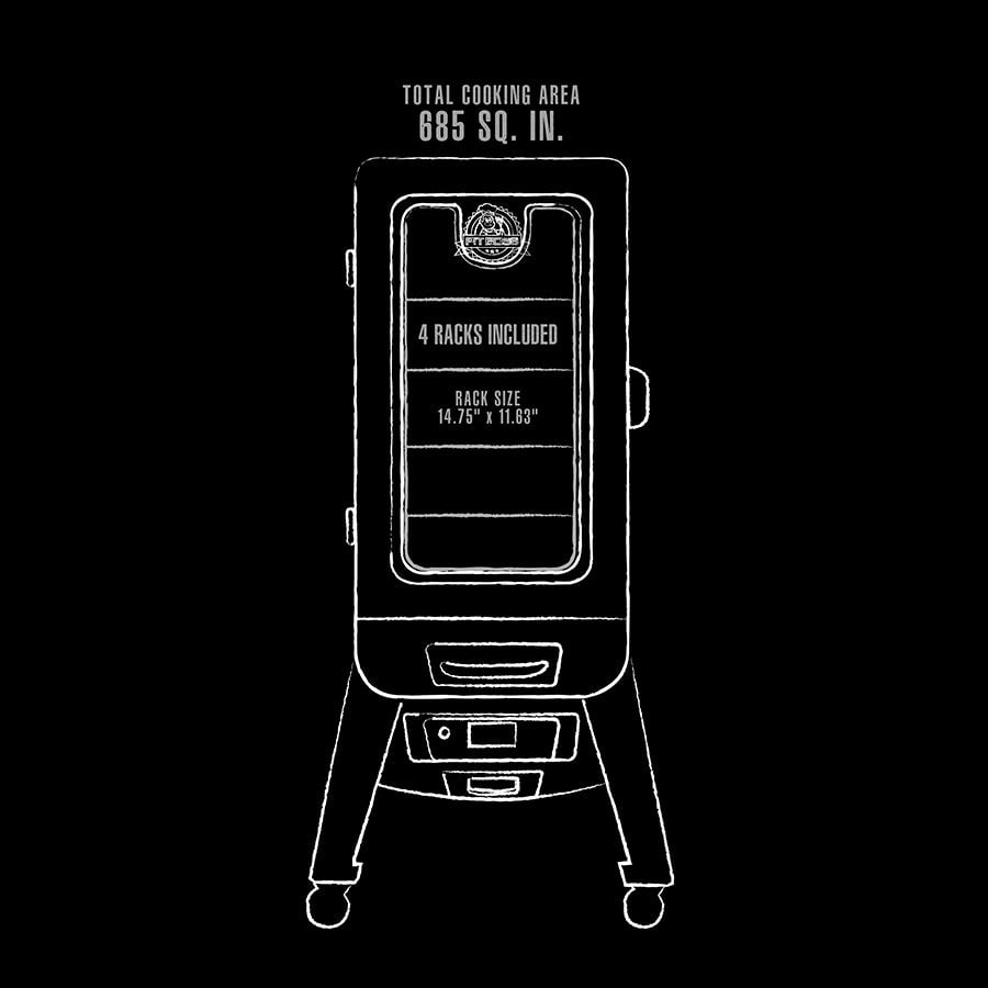 Pit Boss® 3-Series Digital Electric Smoker With 685 square inches of cooking area, there’s plenty of space to smoke all your favorite recipes – for all your favorite people Reach temperatures from 100°F – 350°F with the dial-in digital control board Features 4 porcelain-coated steel cooking racks measuring 14.75″ x 11.63″ each With a 1650 watt auto igniter and single stainless-steel element burn system, our burn technology makes your wildest recipe dreams come true Our grease management system consists of a simple, front access drawer for easy clean out 1 included meat probe, 4 caster wheels and an exterior access smoke tray Assembled Dimensions: 21.8”L x 20.2”W x 46.9”H Weight: 66.1 lb. Boxed Dimensions: 30.7”L x 19.3”W x 16.5”H Weight: 75 lb.