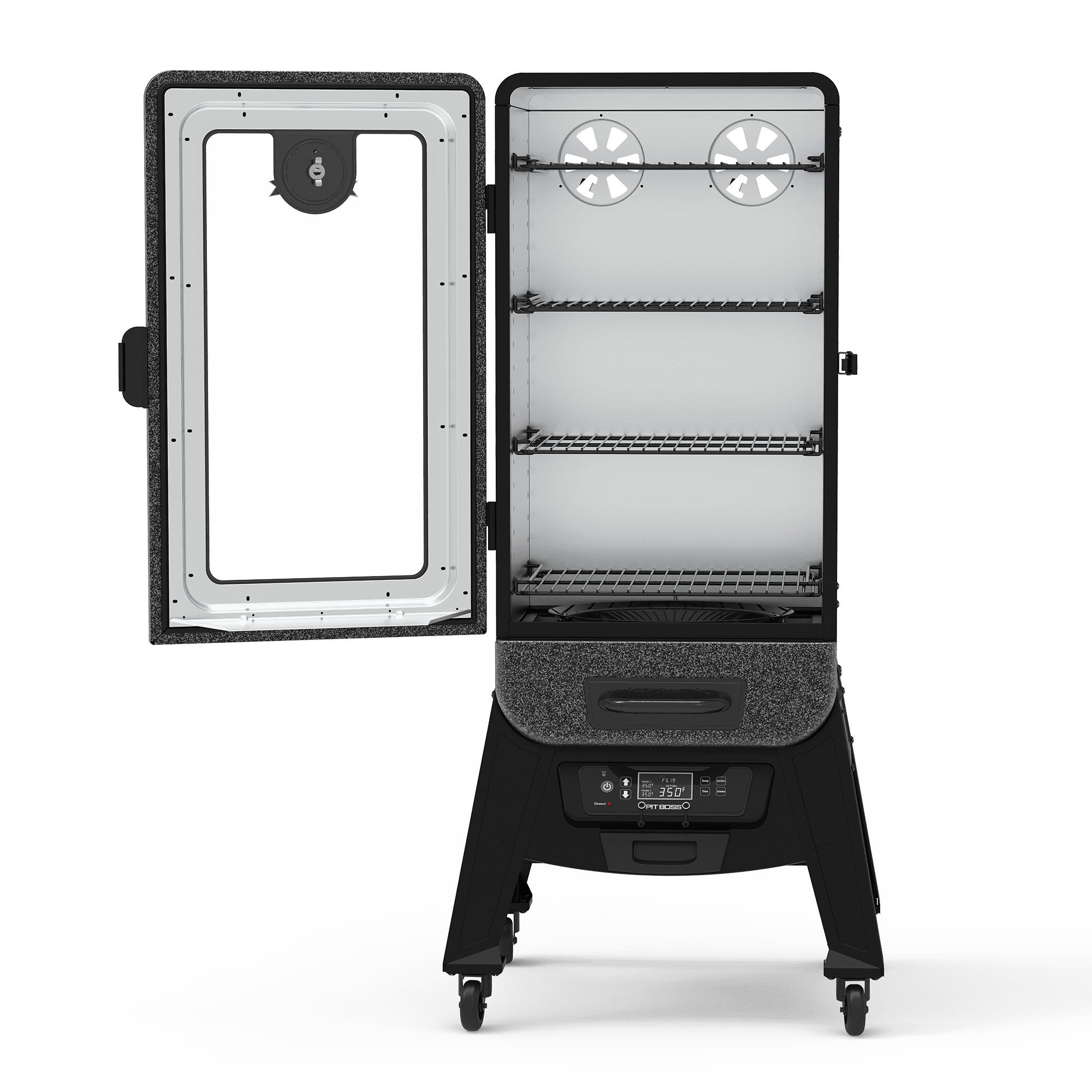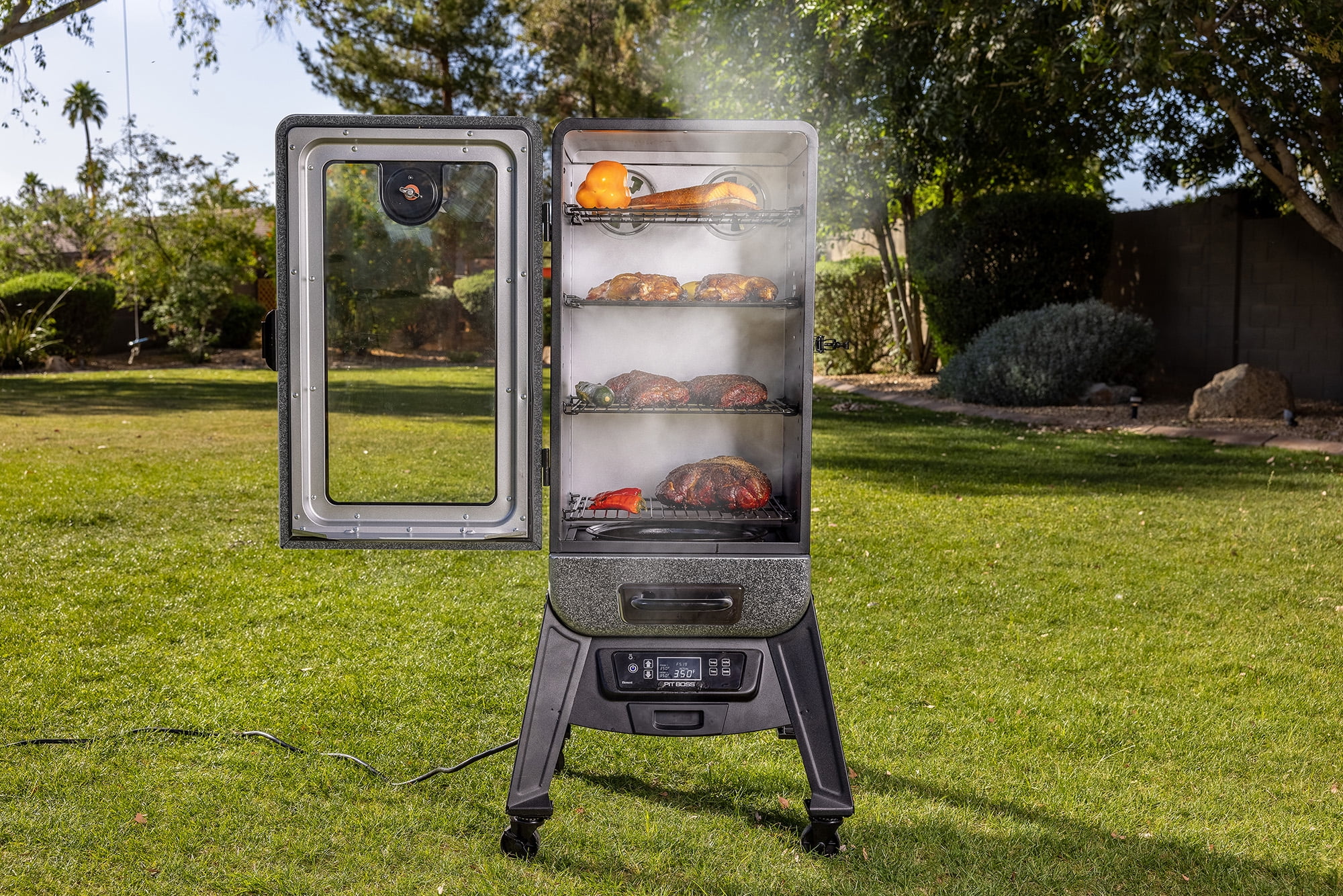There’s a new boss in town – introducing the Pit Boss® 3-Series Digital Electric Smoker. Gone are the days when your smoker was just another black box. The 1650-watt smoker features a large front window that eliminates the need for peek-a-boo cooking and an easy to read digital controller, with a stunning silver finish. Its innovative design improves upon the features of a classic smoker by incorporating a multiple position racking system that ensures you’ll have enough room to smoke anything your heart (or stomach) desires. The ability to infuse flavor into your smoker is easy with the oversized front load wood chip tray, offering up to 2 hours of cooking time per load. The superior ground up engineered design gives you the ability to reach higher highs and lower lows. The double walled blanket insulation lets you smoke from 100°F to temperatures reaching 350°F, unlike any other smoker on the market, and allows you to get the crispy skin on poultry or that great bark on beef and pork. The PBV3D1 is built to last with a durable, CRS high heat coating and features a high temperature door seal with a blanket insulated cooking chamber and our Pit Boss® best-in-class 5-year warranty.