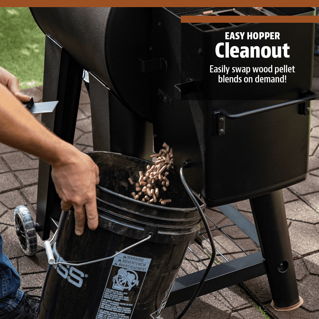 - The 15 lb. hopper holds enough pellets to cook low and slow, plus features a hopper cleanout door for easy access