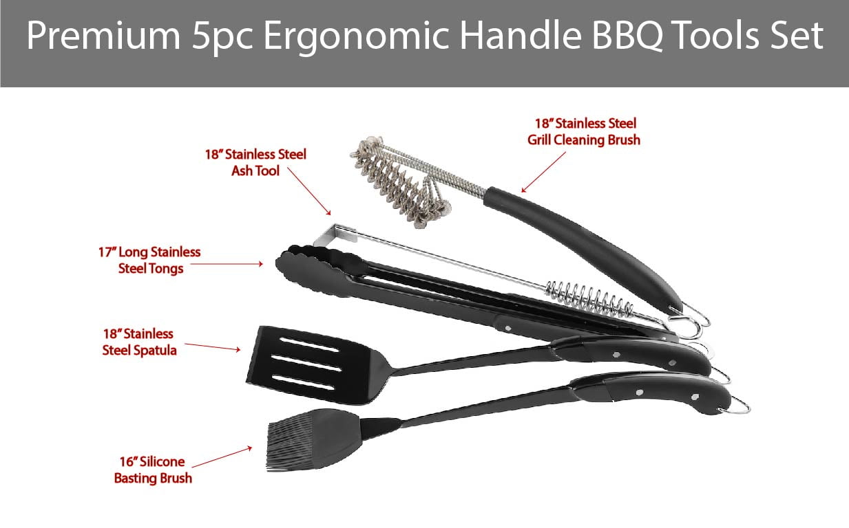 PitMaster King 5pc Silicon Ergonomic Handle Grill Cook & Clean Set with Spatula, Tongs, Basting Brush, Cleaning Tools