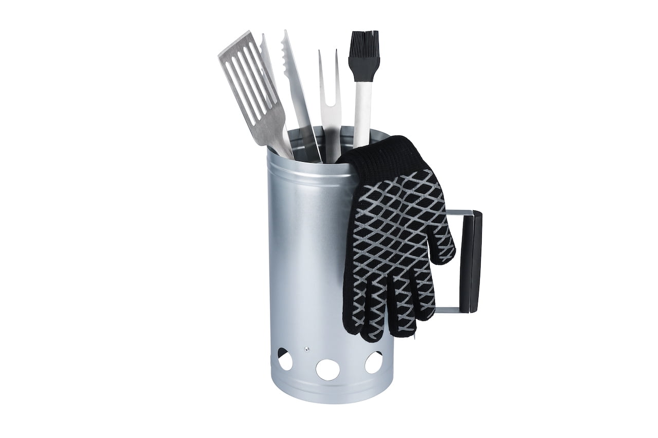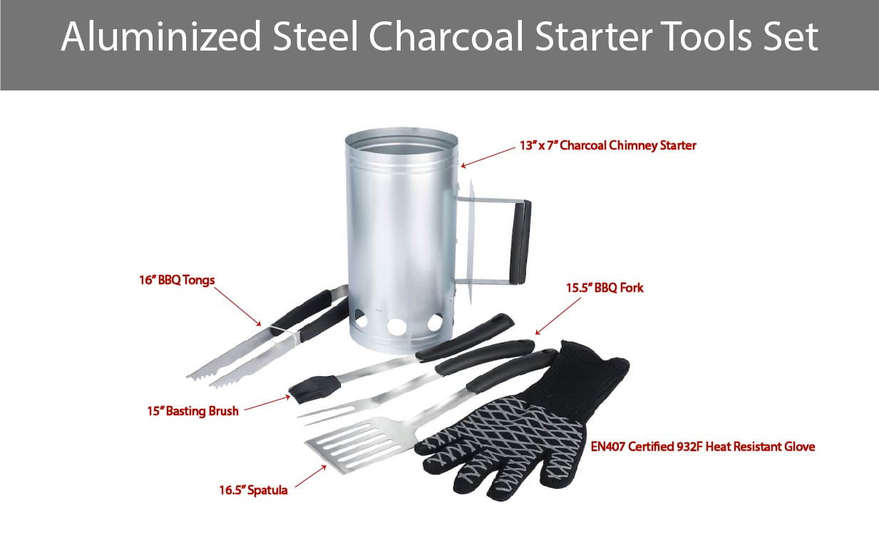 PitMaster King Steel Charcoal Chimney 6pc Value Set with Spatula, Basting Brush, BBQ Fork, Tongs and EN407 Certified 932F Heat Resistant Glove
