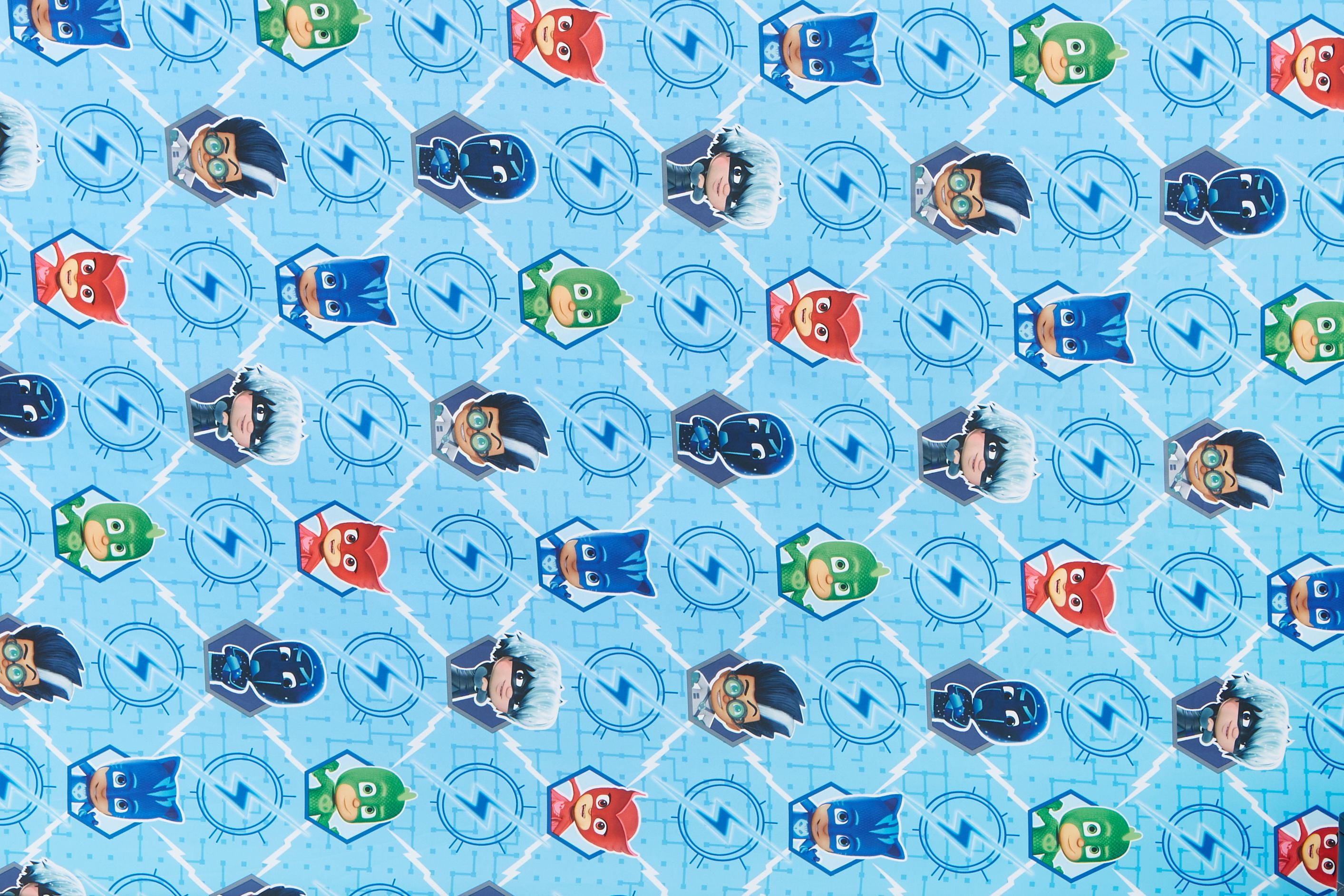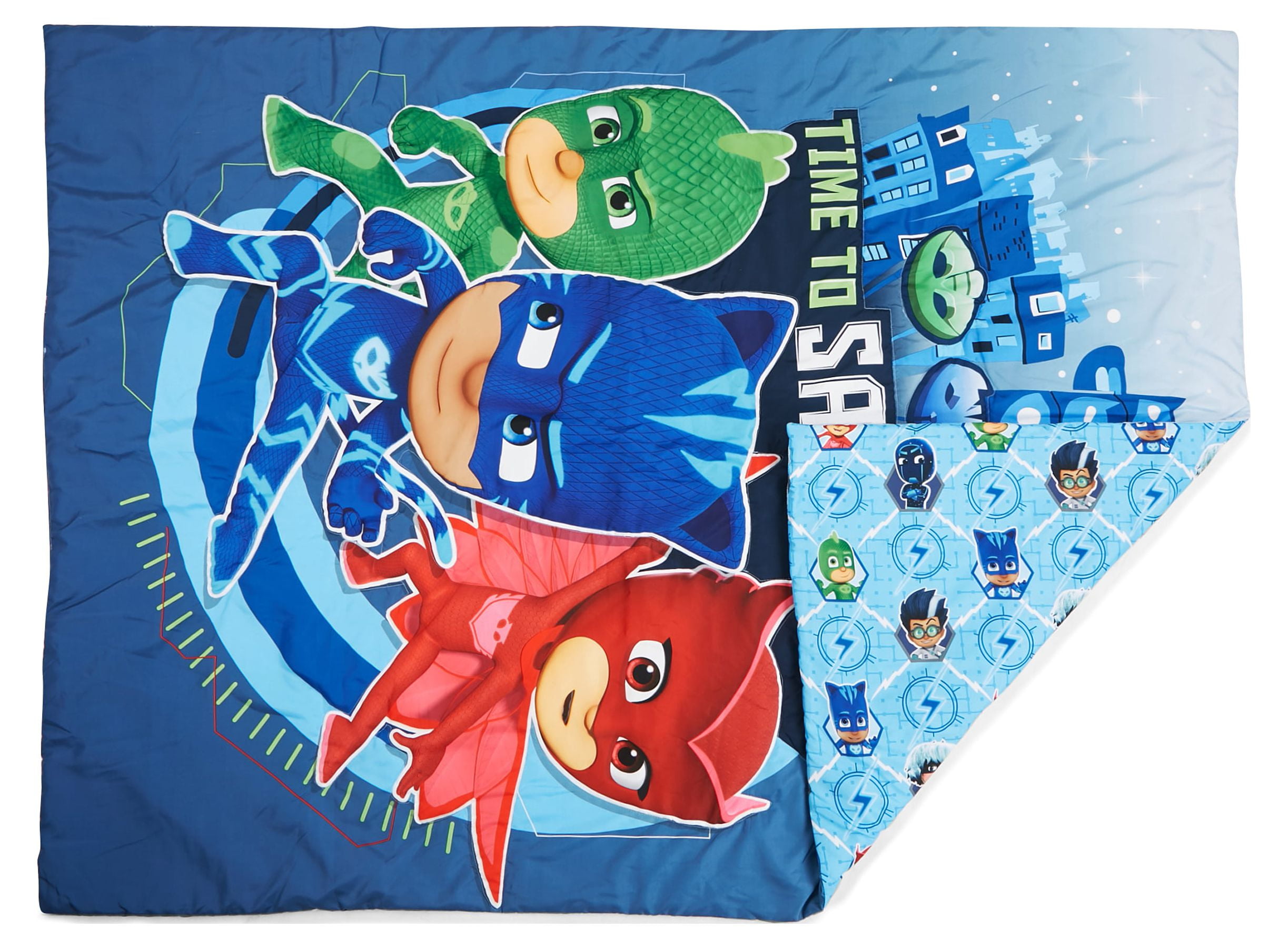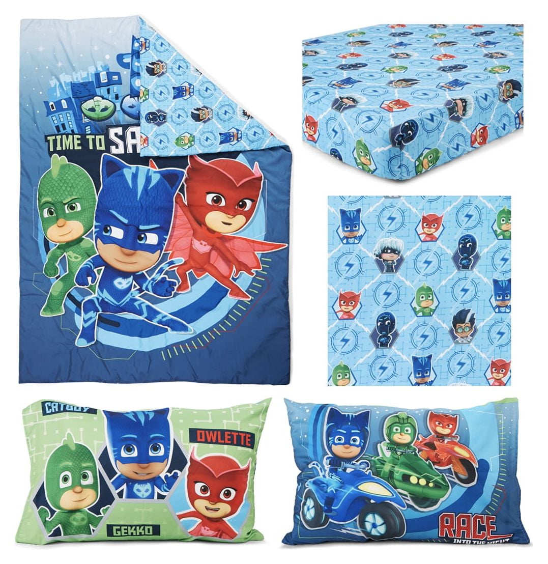PJ Masks 4-piece toddler bed set, sure to excite your child Machine Washable 100% Polyester Microfiber Reversible Bedspread featuring your favorite PJ Masks Characters 58″ x 42″ Fitted Sheet with Allover character print 28″ x 52″ Allover Print Flat Sheet 60″ x 45″ 2 Side Print Pillow Case 20″ x 28