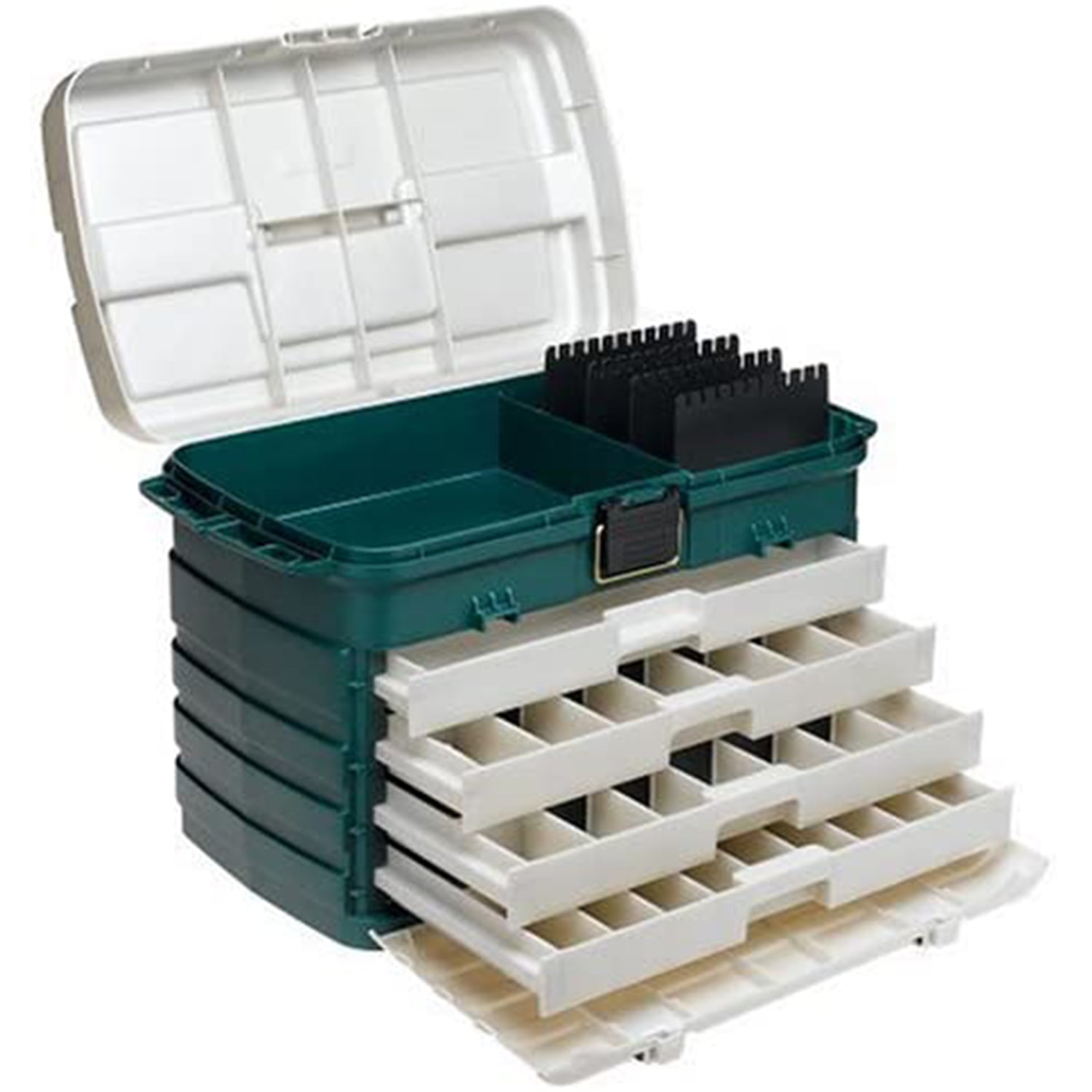 Plano Fishing Four-Drawer Tackle Box: Four Drawer System Large Bulk Storage Four Removable Bait Racks Side Tool Storage Ultra-versatile system Features quick and easy access to all your gear