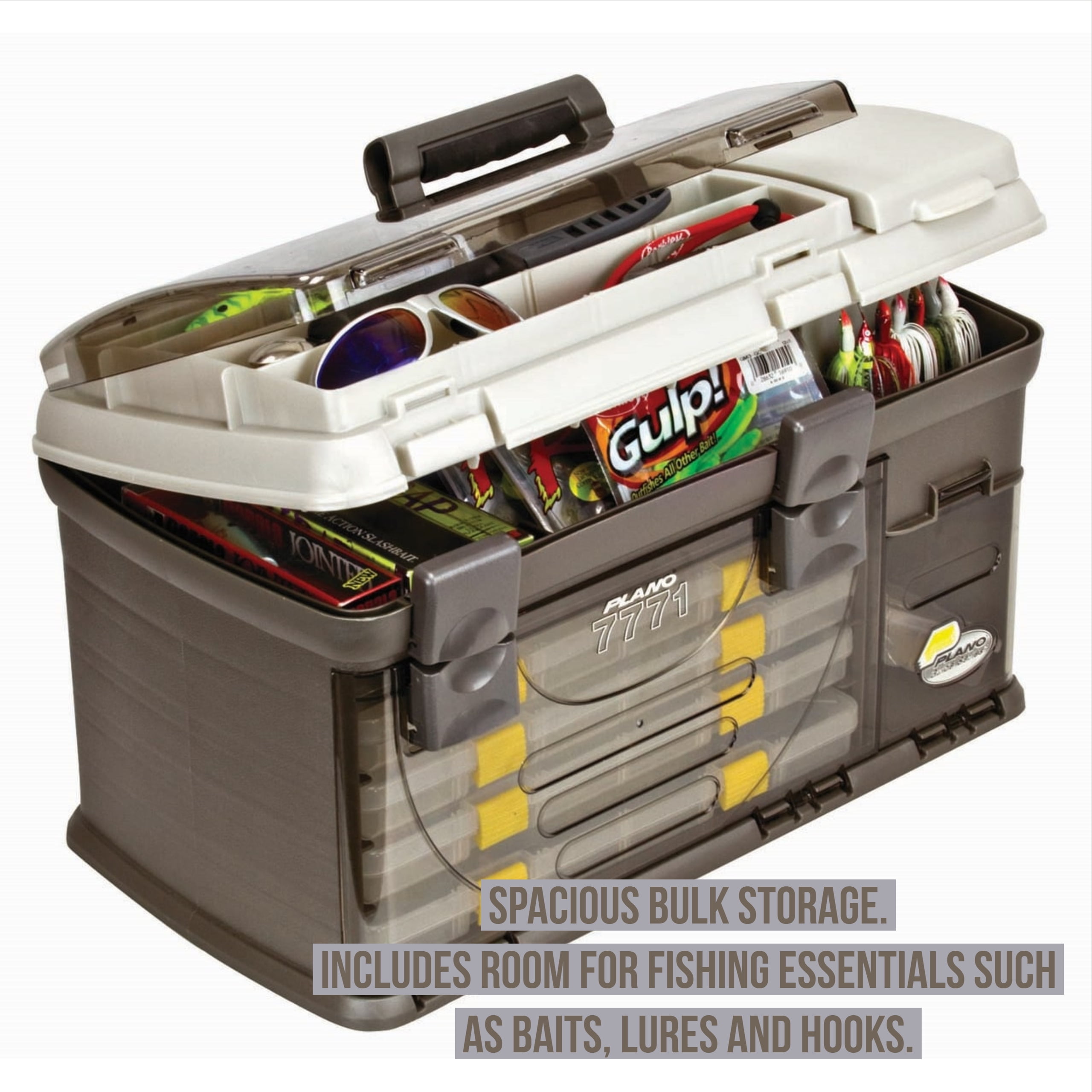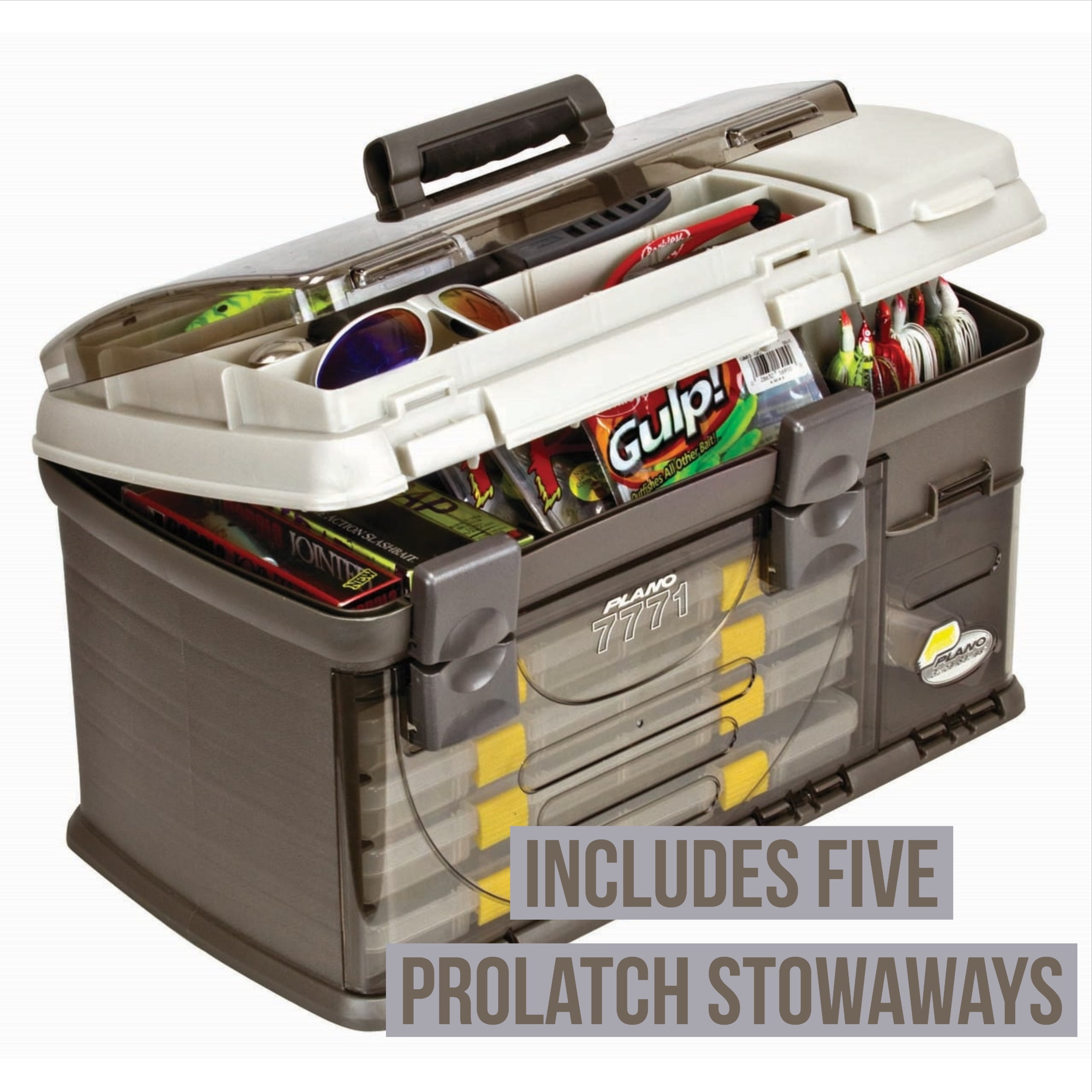 Plano Guide Series Five Utility Pro System Tackle Box is built to store it all. This Plano Tackle in Graphite/Sandstone includes five ProLatch StowAways, three top-access removable spinnerbait racks, and spacious bulk storage beneath the lid. Organization and storage has never been easier with all the different options this Plano Tackle Box gives. The top-access to the Plano Storage Tackle Box includes room for fishing essentials such as baits, lures and hooks and is covered by the clear DuraView cover for easy viewing of contents. This Plano Tackle Systems in Graphite/Sandstone features a comfort-grip, over-molded handle that is great for carrying to any fishing spot. Bring along this Plano Tackle Box Guide Series Pro System with five utilities to provide great organization on your fishing trips.