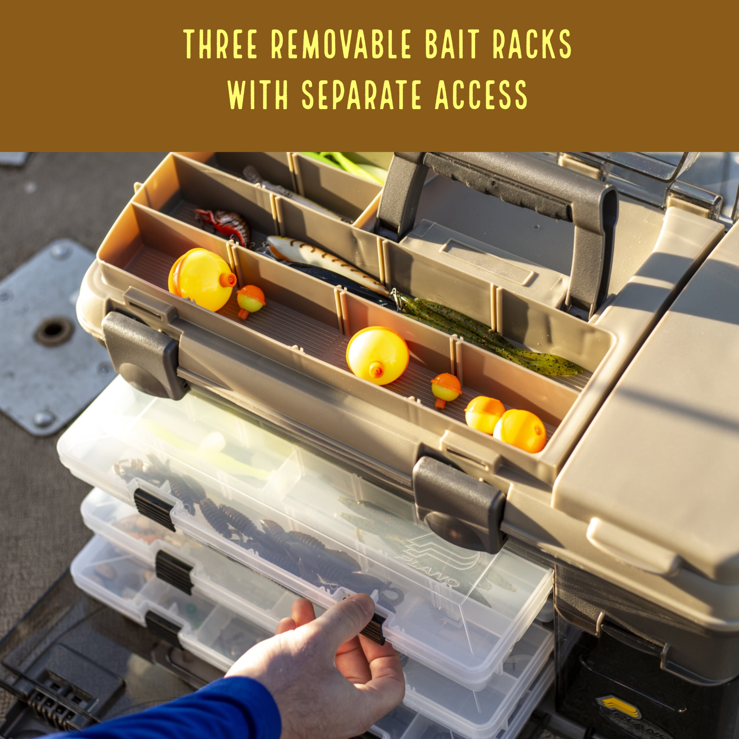 Plano Guide Series Pro System with Five Utilities, Graphite/Sandstone: Large tackle box Features 3 trays with 29-39 adjustable compartments In-lid storage for fishing essentials 3 top-access removable spinnerbait racks Spacious bulk storage Comfort-grip, over-molded handle for easy transport Clear DuraView covers ProLatch closures Dimensions: 21.25″L x 12″W x 12″H