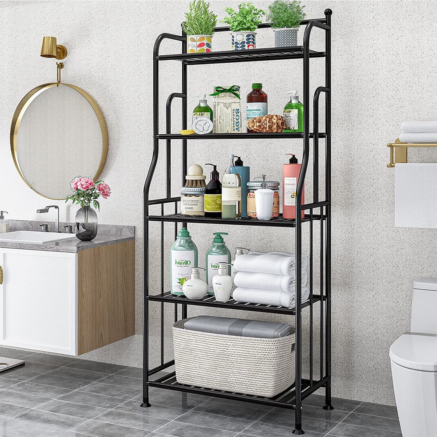 【Elegant Plant Stand】 : Our storage shelf are carefully processed with premium iron, strengthen anti-rust pipe, which are more sturdy and have strong load-bearing performance. 4 adjustable foot pads at the bottom, can effectively protect your floor from scratches and keep it stable on uneven ground. 【Large Capacity】: Perfect size for a small space, five shelves can achieve maximum storage. Upper shelf is very suitable for placing plants, and lower shelf can be used to store towel, kitchen utensil, shoe, book or whatever you need. 【Versatility】: Metal flower pots holder can complement different home decoration styles. Whether in the living room, bathroom, bedroom, kitchen, pantry, office, it is very versatile. 【Easy to Assemble】: You don’t need to worry about installation problems, corresponding parts and detailed installation instructions are included to help you complete the assembly faster. 【Intimate Design】: Sleek ball on the top prevents the round tube from scratching, and at the same time it will not scratch your hands. The guardrails on both sides provide favourable protection for your belongings, is an ideal choice for home storage. Metal Storage Shelf Planter Display Rack Tier: 5 Color: Black Material: High Quality Iron Measure: 21.7″L x 11″ Wx 52.4″ H
