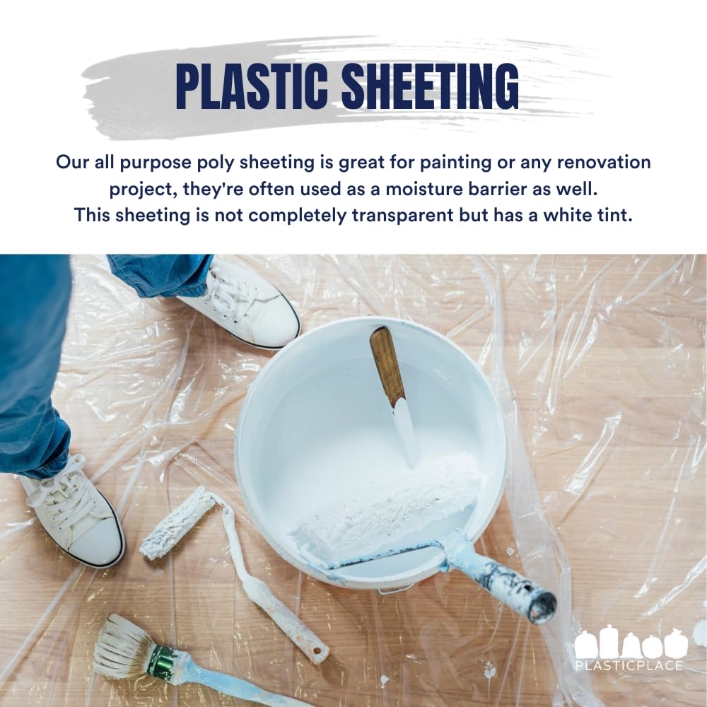 This versatile 4 Mil clear plastic sheeting is perfect for painting, renovation projects, or as a moisture barrier. The 10’W x 100’H roll is durable, tear-resistant, and provides reliable protection. The sheeting is not fully transparent but has a white tint, adding strength while maintaining flexibility. Ideal for construction, DIY projects, or weather protection, this plastic sheeting offers quality and convenience for any application.