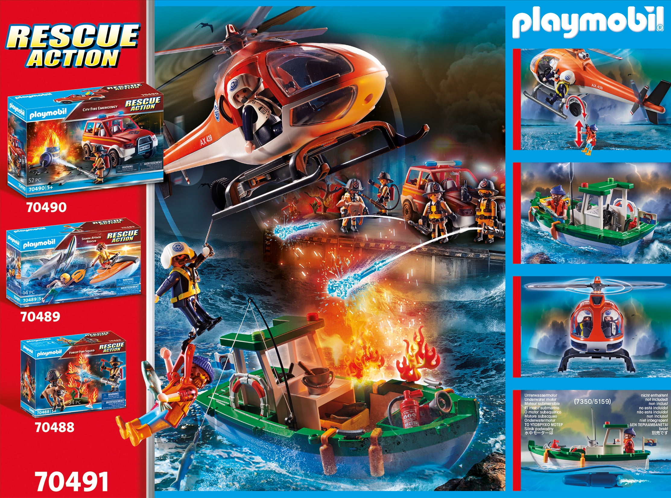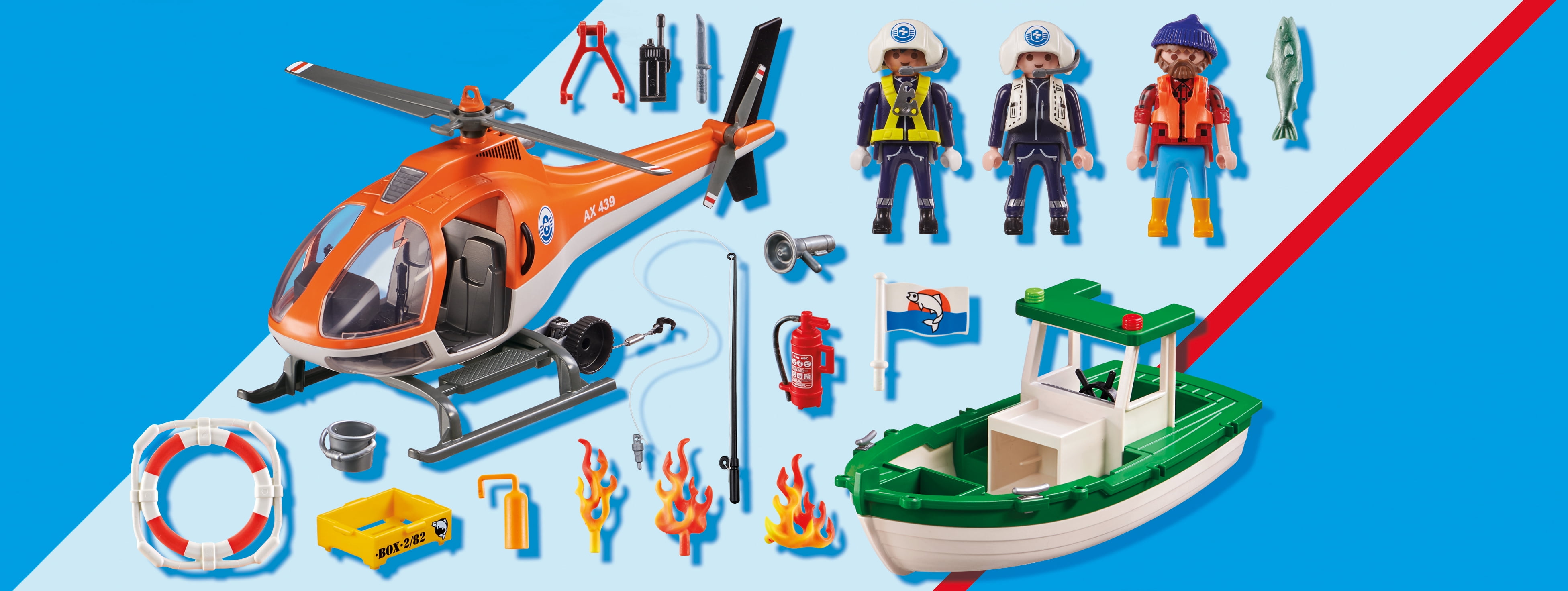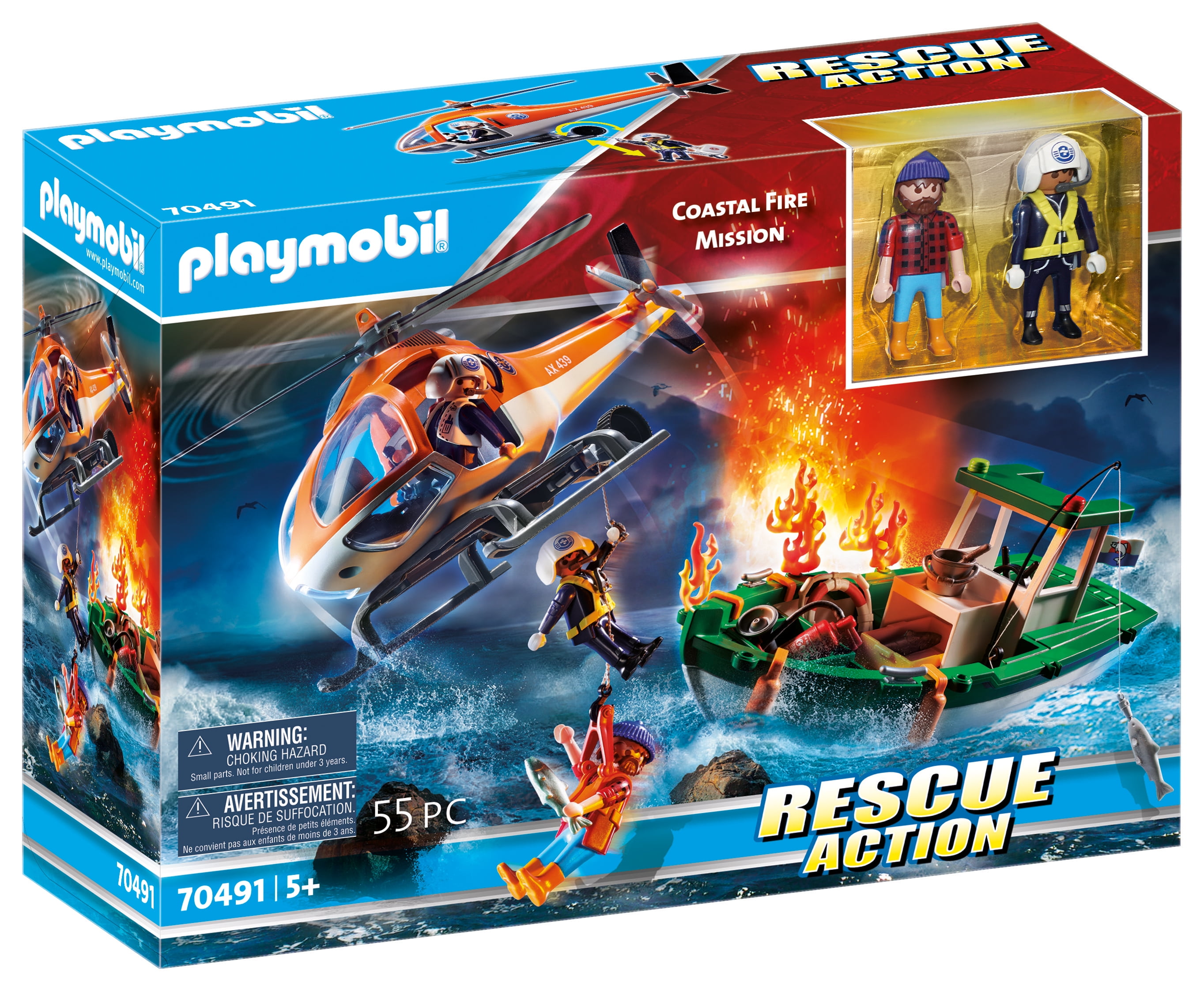 SOS! There’s a Coastal Fire Mission in progress to extinguish the boat fire and save the captain The fisherman’s boat is ablaze, so the helicopter hovers overhead and the firefighter uses the rope winch to descend down to the boat Once the captain is safely secured in the rescue harness, the helicopter speeds away from the danger zone Set includes three figures, helicopter, rescue gear, floating fishing boat, fishing equipment, flames, fish, and many other accessories Recommended for ages six years and up