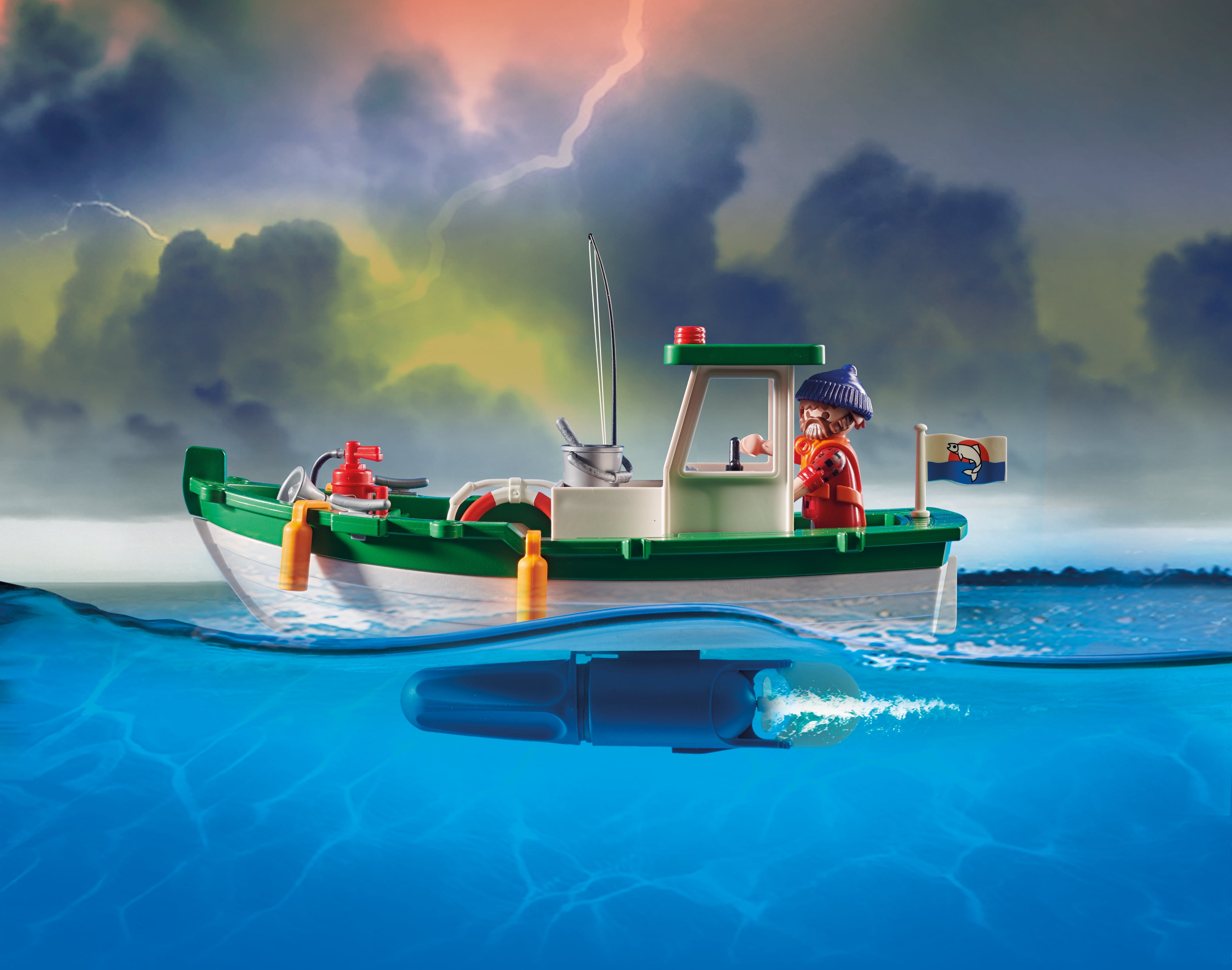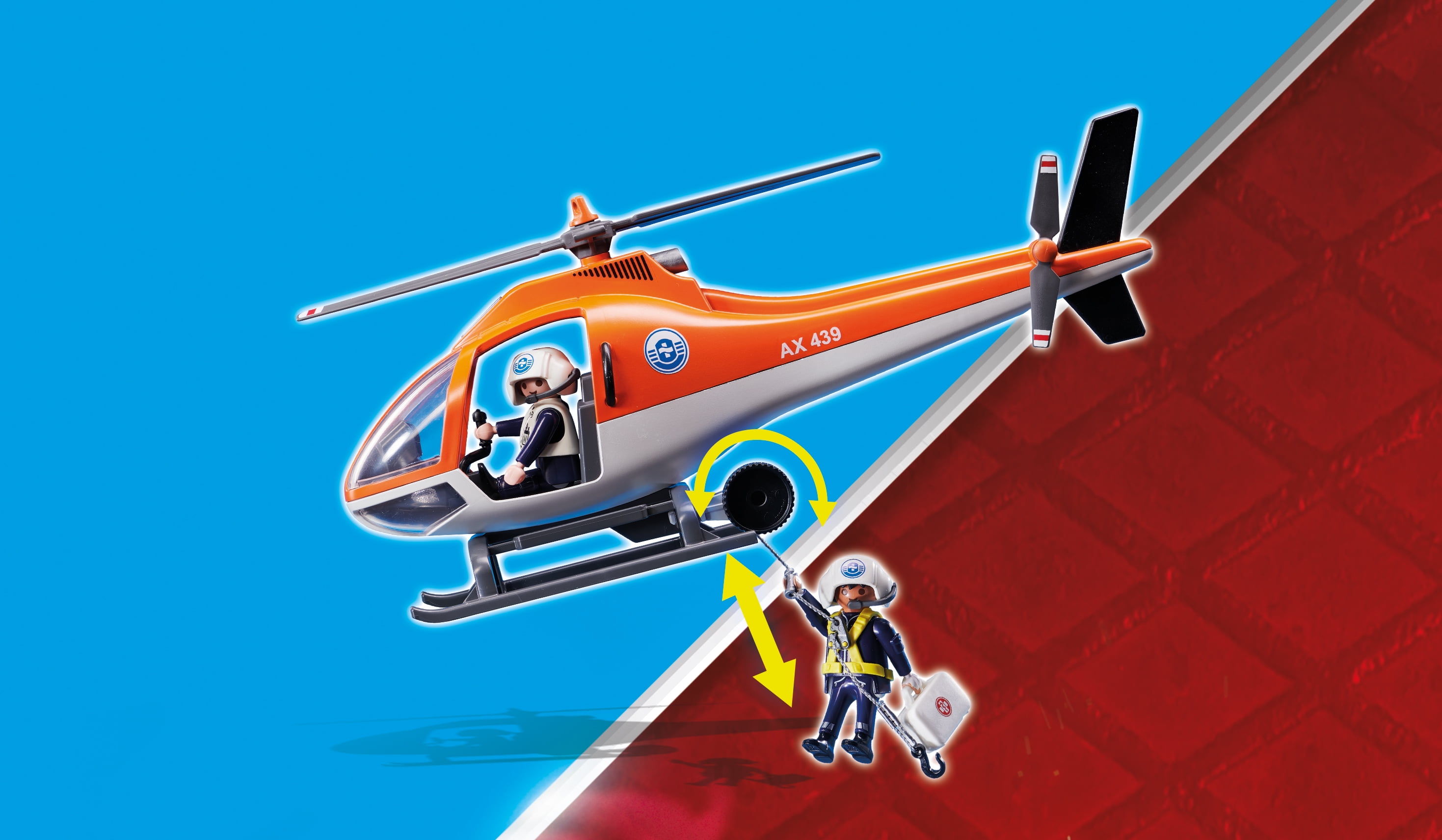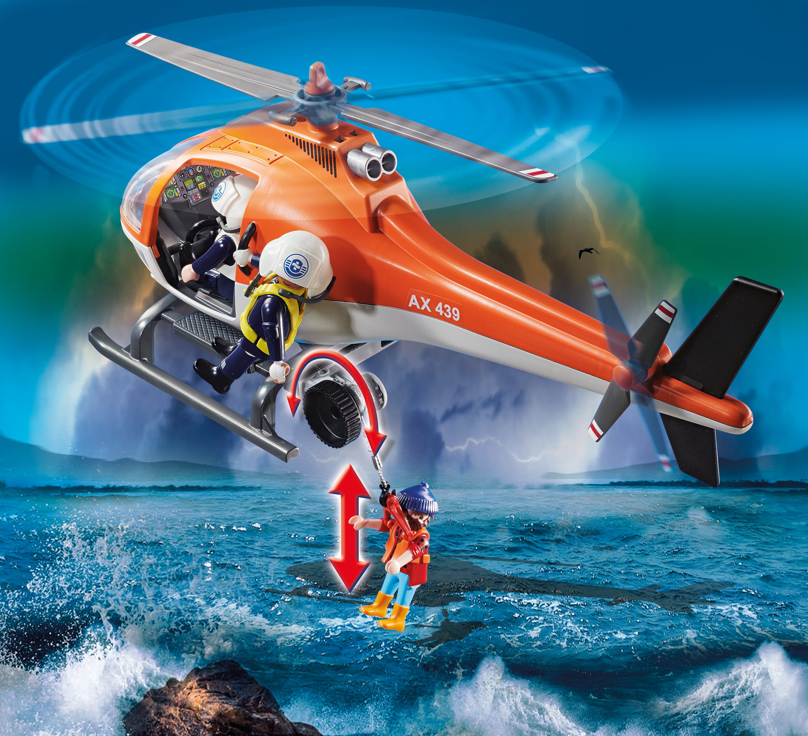SOS! There’s a Coastal Fire Mission in progress to extinguish the boat fire and save the captain The fisherman’s boat is ablaze, so the helicopter hovers overhead and the firefighter uses the rope winch to descend down to the boat Once the captain is safely secured in the rescue harness, the helicopter speeds away from the danger zone Set includes three figures, helicopter, rescue gear, floating fishing boat, fishing equipment, flames, fish, and many other accessories Recommended for ages six years and up