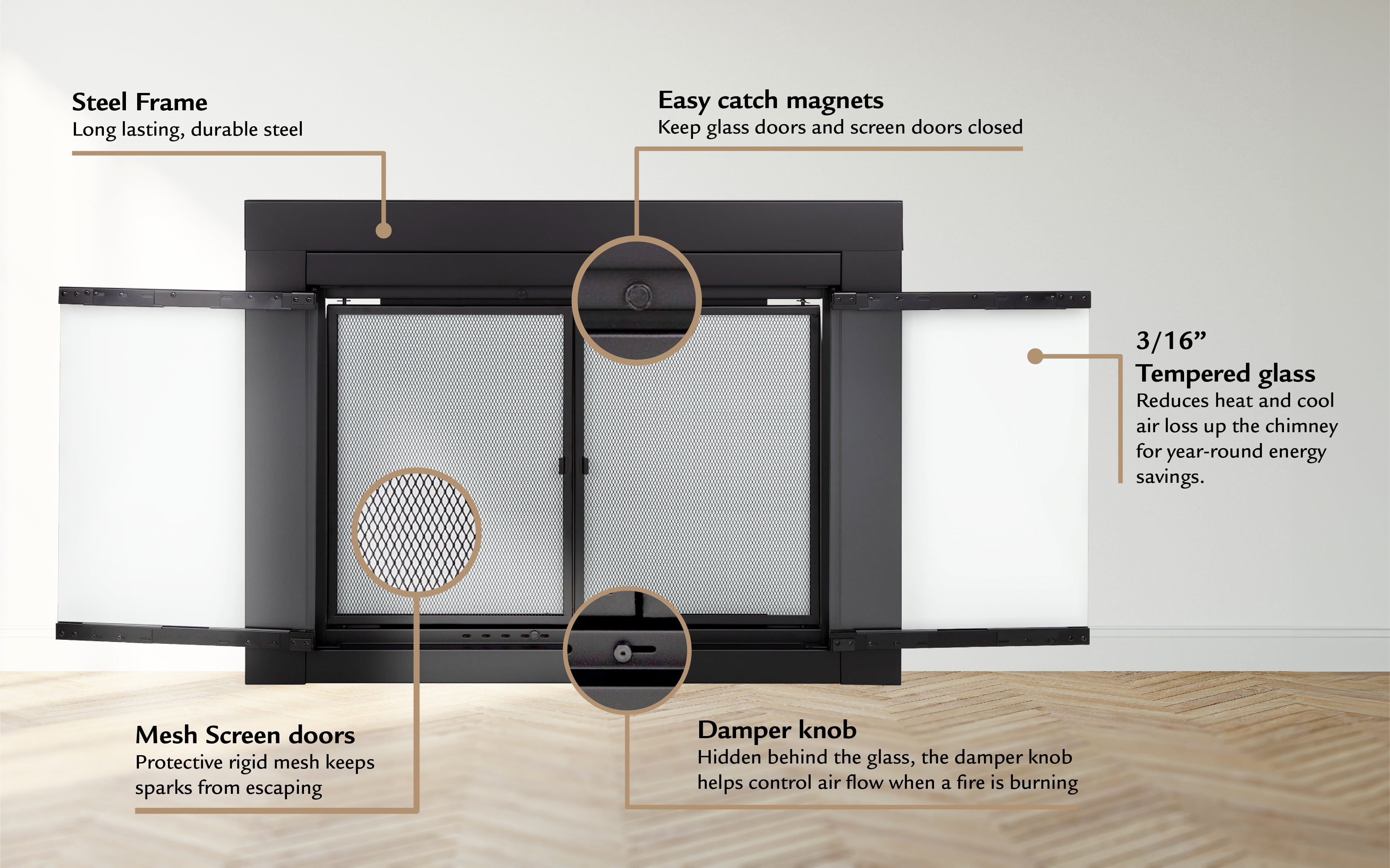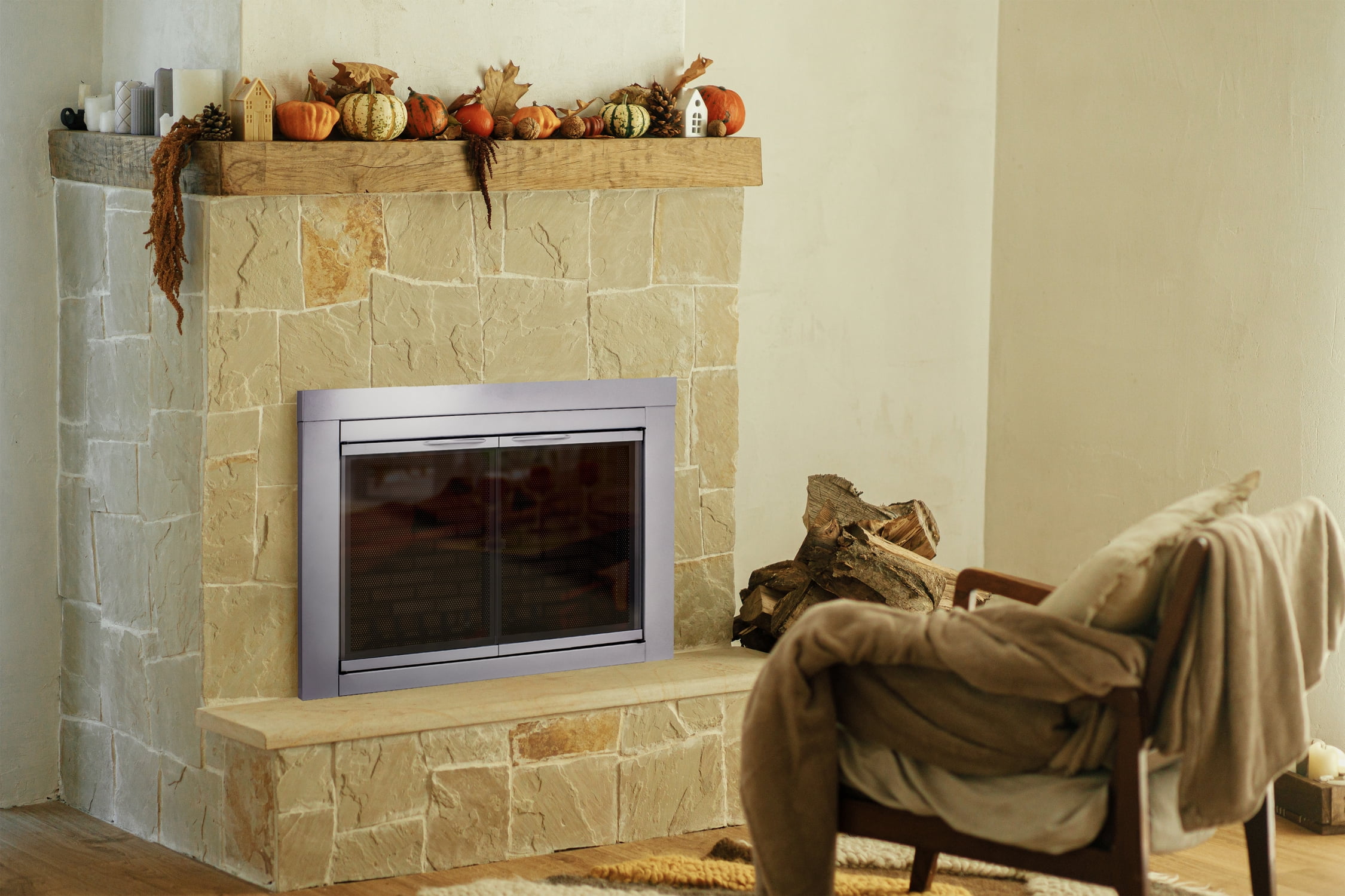 Boasting a classic aesthetic, the Pleasant Hearth Alpine Fireplace Glass Door Collection is a beautiful, skyline nickel, cabinet style, one-piece frame. When installed, the fireplace glass door enhances the appearance of your family’s indoor, wood-burning, traditional masonry fireplace hearth. All Pleasant Hearth Fireplace Glass Door sets are designed for masonry fireplaces only and are not compatible with prefabricated fireplaces – see our Sizing Guide for more details. When it’s time to unwind from the day, this glass door set opens completely, providing a clear view of your burning fire. The clear 3/16-in tempered glass doors must stay open while the fire is burning, and the built-in mesh firescreen panels act as a barrier to help contain embers. Both the glass doors and mesh panels have easy-catch magnets to help keep them closed. The glass doors can help you save energy year-round – when closed, they prevent AC and heat loss through the chimney by up to 90%. The hidden damper knob at the bottom of the firescreen provides additional air flow to feed the fire for bigger, longer-lasting flames. Closed fireplace glass door sets also prevent cold chimney downdrafts from entering your home and keep pets and children out of fireplace soot. These fireplace glass doors are surface mounted flat against the fire place opening, allowing the doors to open fully to provide an incredible view of your fire from anywhere in the room. Pleasant Hearth has guided instructions on how to install your new fireplace glass doors in both the Product Manual and Installation Video.