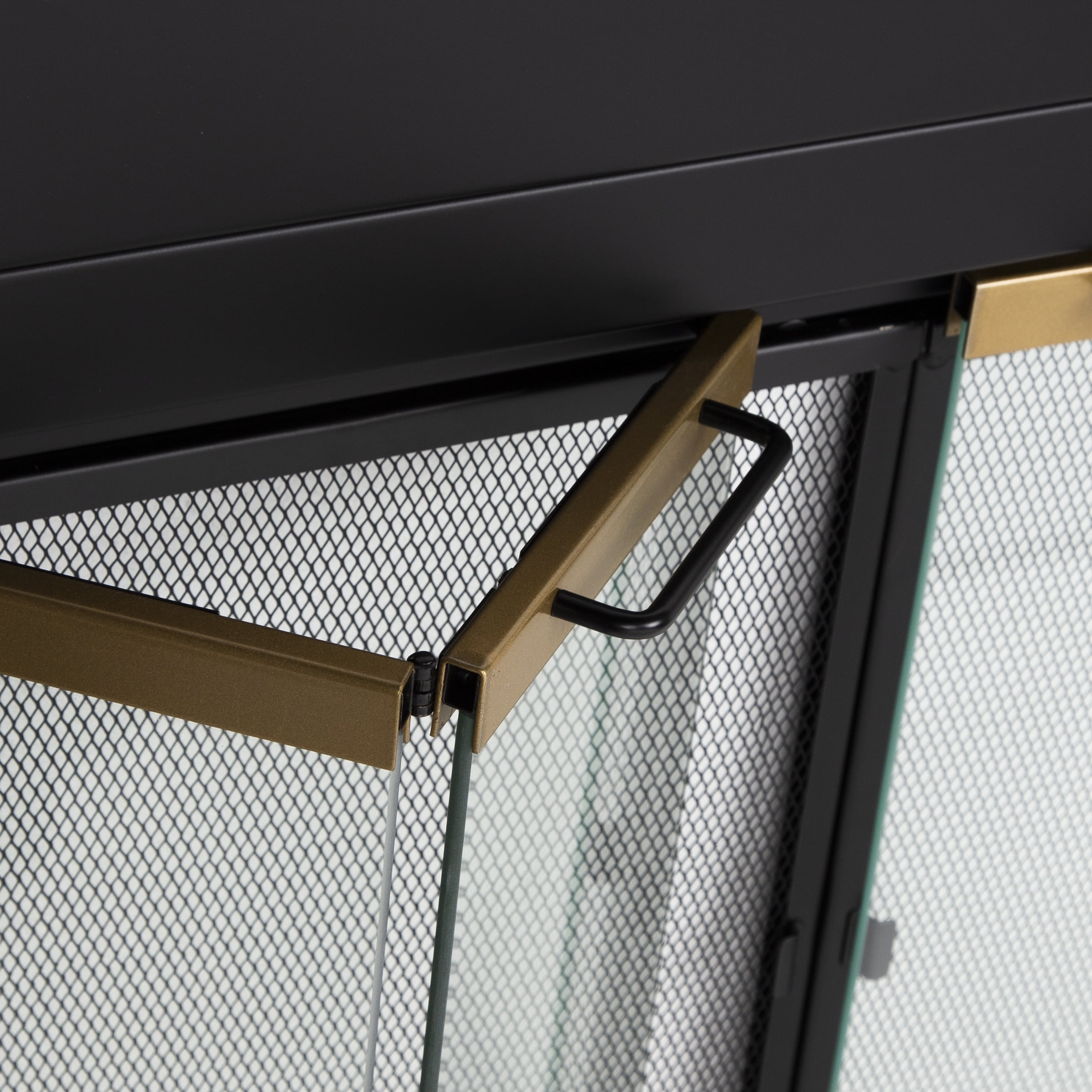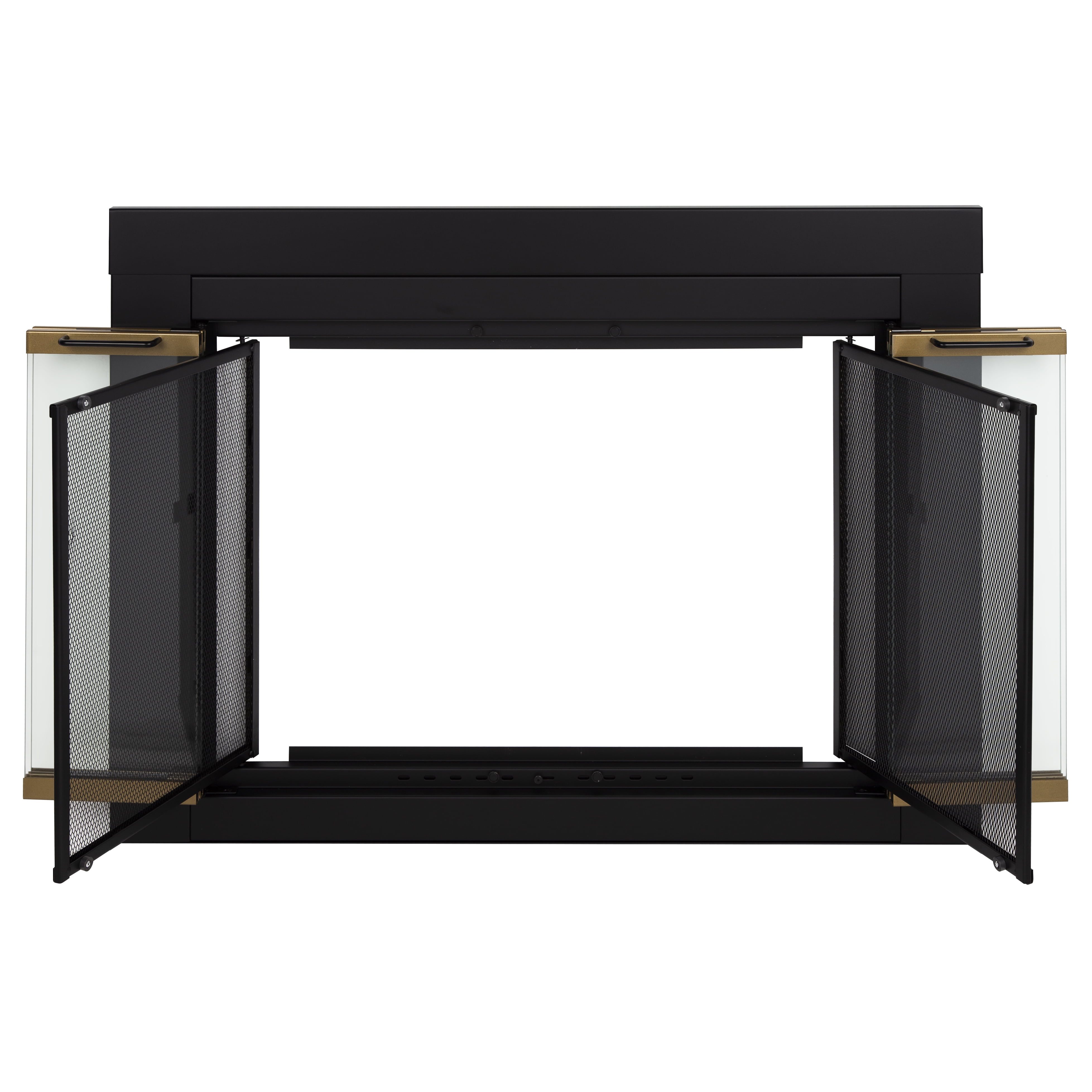 Black finish with moonlight gold trim Bifold style doors 1″ gold frame 2 handles on frame Clear glass panels Rigid mesh fire screen panels Small fireplace doors help reduce heat and cool air loss Magnetic Mesh door catch Doors open completely for full view of fireplace Reduce heat or cool air loss by 90 percent Bi-Fold, track-free doors with mesh panels Clear .1875-inch tempered safety glass High-heat powder coat black finish with gold trim Doors open completely for full-view Installs in 3 easy steps Available in large, medium, and small size options