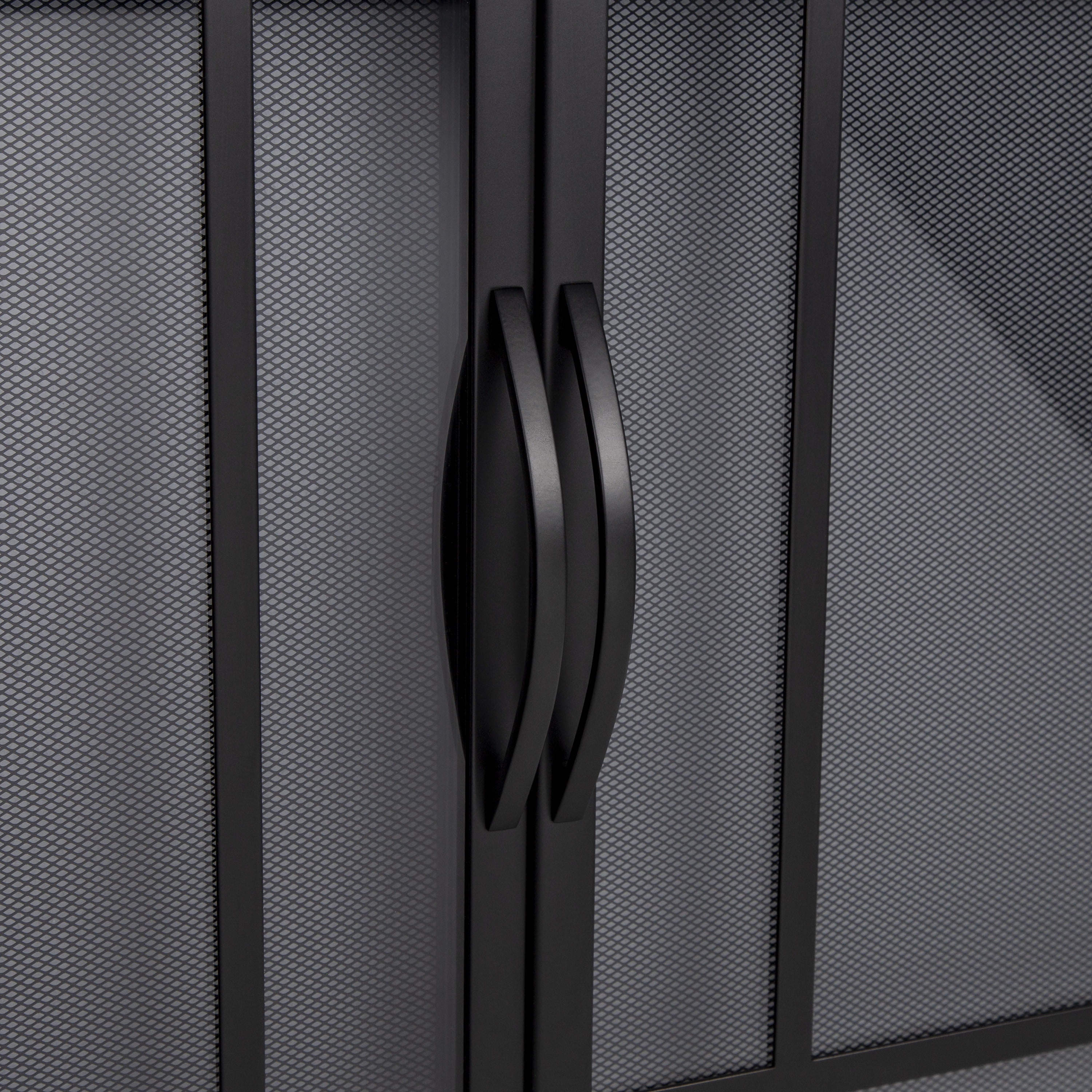 Reduce heat or cool air loss by 90 percent Cabinet-style doors with mesh panels 9-panel smoked .1875-inch tempered safety glass High-heat powder coat black finish Doors open completely for full-view Installs in 3 easy steps Available in large, medium, and small size options