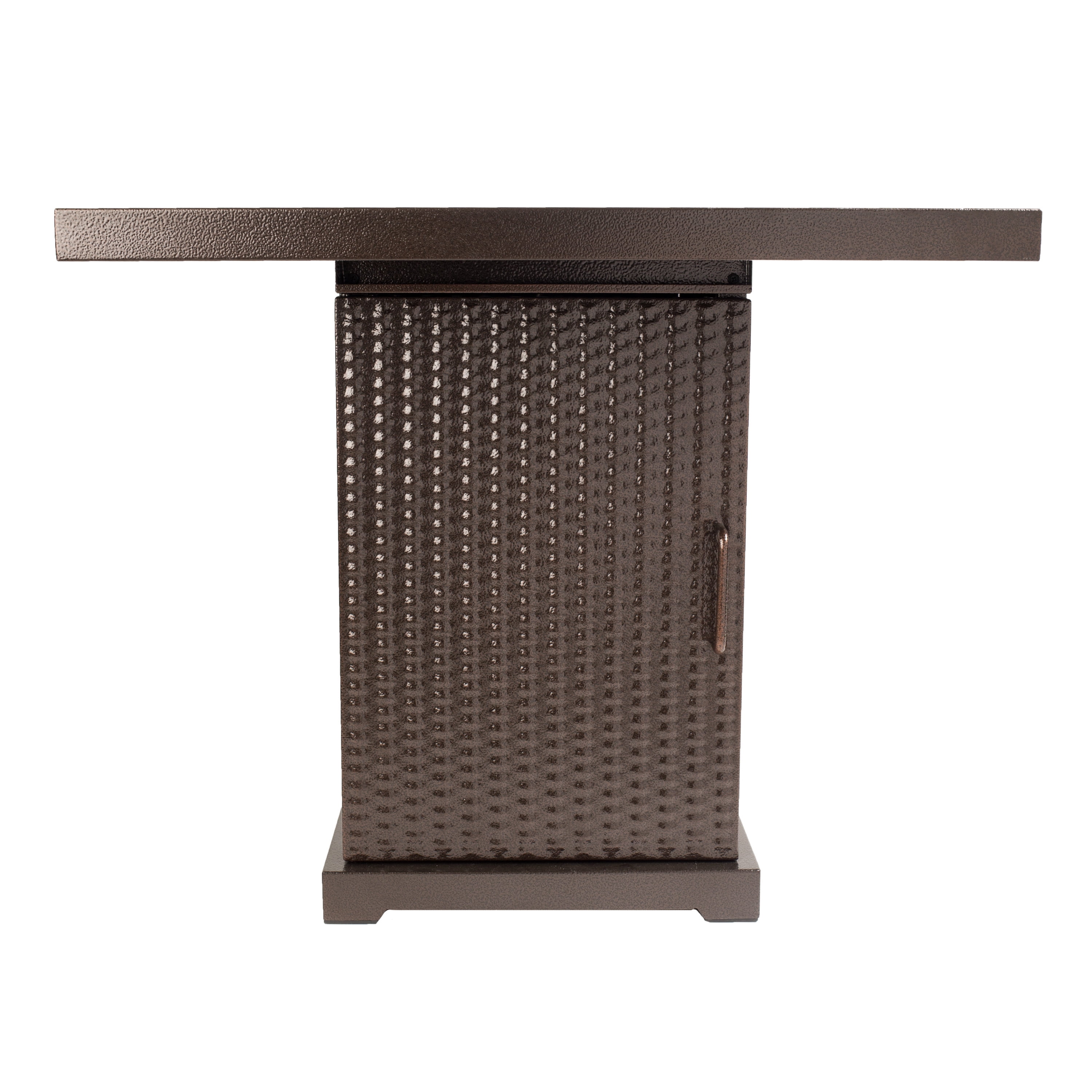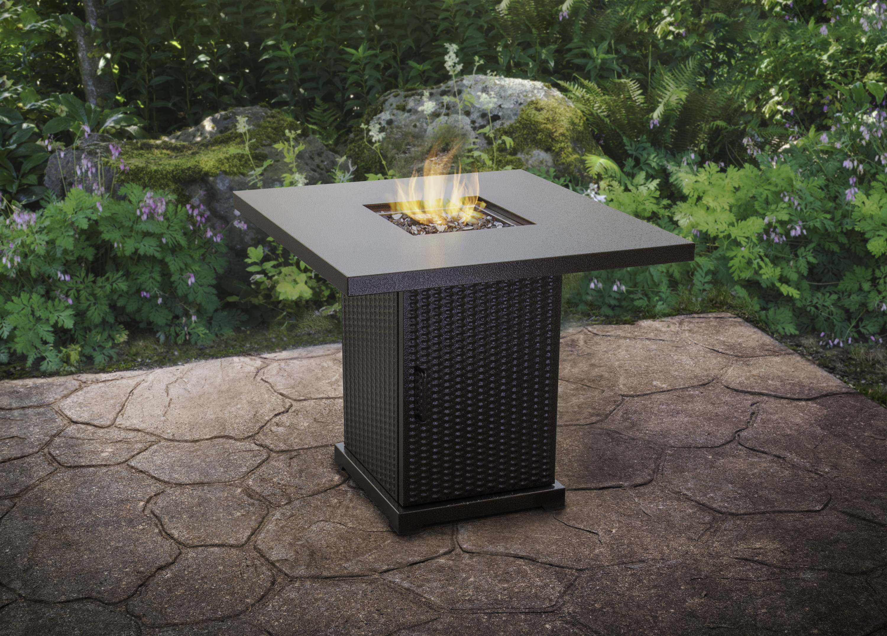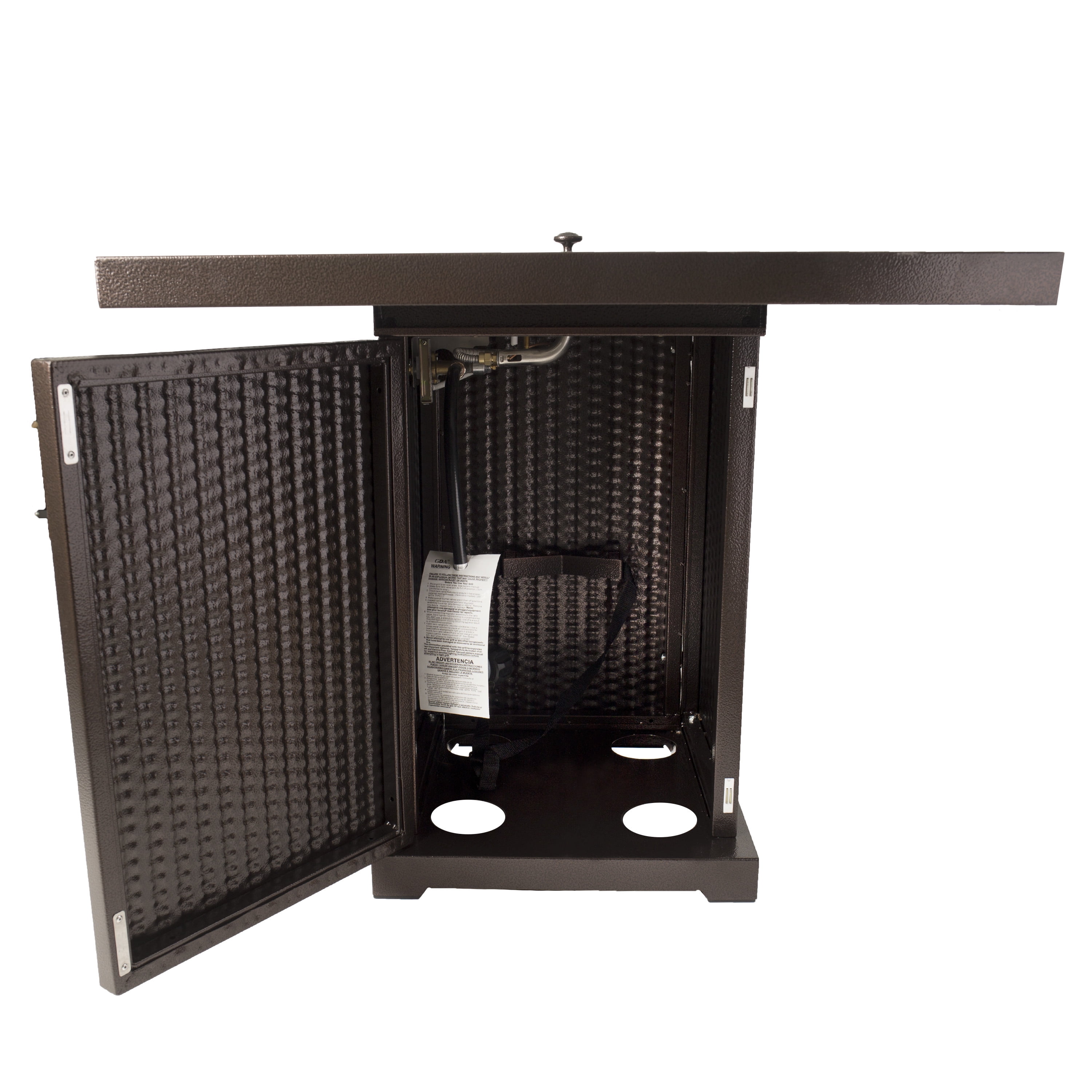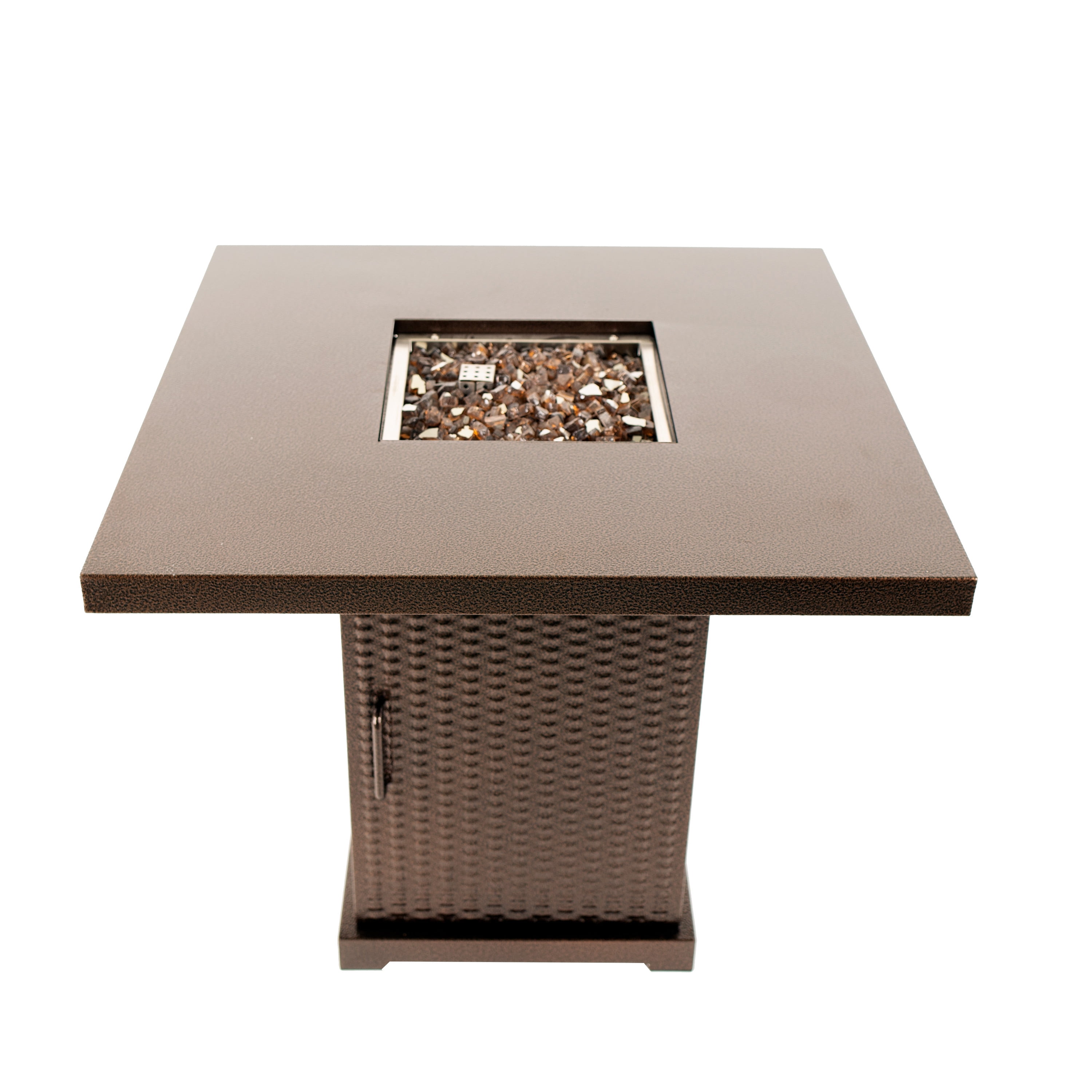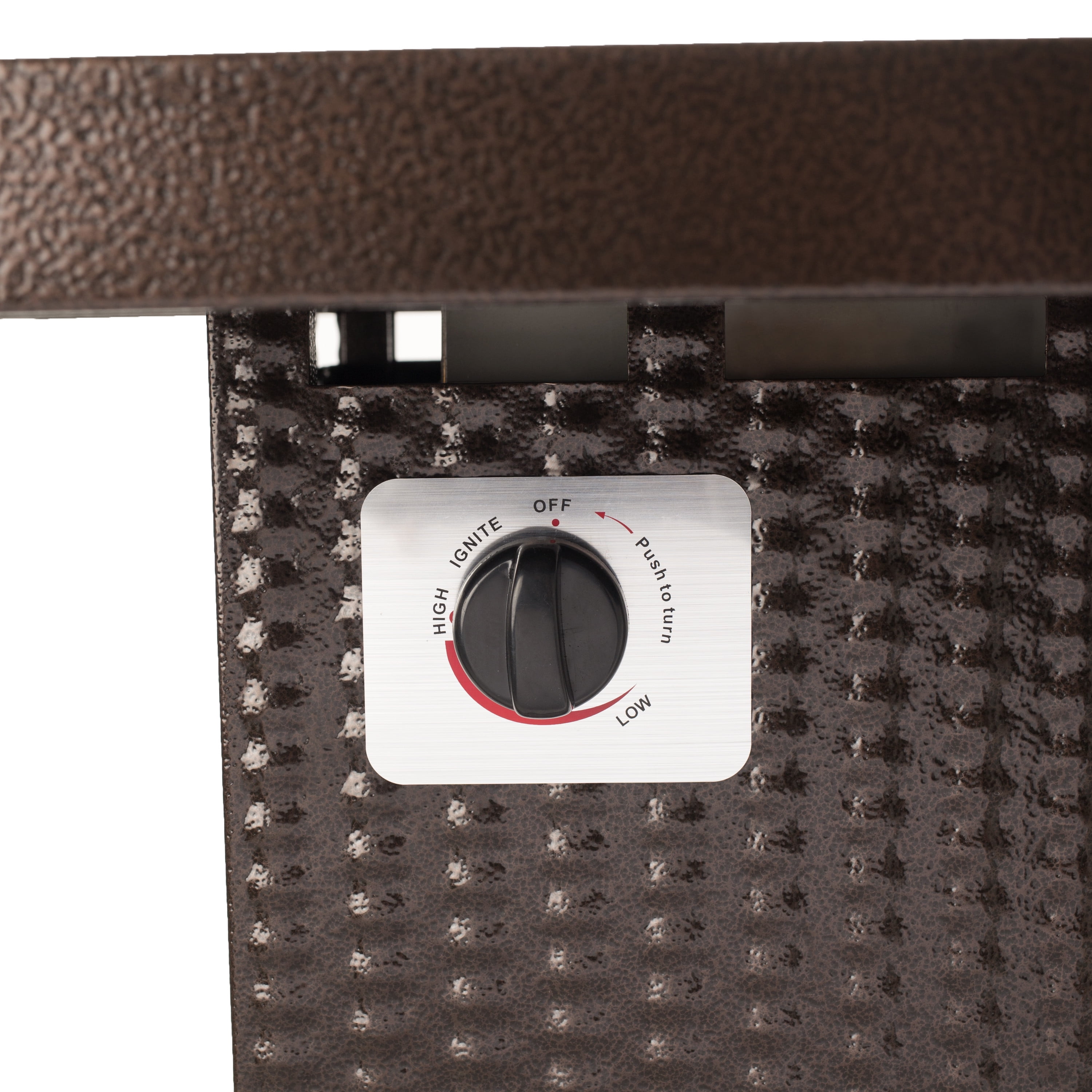 Variable flame settings up to a maximum 40,000 BTU Piezo ignition ignites at the turn of a knob Table lid converts pit to occasional table Hinged door accesses the propane tank Stainless steel burner for longer life Amber Glass Rock
