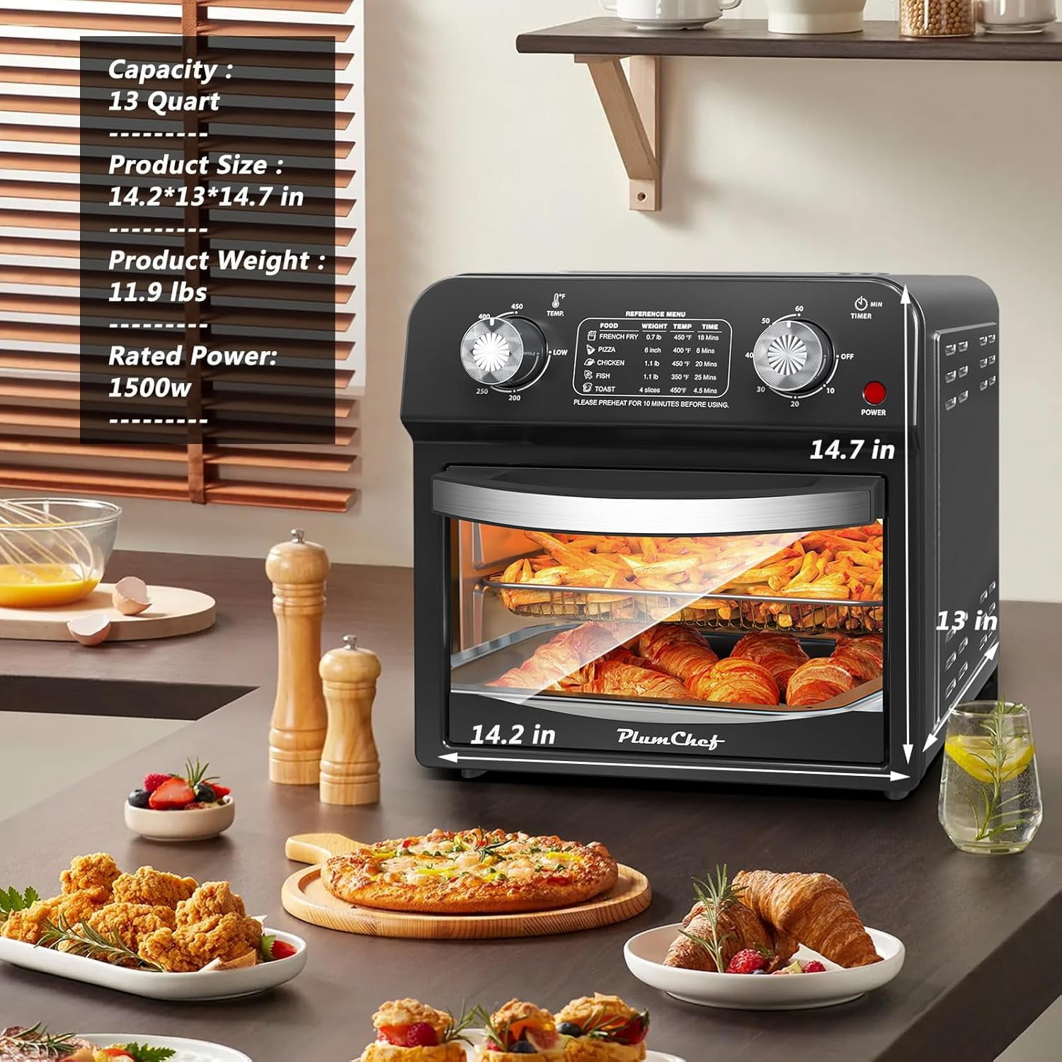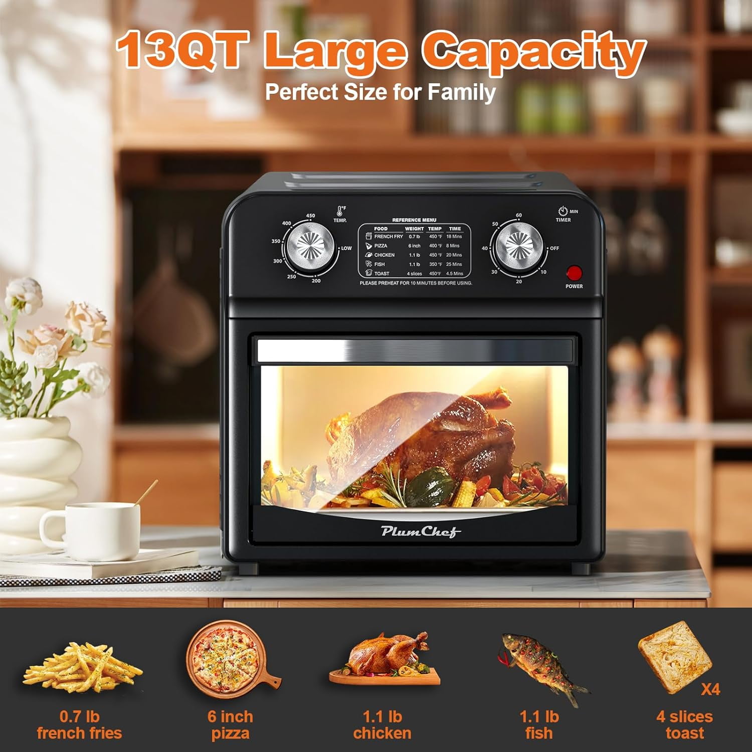 Air fry your food for a healthier fried version 13QT Large Capacity Air fryer 2 rotary knobs for setting temperature, timer 360° hot air circulation removes excess oil from food 1500 Watts power make your food more crispy and delicious Precise temperature control, excellent baking results 0-60 minutes timer 0°-450°F wide temperature range Visible window to monitor food status Built-in oven light Non-stick coating, no food residue left behind Dishwasher safe, easy to clean and control