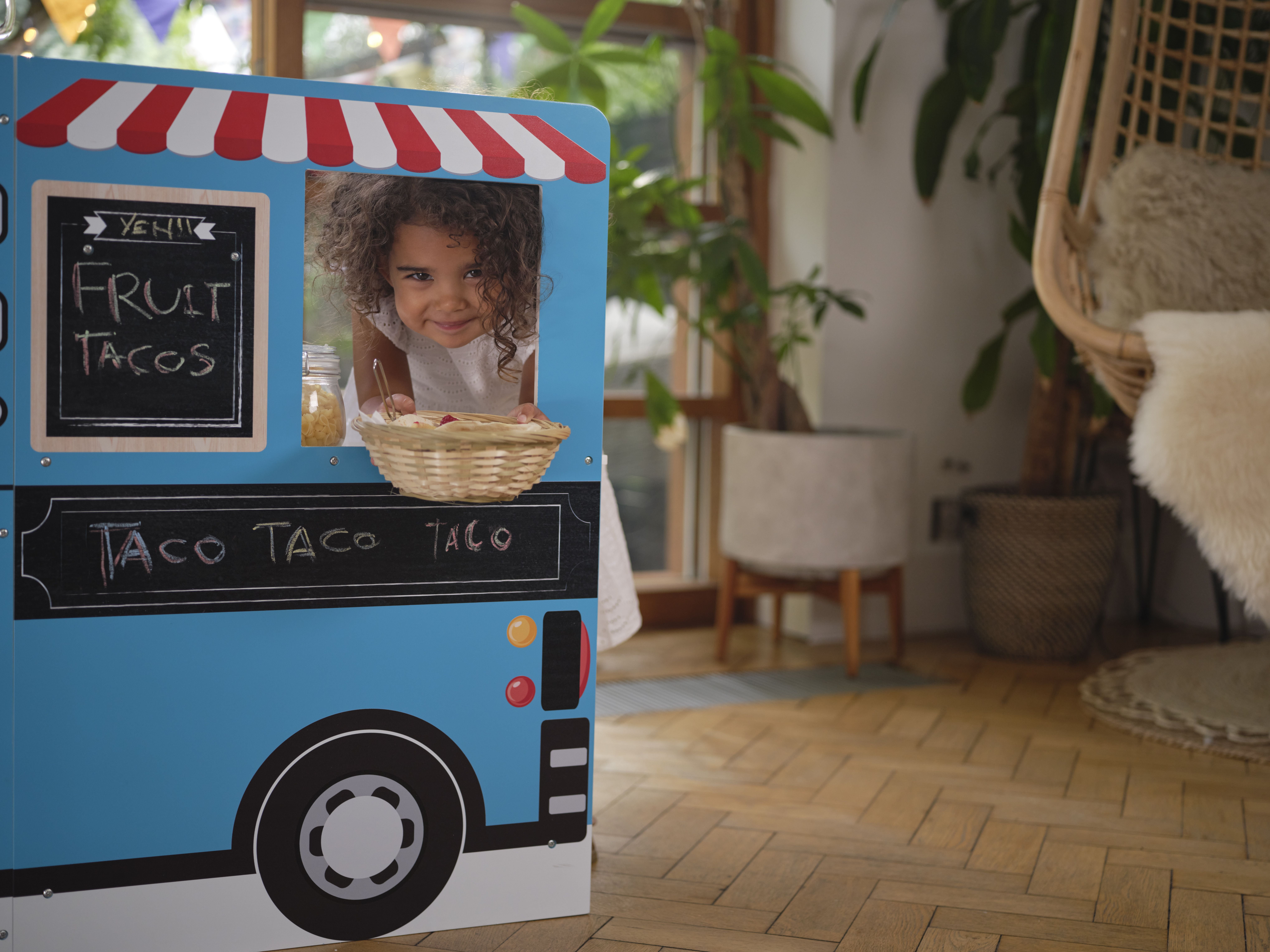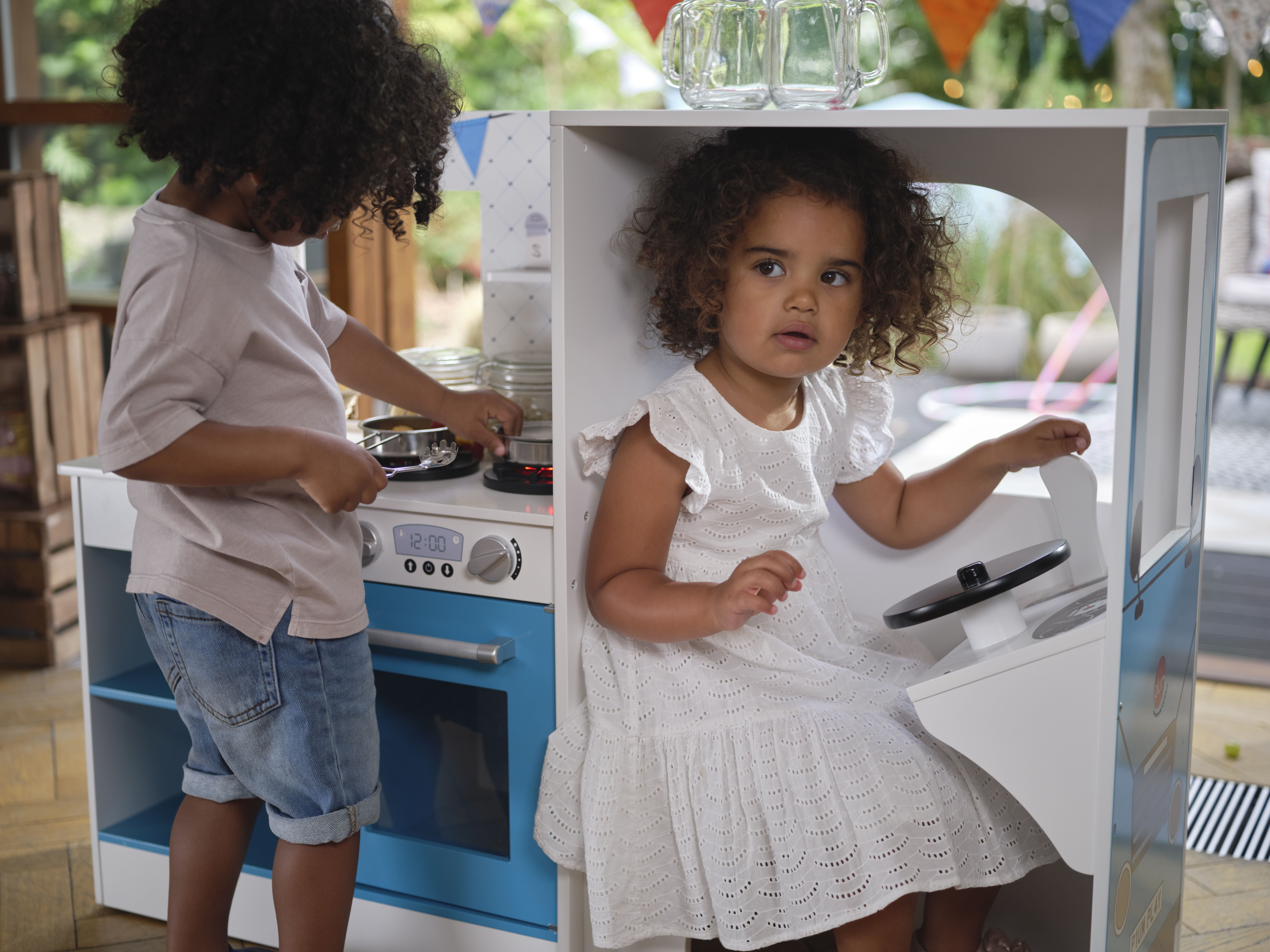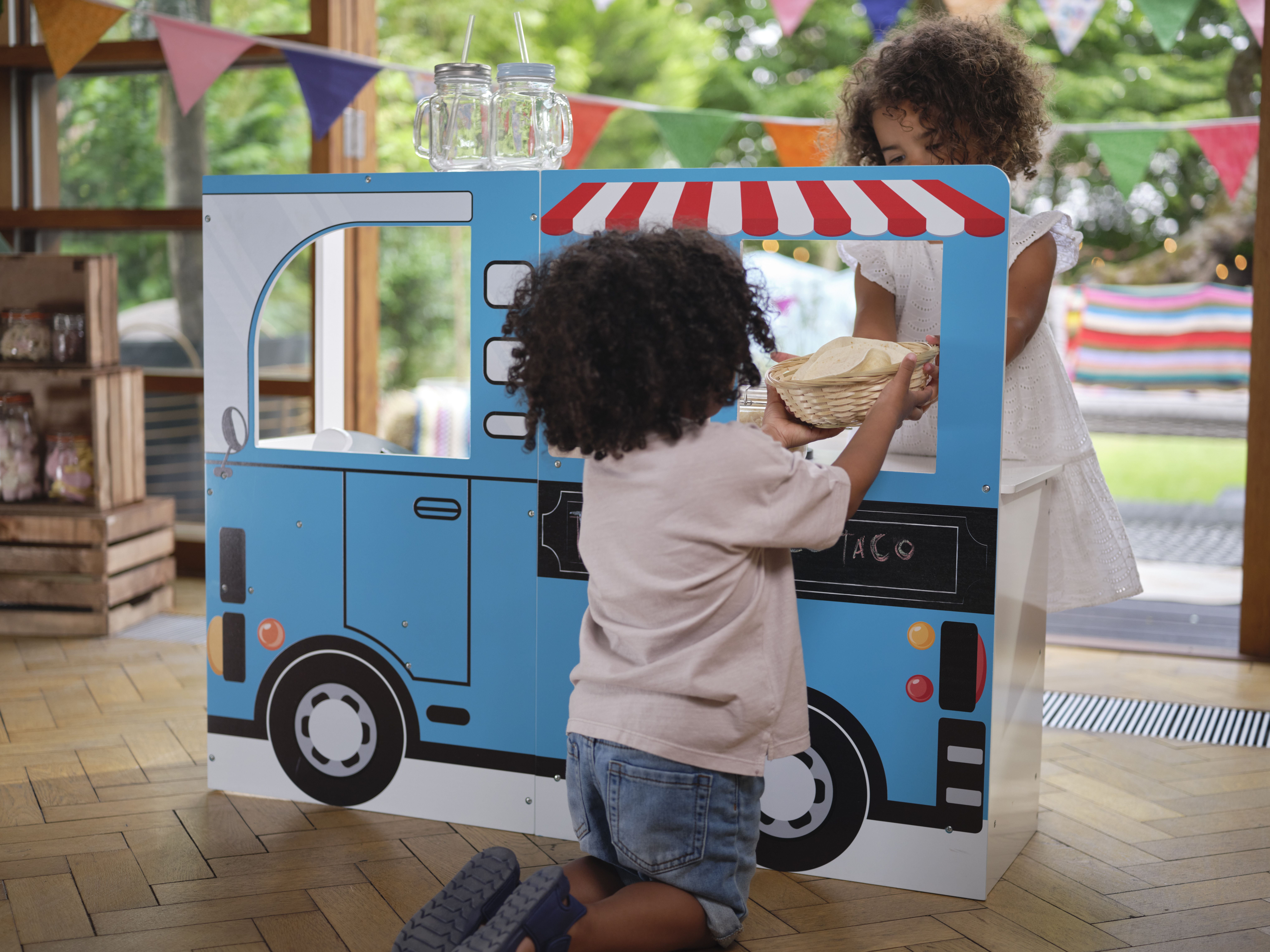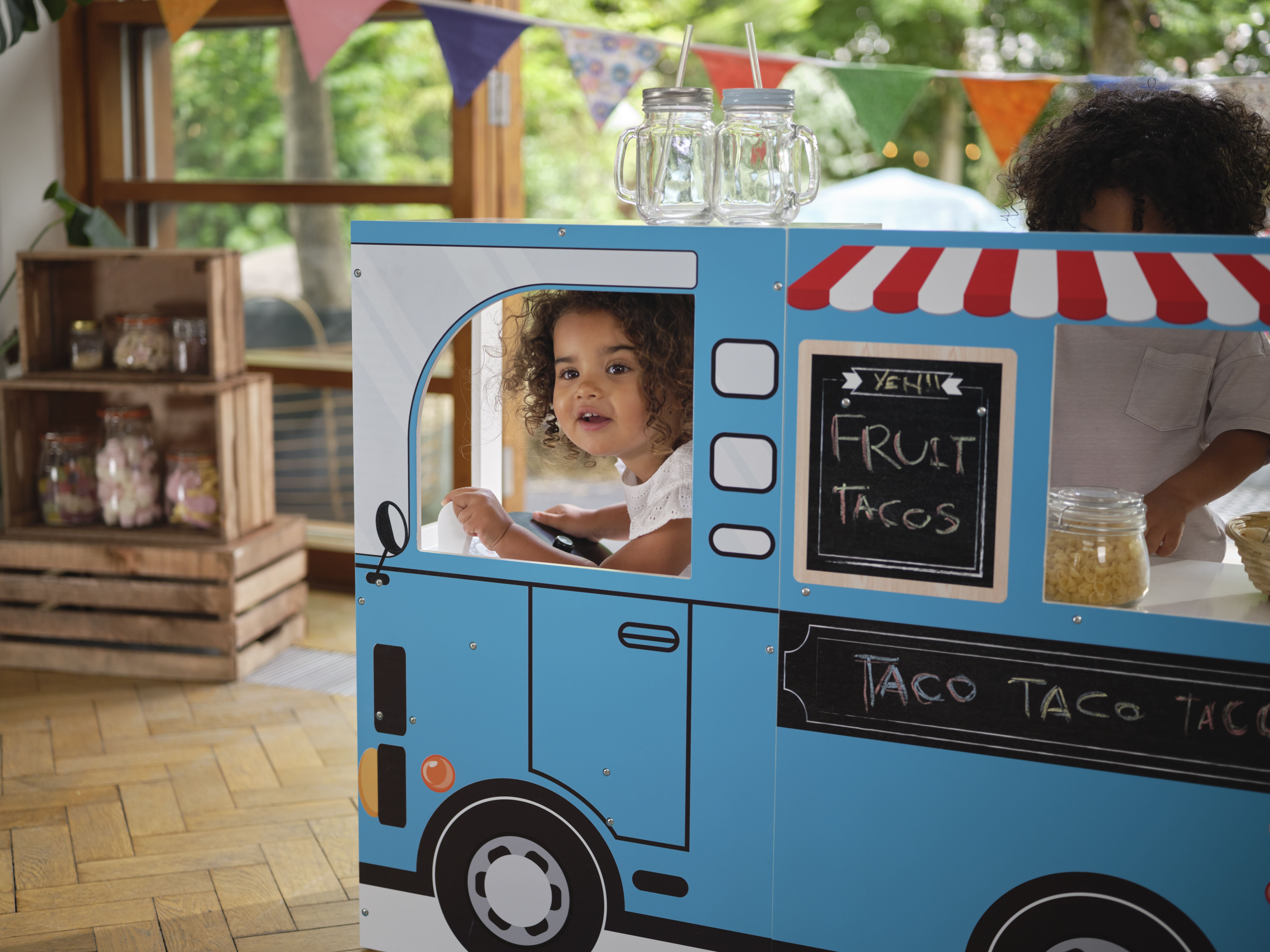 The 3-in-1 design allows 360° pretend play in a small space and the chalkboard design allows children to customize their play activity Light-up burners with sound will inspire hours of imaginative food fun Features include driving cab compartment, stove and washing machine with click and turn knobs, serving hatch, removable sink with taps Includes 3 stainless-steel kitchen utensils, pan and pot with lid Inspire hours of endless food fun with the 3-in-1 Wooden Street Food Truck and Kitchen with Driving Cab Open and close cabinet doors with ample storage Supplied flat packed and pre-drilled with easy assembly instructions Adult assembly required Approximate assembly time: 2 hours for 1 adult Assembled dimensions: L 41.33” x W 12” x L 31.5” Product may vary slightly from images shown For ages 3 years and up Warranty: 12 months Not suitable for children under 36 months Hemispheric shapes – suffocation hazard For domestic, indoor use only Maximum user weight: 110 lbs