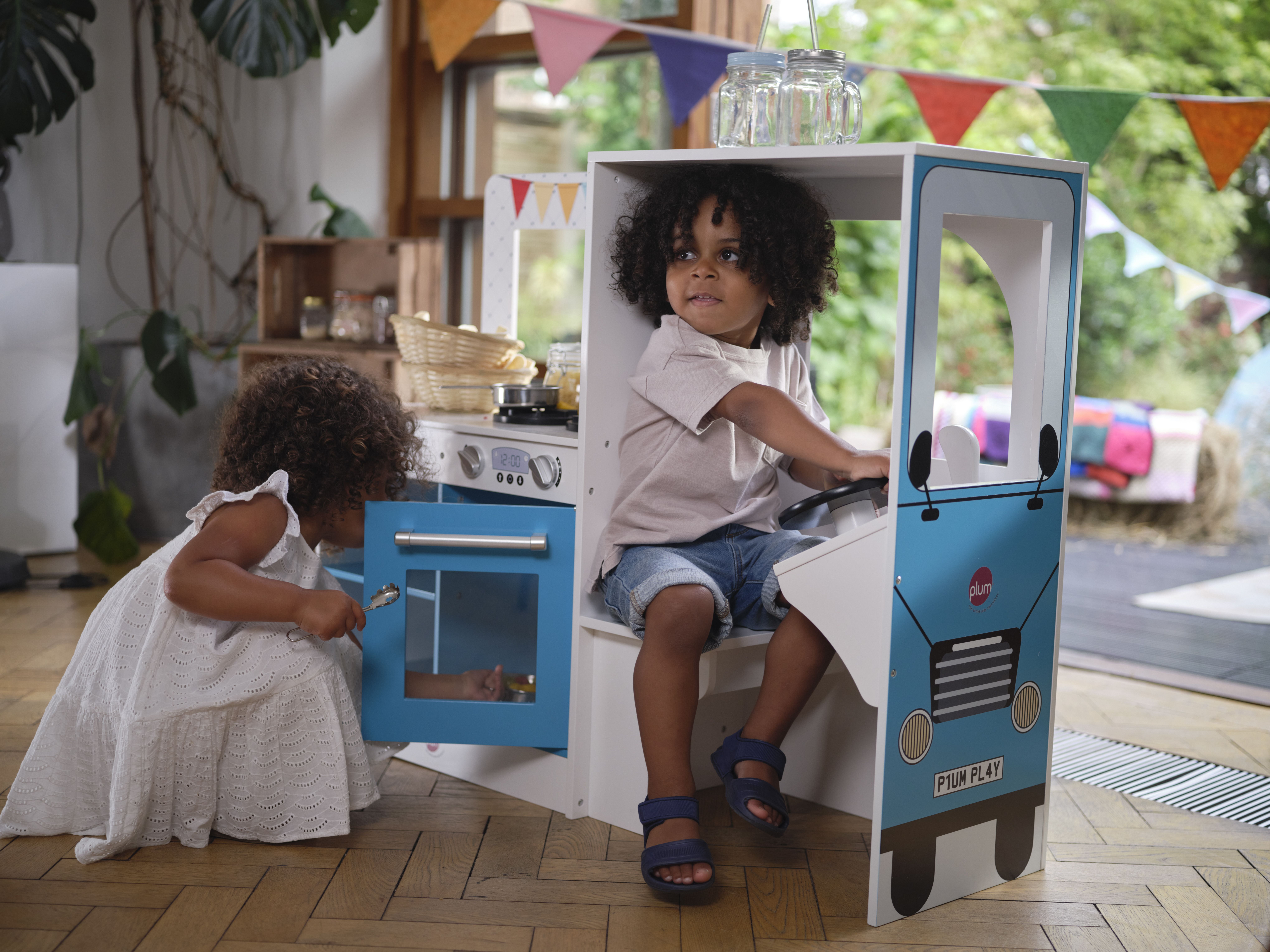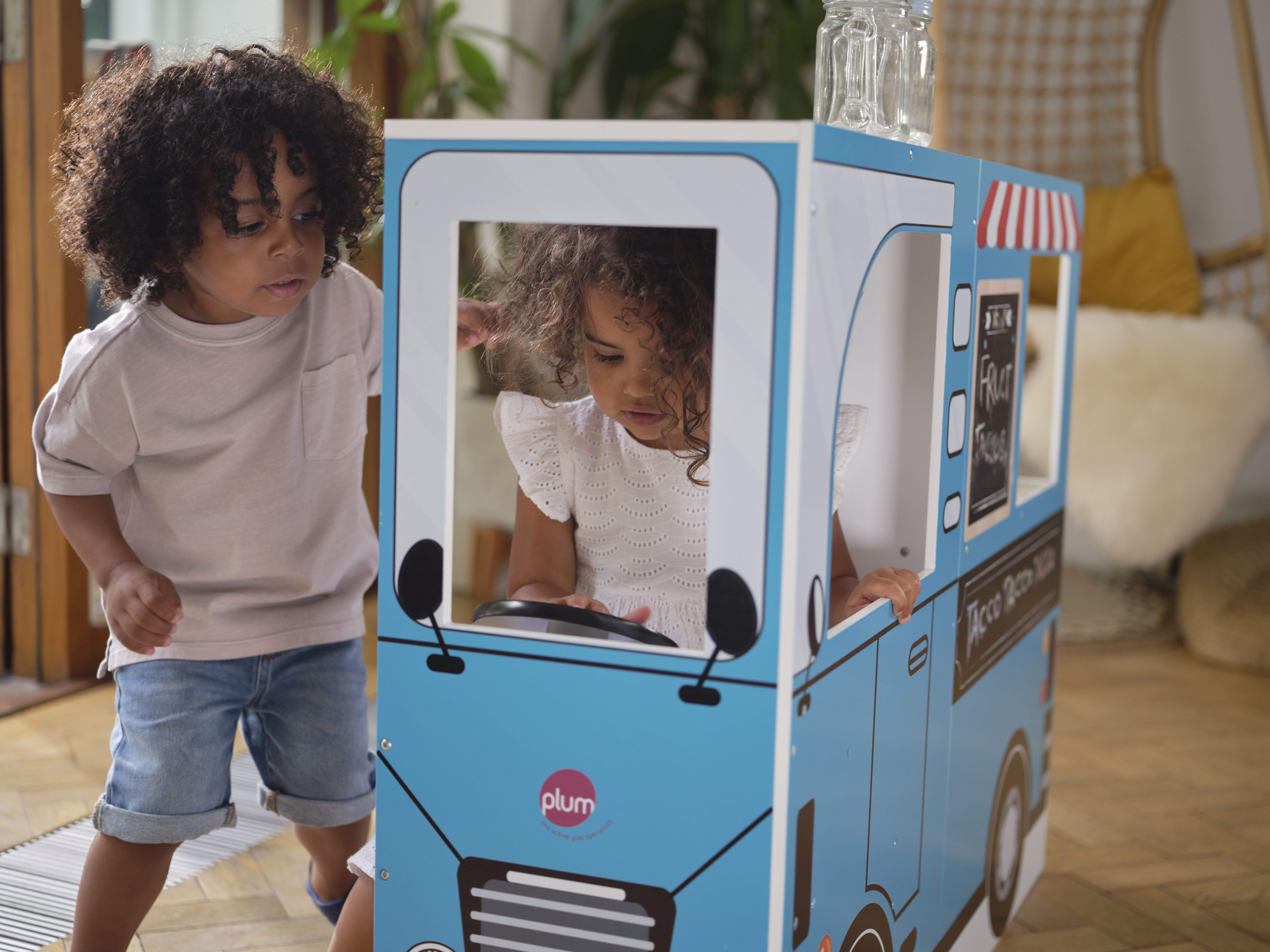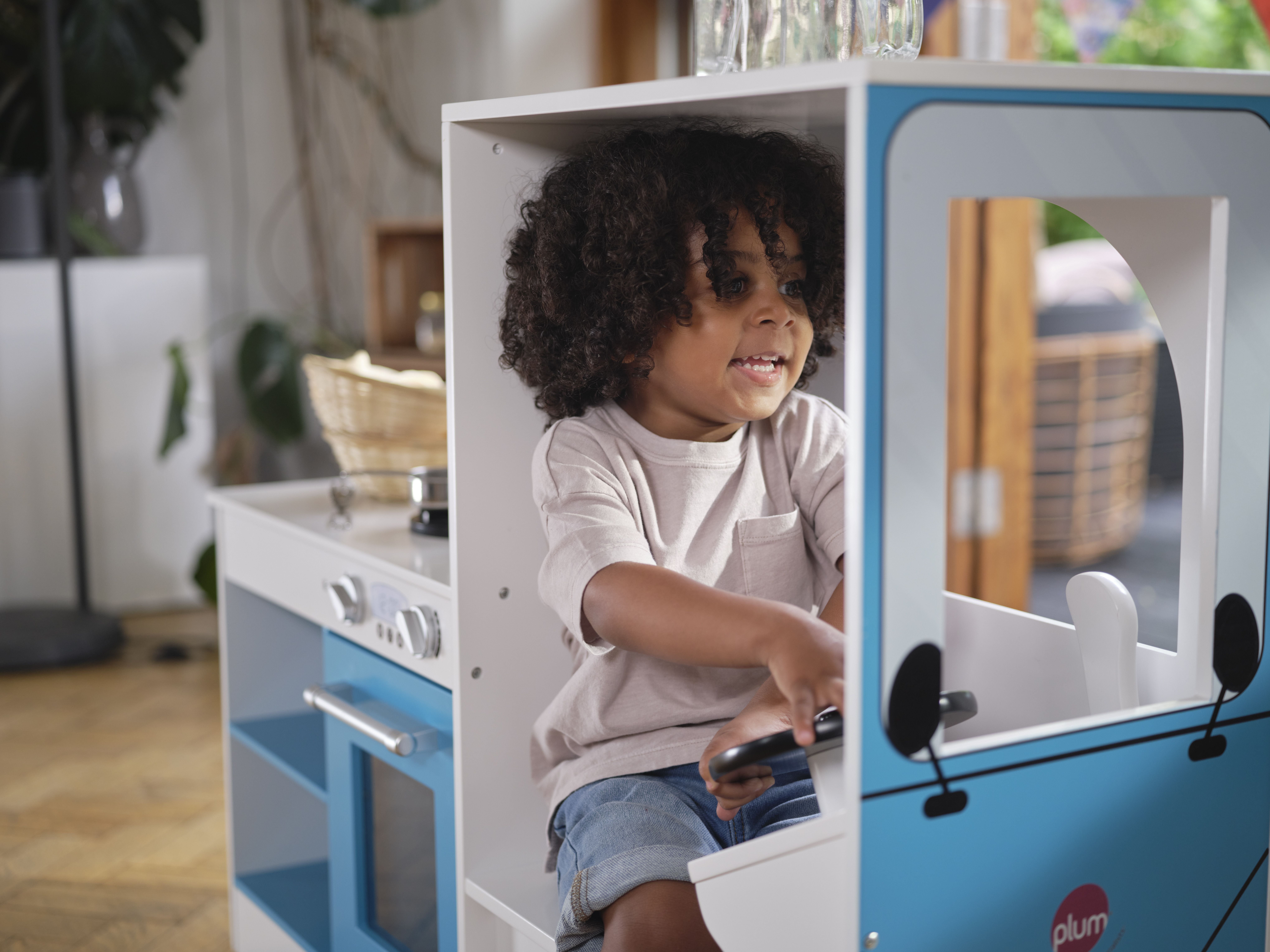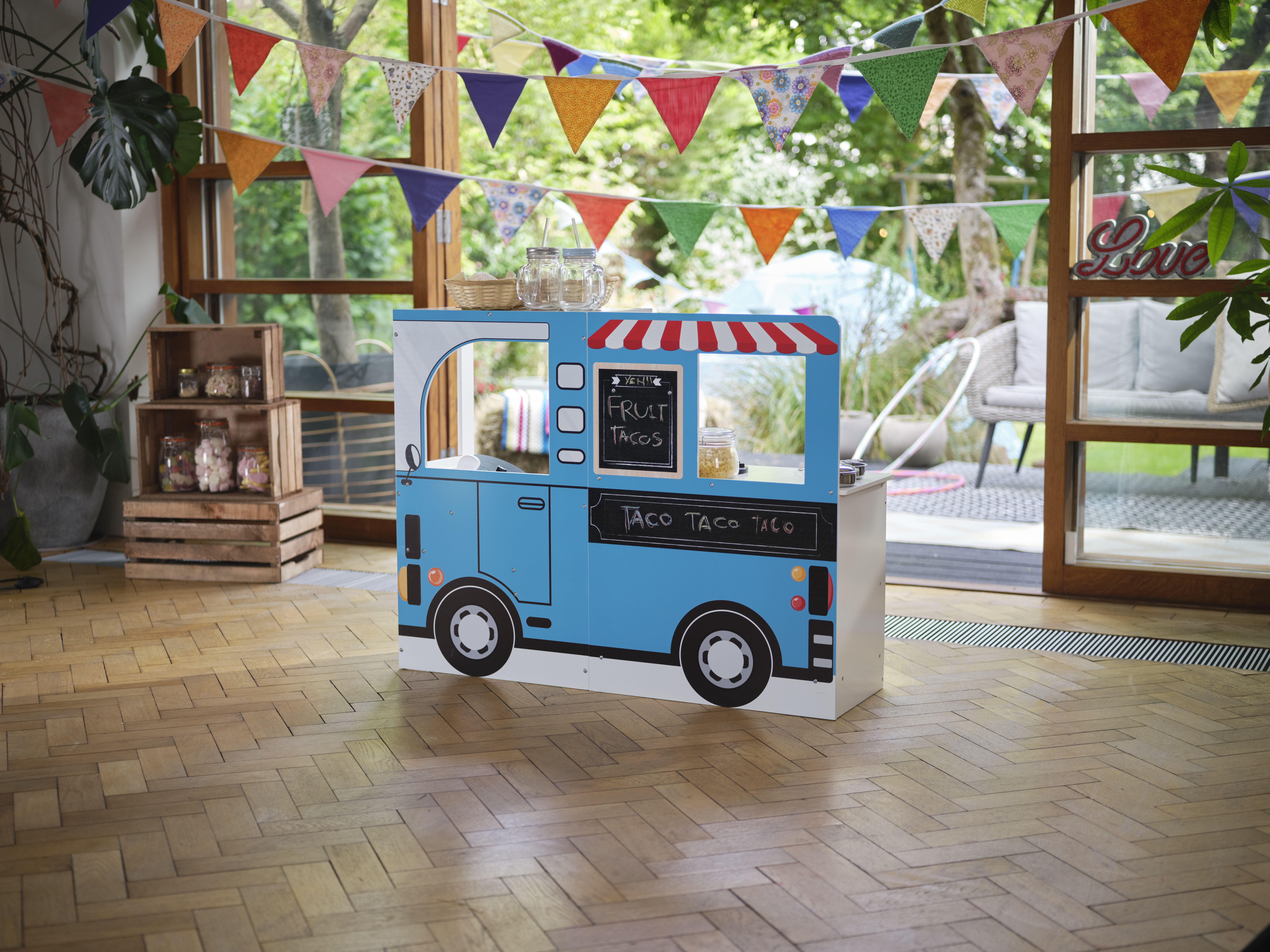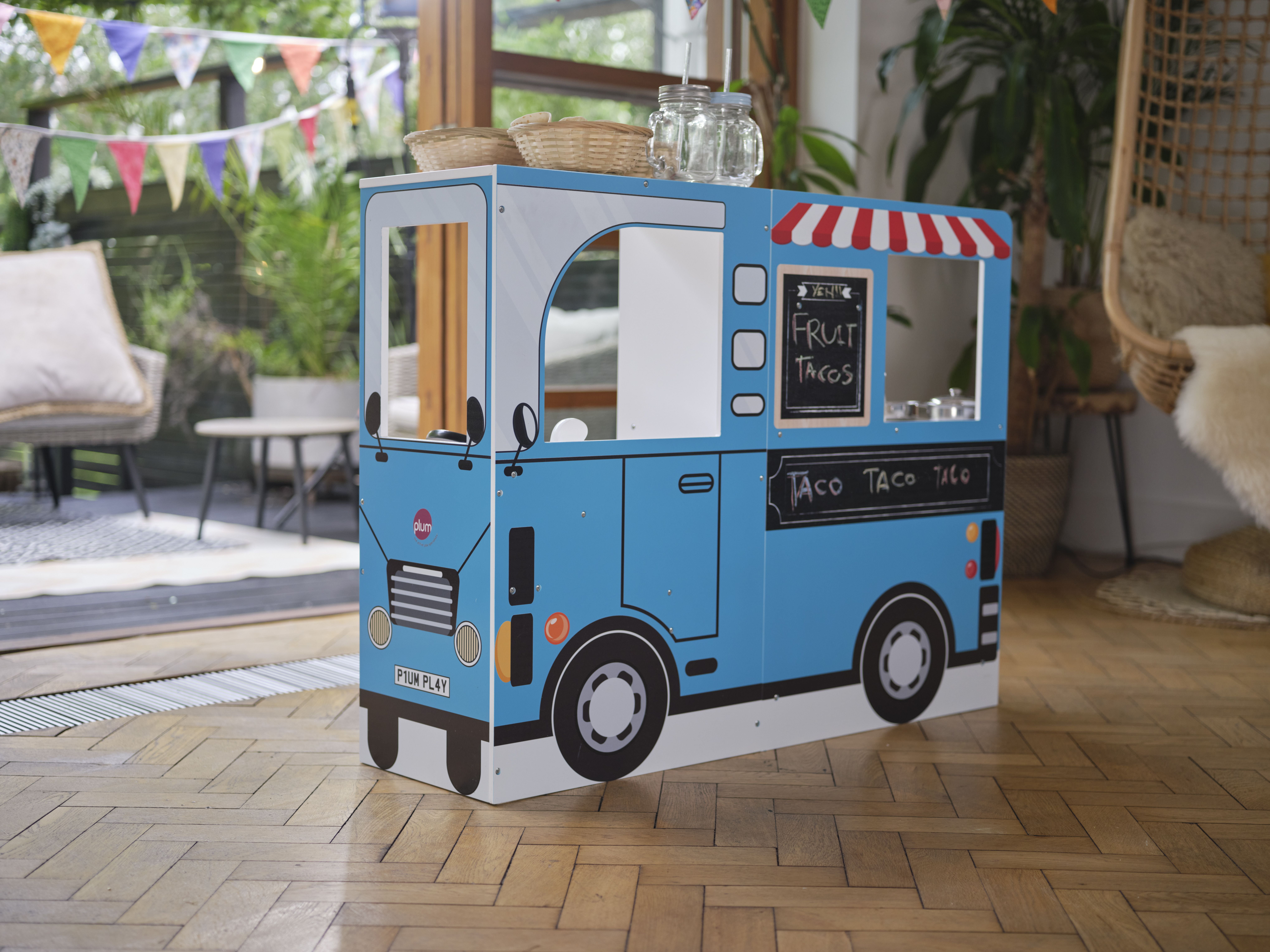 The 3-in-1 design allows 360° pretend play in a small space and the chalkboard design allows children to customize their play activity Light-up burners with sound will inspire hours of imaginative food fun Features include driving cab compartment, stove and washing machine with click and turn knobs, serving hatch, removable sink with taps Includes 3 stainless-steel kitchen utensils, pan and pot with lid Inspire hours of endless food fun with the 3-in-1 Wooden Street Food Truck and Kitchen with Driving Cab Open and close cabinet doors with ample storage Supplied flat packed and pre-drilled with easy assembly instructions Adult assembly required Approximate assembly time: 2 hours for 1 adult Assembled dimensions: L 41.33” x W 12” x L 31.5” Product may vary slightly from images shown For ages 3 years and up Warranty: 12 months Not suitable for children under 36 months Hemispheric shapes – suffocation hazard For domestic, indoor use only Maximum user weight: 110 lbs