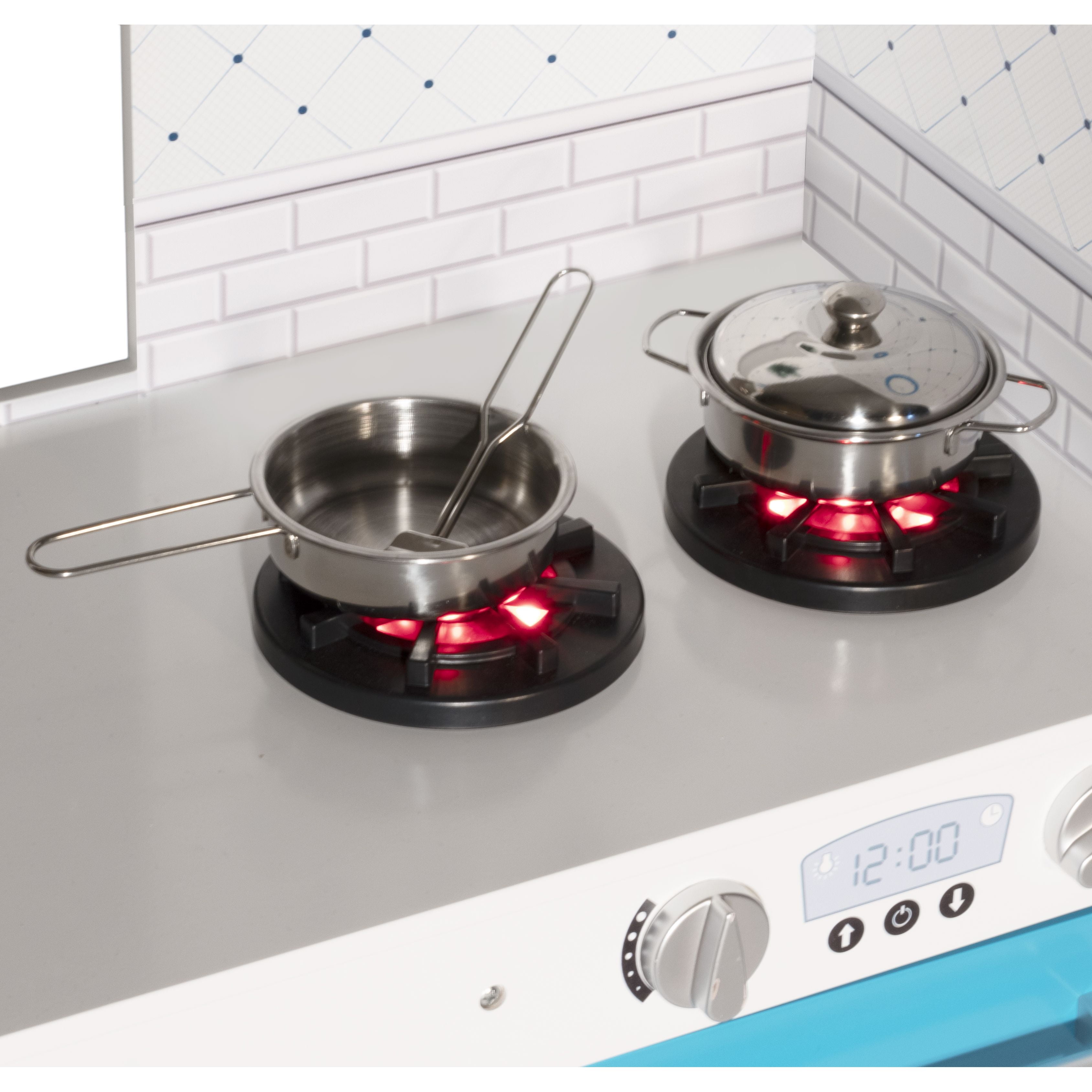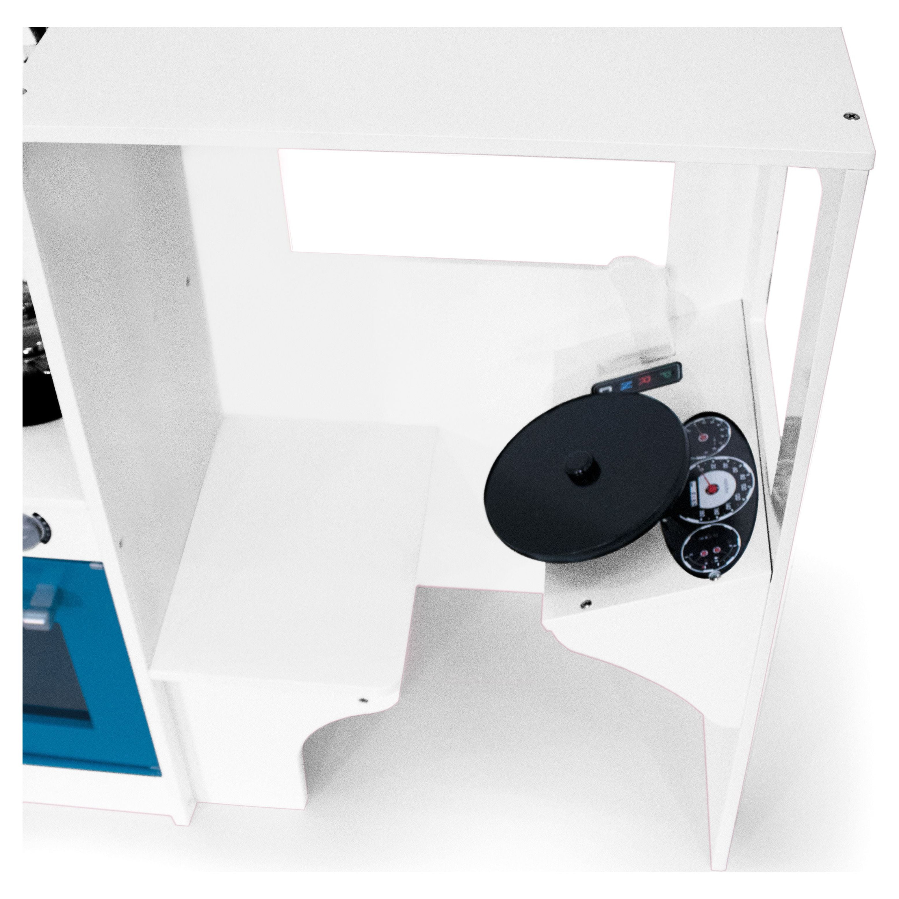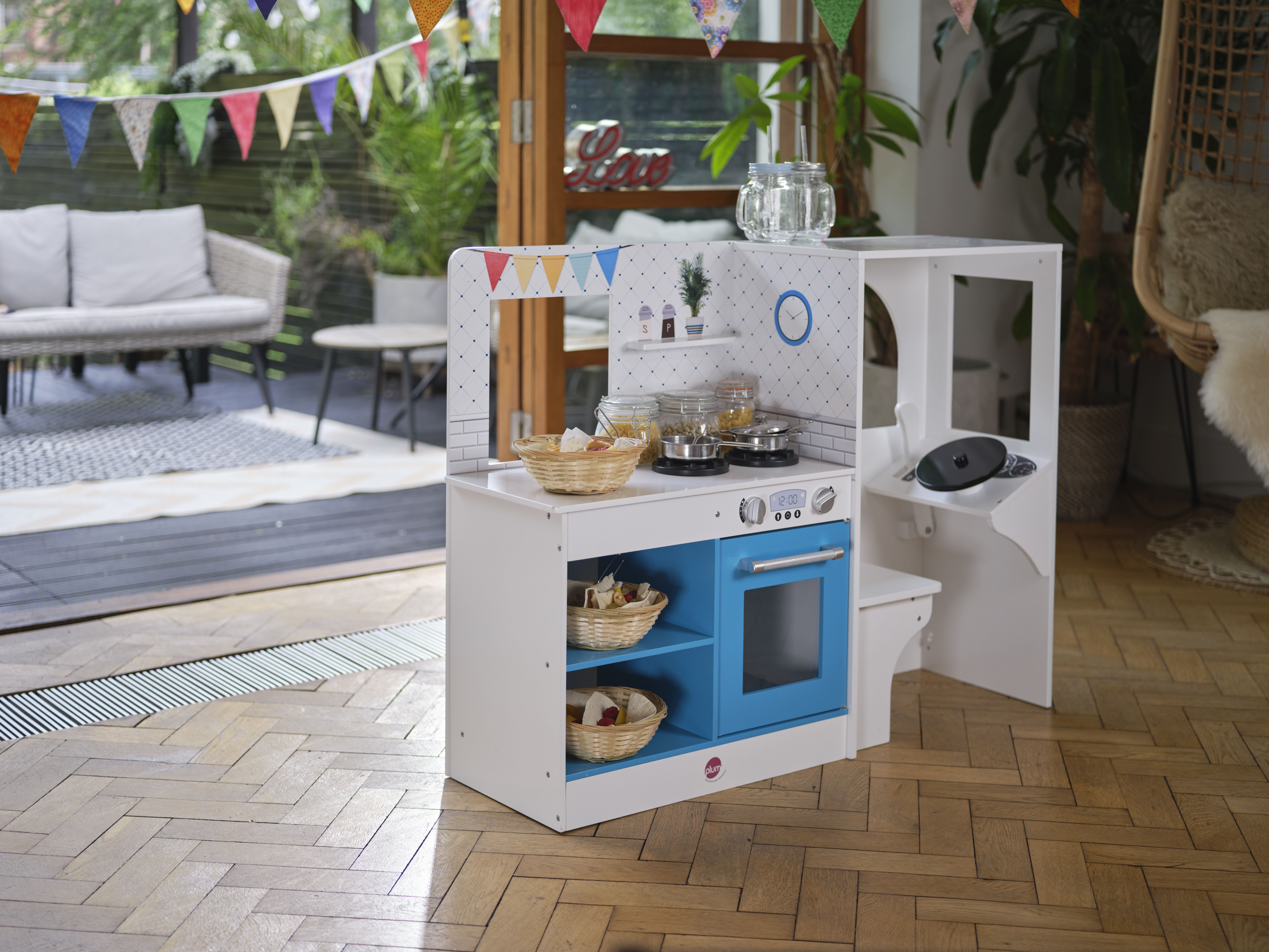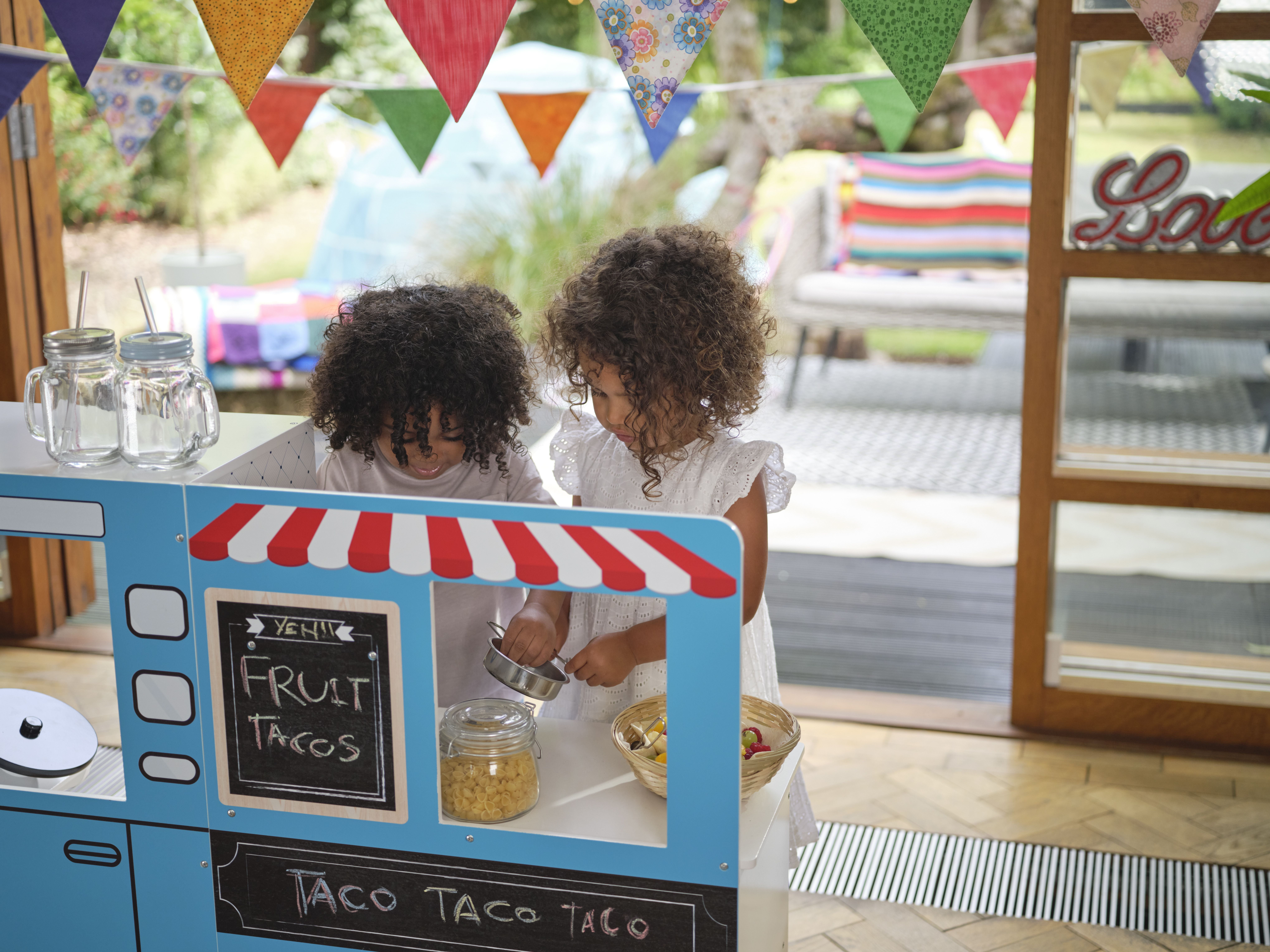 The 3-in-1 design allows 360° pretend play in a small space and the chalkboard design allows children to customize their play activity Light-up burners with sound will inspire hours of imaginative food fun Features include driving cab compartment, stove and washing machine with click and turn knobs, serving hatch, removable sink with taps Includes 3 stainless-steel kitchen utensils, pan and pot with lid Inspire hours of endless food fun with the 3-in-1 Wooden Street Food Truck and Kitchen with Driving Cab Open and close cabinet doors with ample storage Supplied flat packed and pre-drilled with easy assembly instructions Adult assembly required Approximate assembly time: 2 hours for 1 adult Assembled dimensions: L 41.33” x W 12” x L 31.5” Product may vary slightly from images shown For ages 3 years and up Warranty: 12 months Not suitable for children under 36 months Hemispheric shapes – suffocation hazard For domestic, indoor use only Maximum user weight: 110 lbs
