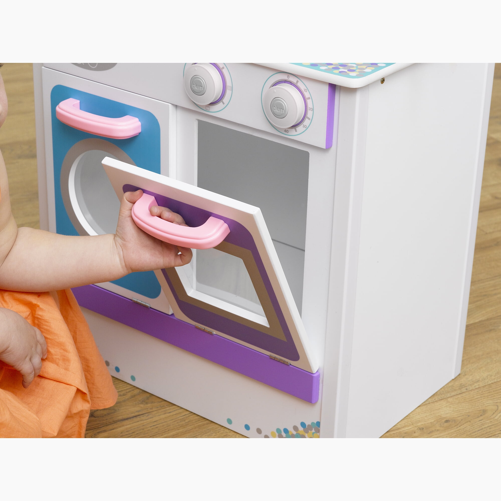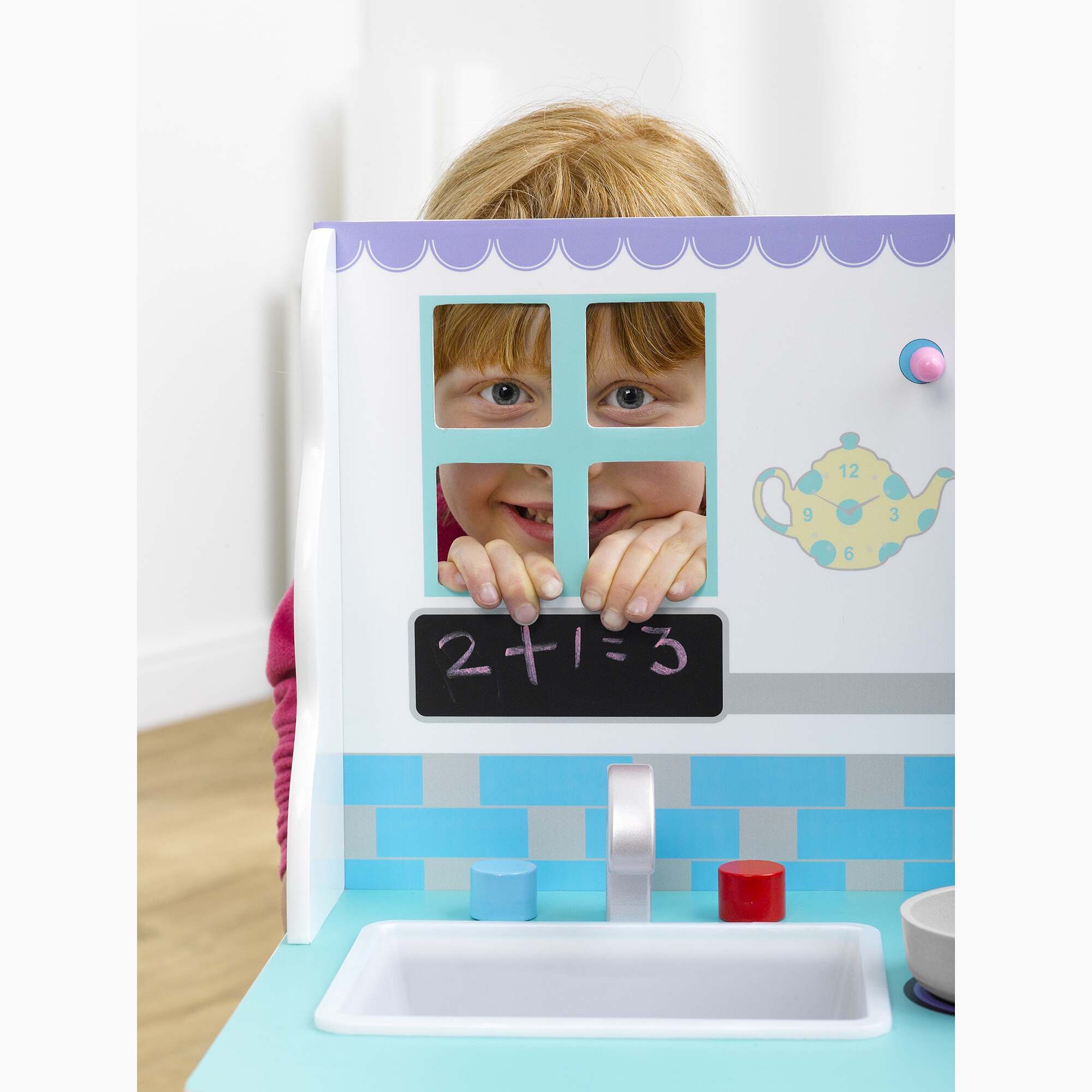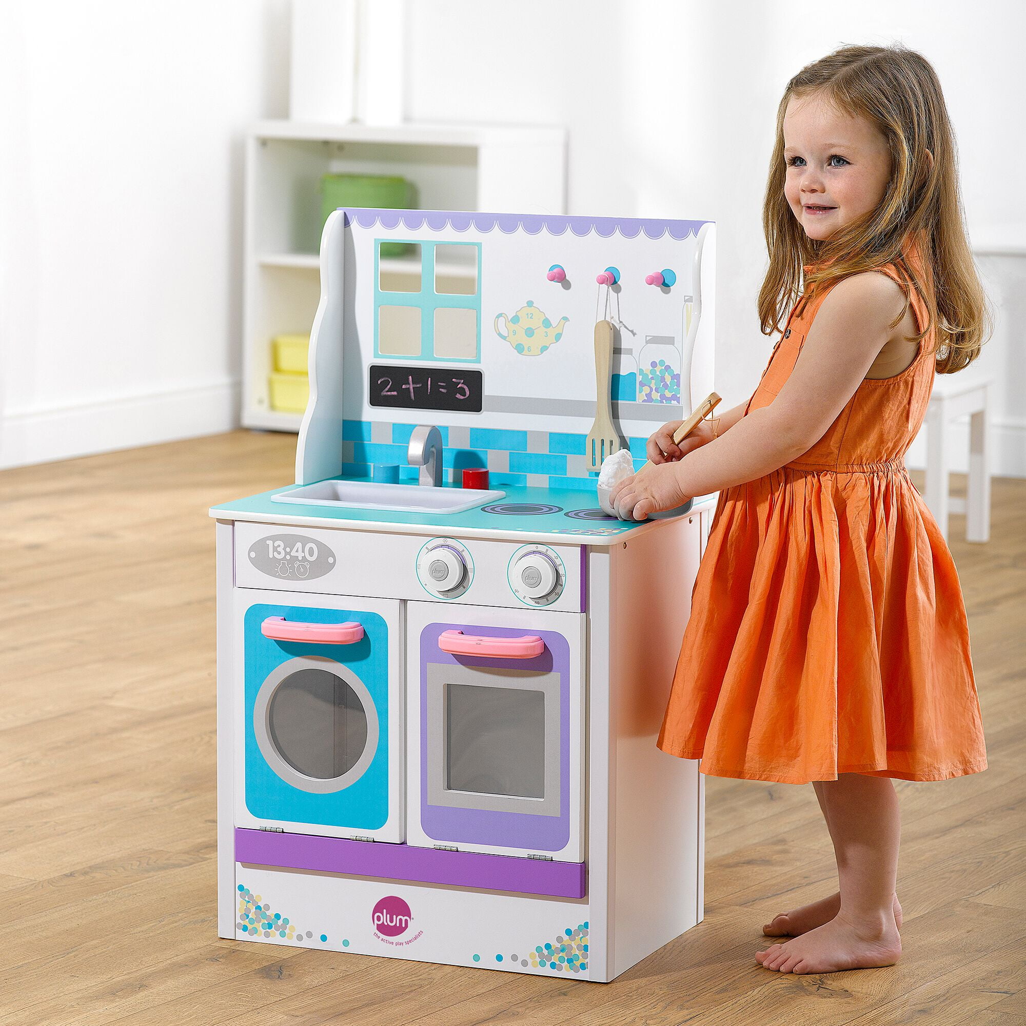 The colorful Plum® Cook-a-lot Chive Wooden Kitchen is the perfect first kitchen for little cooks. Aspiring chefs can use the click and turn knobs to set temperature, fry on the hobs, bake cakes inside the oven and even do their laundry in the washing machine. Additional features to this wooden kitchen also include hanging hooks for tea towels and utensils as well as a feature window for playing hide and seek. A real chalkboard is added above the sink and is ideal for making shopping lists or chalking up menus and recipes. Cleaning up couldn?t be easier, the removable sink can be filled up with water to wash the wooden accessories which include frying pan, spoon and spatula, so that little chefs can start cooking straight away. The Plum® Cook-a-lot Chive Kitchen is made from strong and sturdy timber, built to last for years to come. Assembled Size: L19.69? x W11.42? x H29.13?. Product Weight: 11.90lbs. For ages 3 years and older. Adult assembly required. Approximate assembly: 1 adult – 1 hour. Not suitable for children under 36 months – small parts – choking hazard. Manufacturer?s Warranty: 12 months.