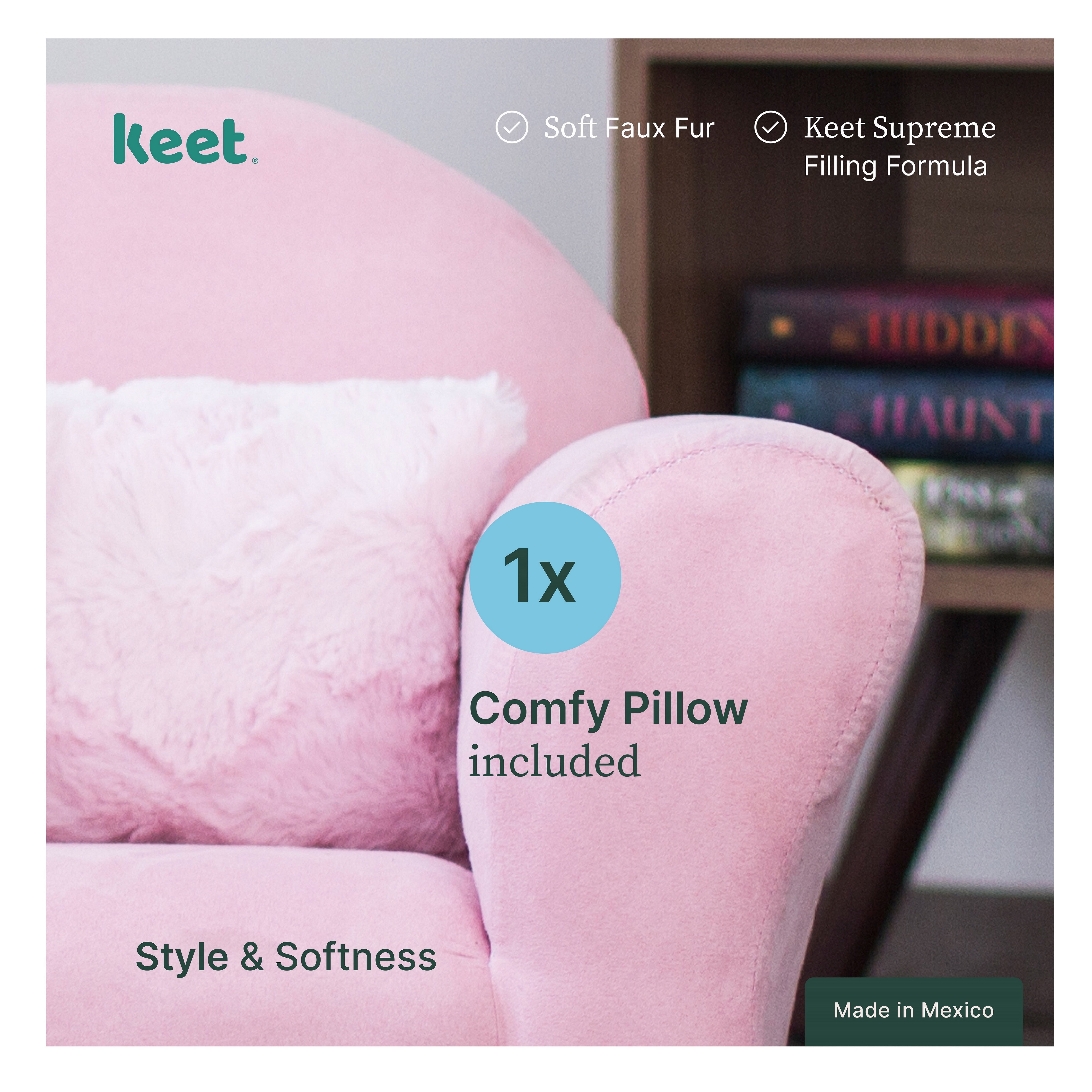 Make you Child feel special with this fabulously cozy Plush Keet Chair with fluffy accent pillow. Supremely stable constructed with a frame made of sturdy wood, this comfy chair covered in supportive foam and a rich micro suede fabric, gives your child the best and most comfortable experience. This chair is not only perfect for playrooms, little ones’ rooms, but it will also look great in living rooms and anywhere in your home. It’s gorgeous details, including the rounded arms, square back, chic and fluffy accent pillow matching perfectly with this beautiful piece and wood legs for a real furniture look, make this Keet upholstered micro suede chair a stylish and special furniture piece.