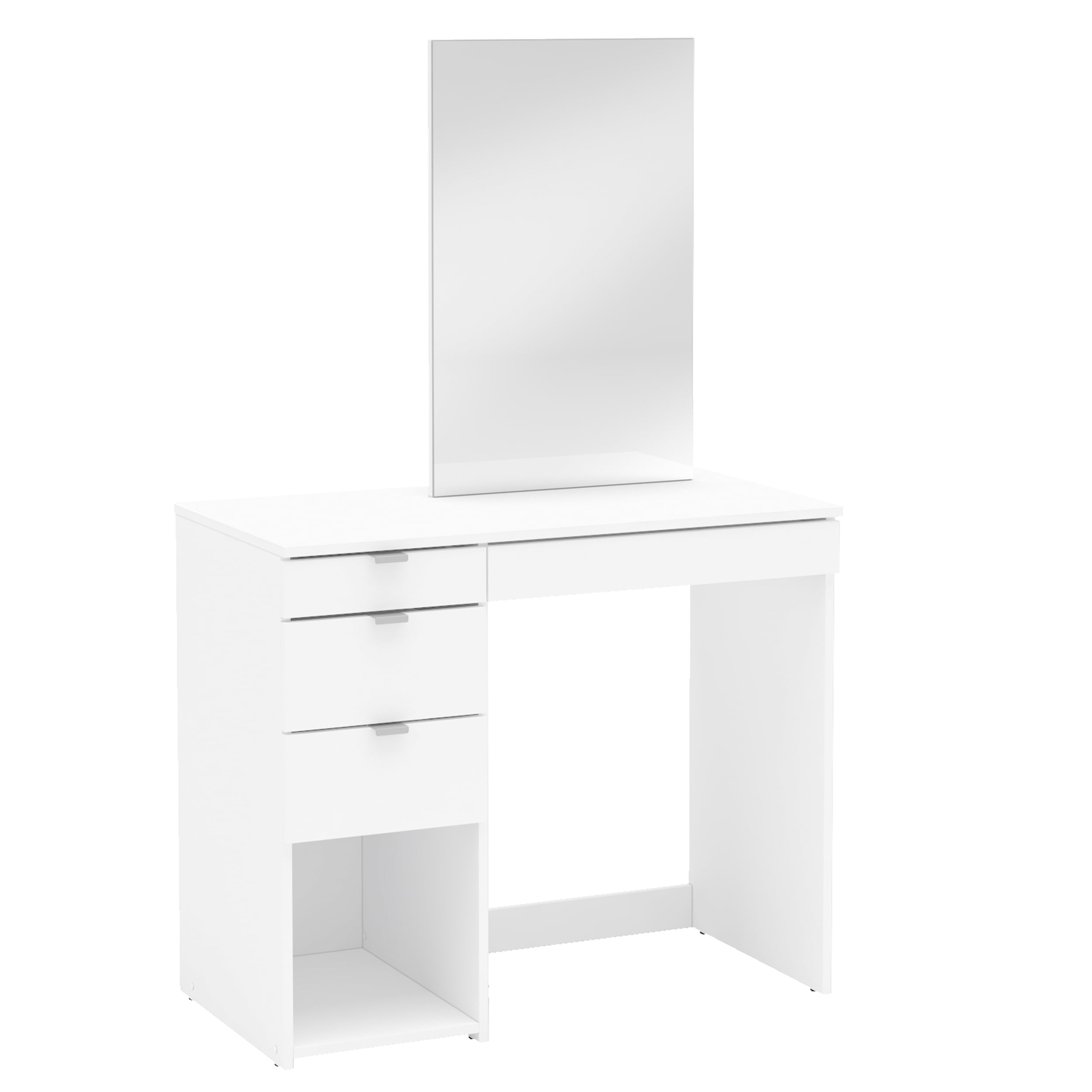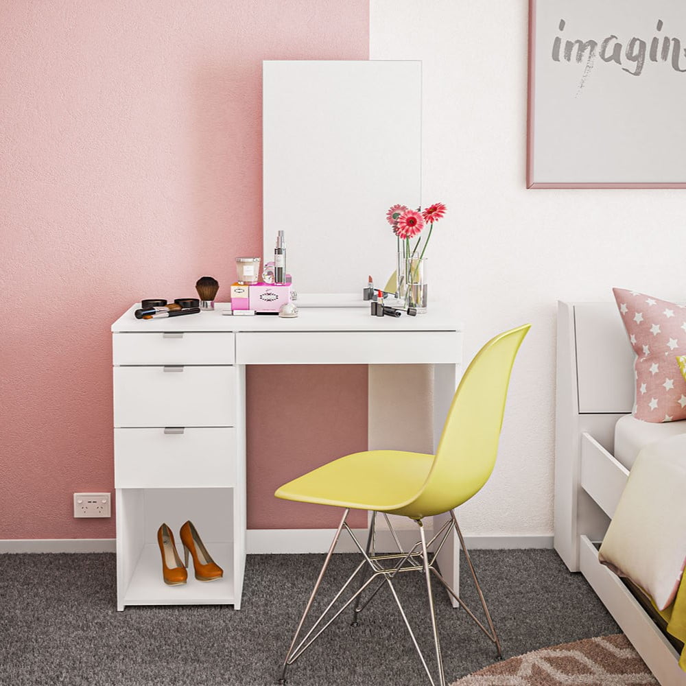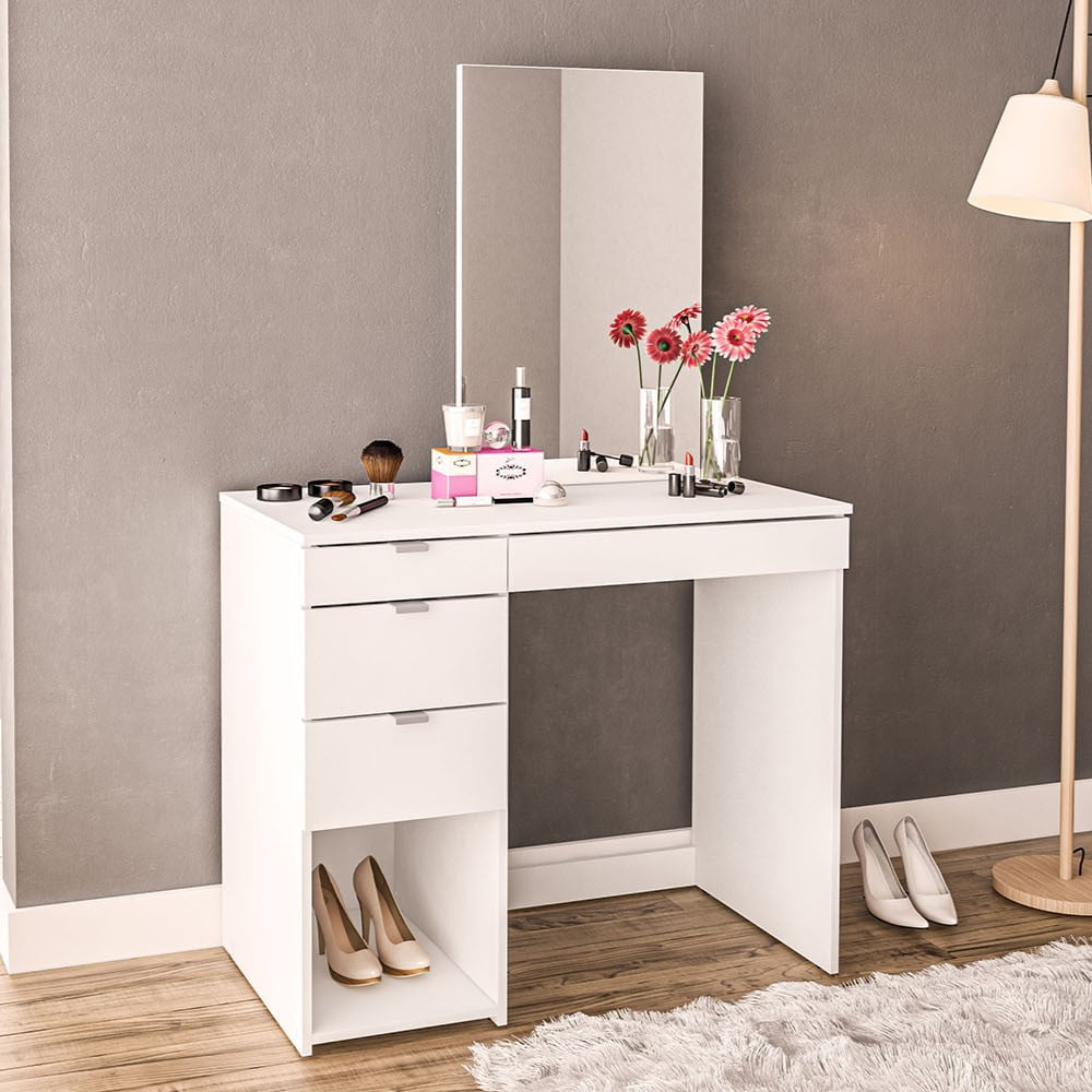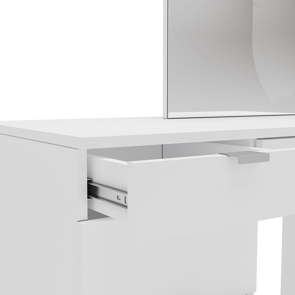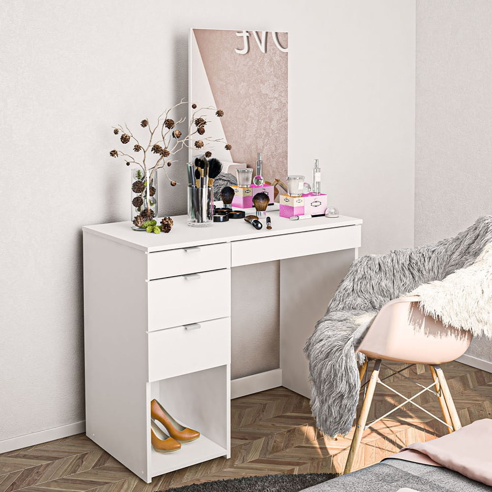 Joplin Modern Vanity Table from Polifurniture Melamine finish is scratch, stain and water resistant Constructed from engineered wood 4 large drawers for concealed storage All drawers on ball bearing glides 1 open section perfect for storage or display space Spacious tabletop and large mirror Modern design with white finish will complement most home decor Perfect for adults or teens Assembled dimensions: 35.5 in. W x 17.5 in. D x 58 in. H