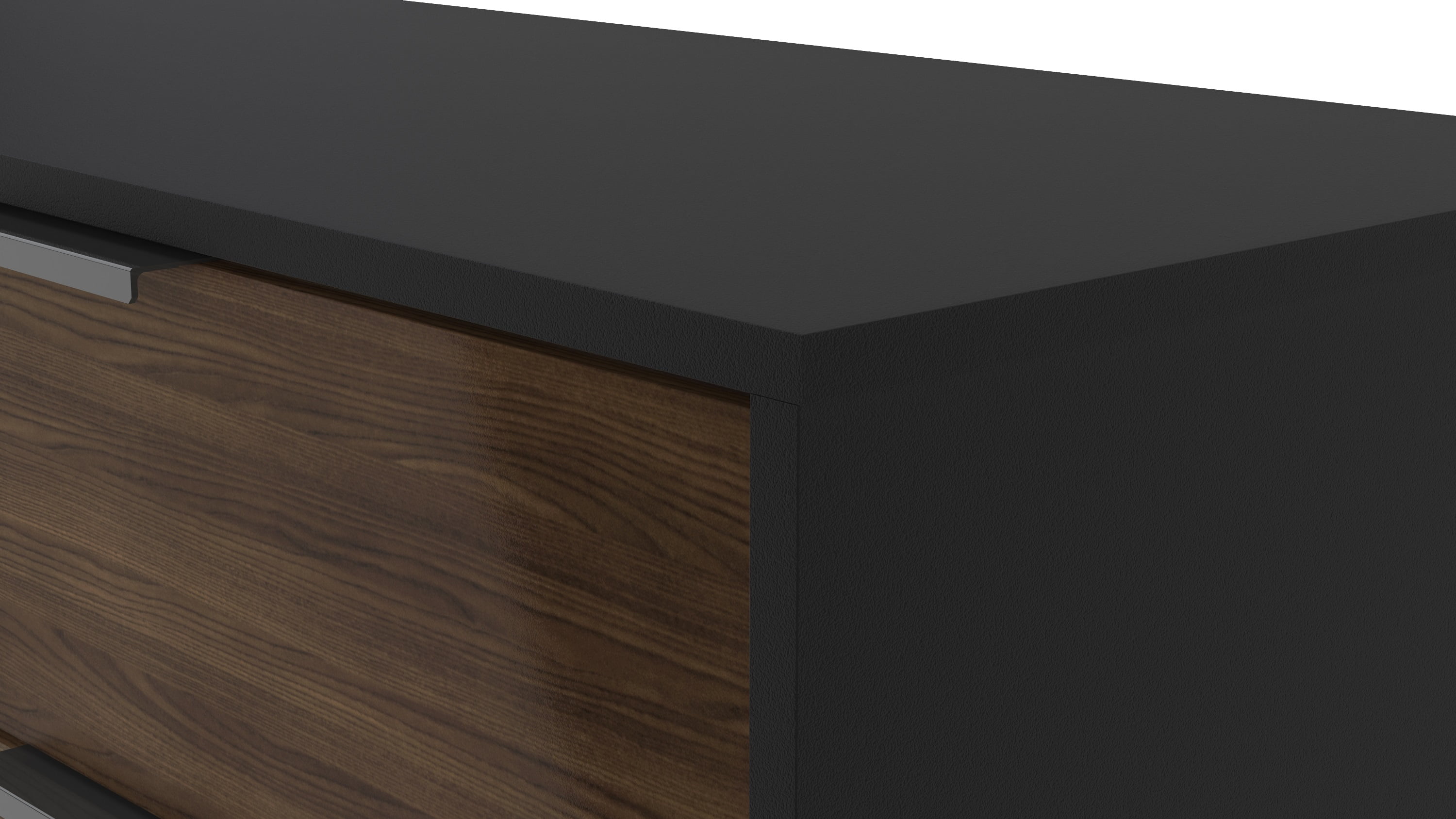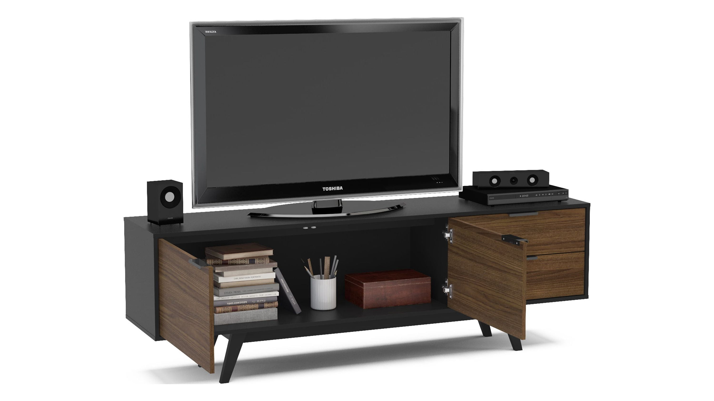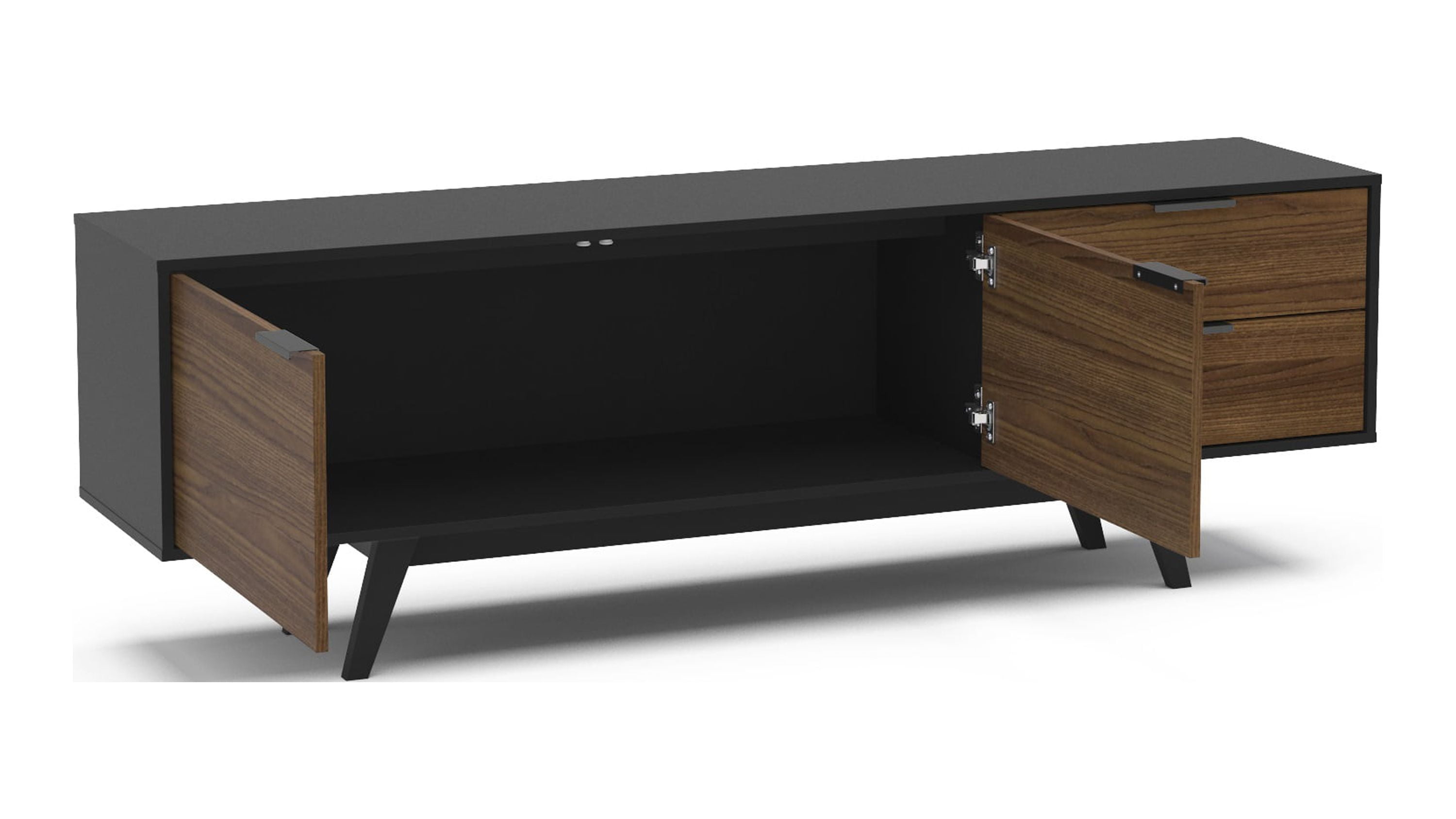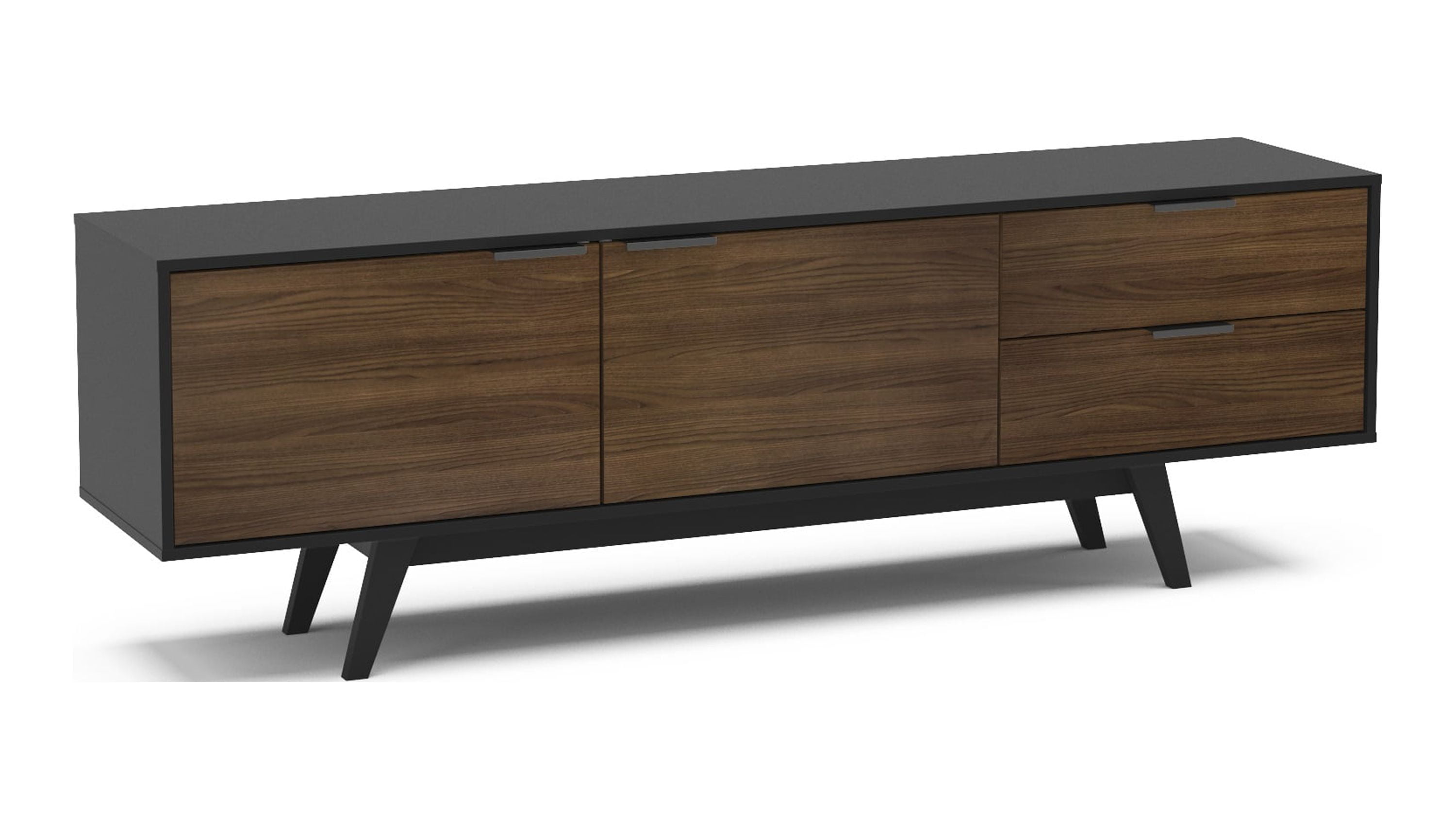 The modern design of the Laos TV Stand is the perfect addition to any living. This TV stand offers plenty of enclosed storage with a large storage cabinet and two drawers to help keep your space looking neat and organized. The doors and drawer have a magnetic push closing system, it is a perfect touch for all your entertainment needs. With the ability to hold up to a 79-inch TV, this media console is a perfect addition to any room. The modern design with black and walnut finish will become the centerpiece of any room it is in. Allow Laos to come into your media room and take over the conversation. Assembly required; instructions provided. Assembled dimensions: 71 in. W x 15.75 in. D x 23.25 in. H