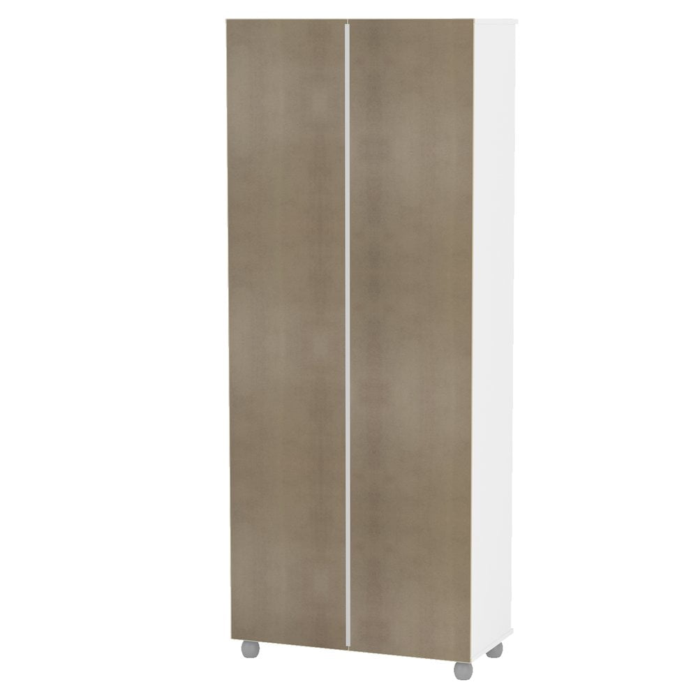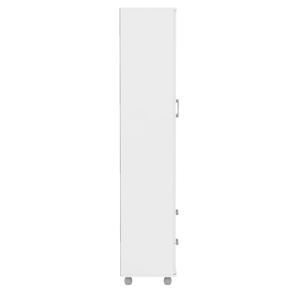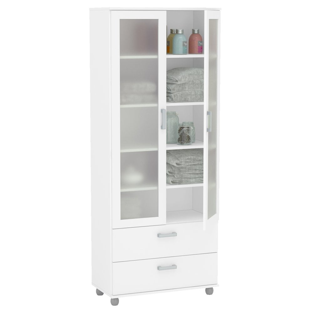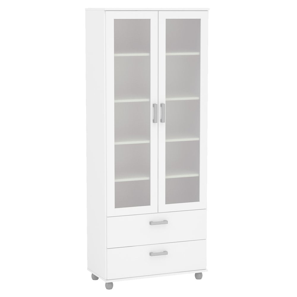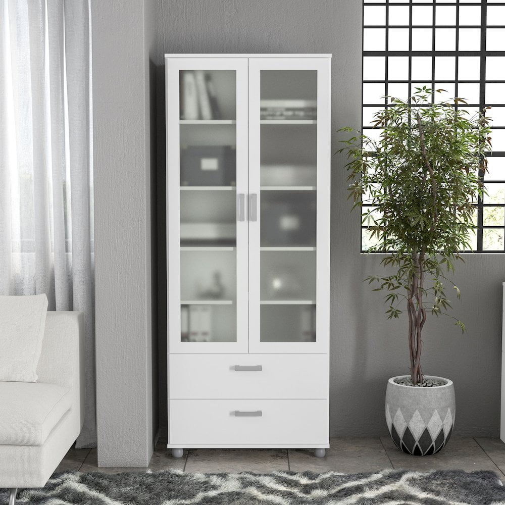 Melamine finish scratch, stain and water resistant Constructed from high quality engineered wood 2 door cabinet with 2 fixed shelves and 3 adjustable shelves 2 drawers on metal glides Perfect for home office, living room or kitchen Modern design with white finish will complement most home decor Assembled dimensions: 28.5 in. W x 14 in. D x 70 in. H