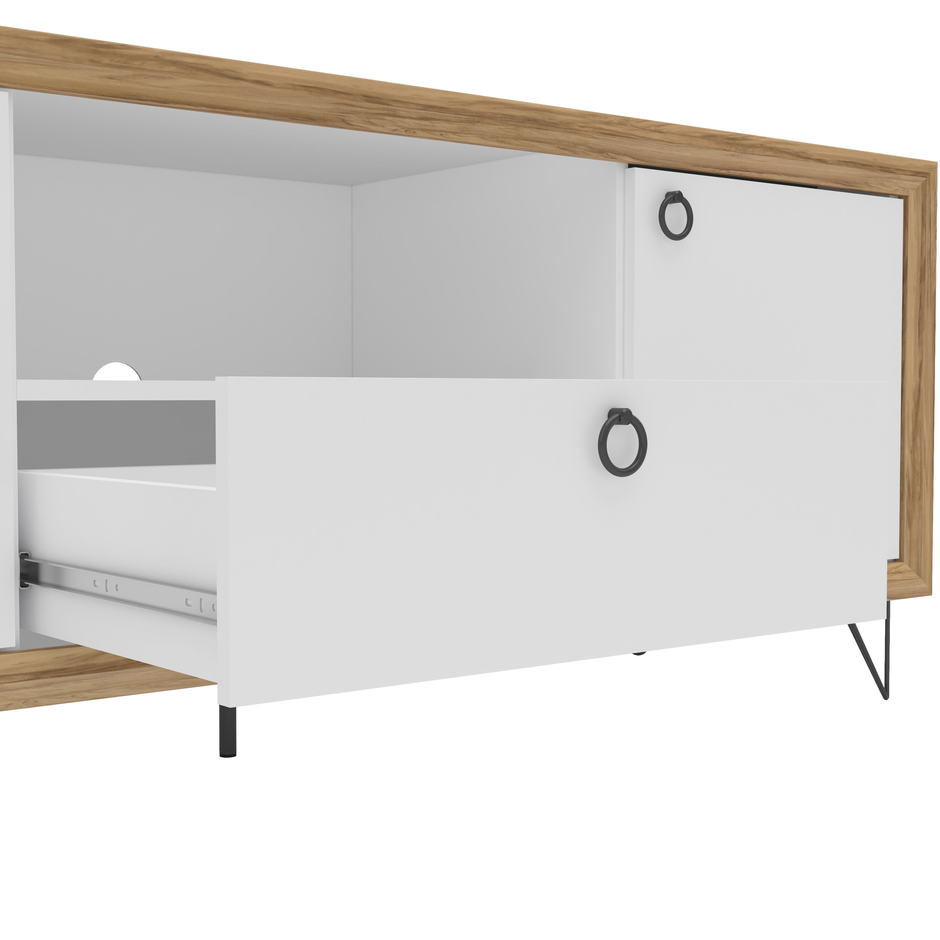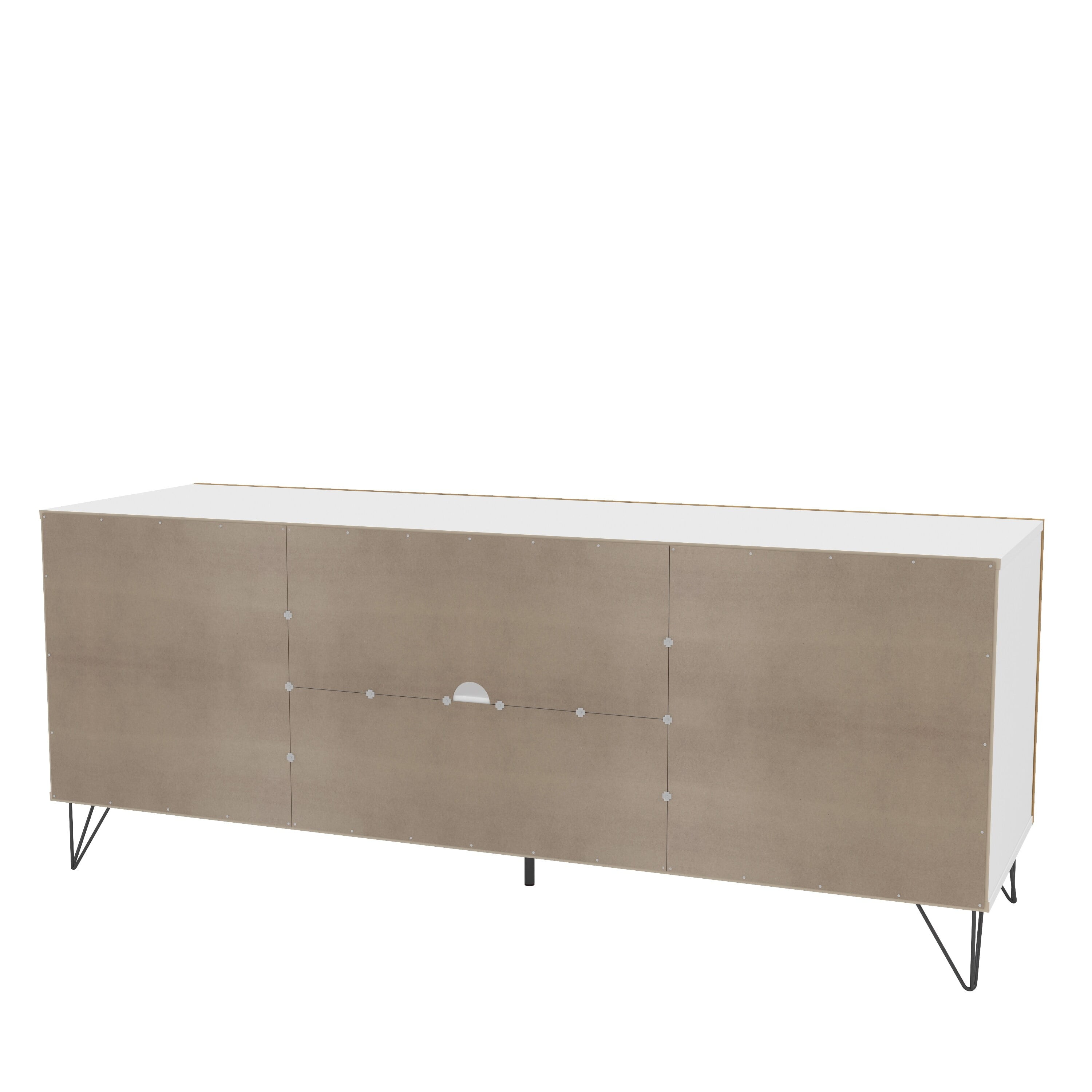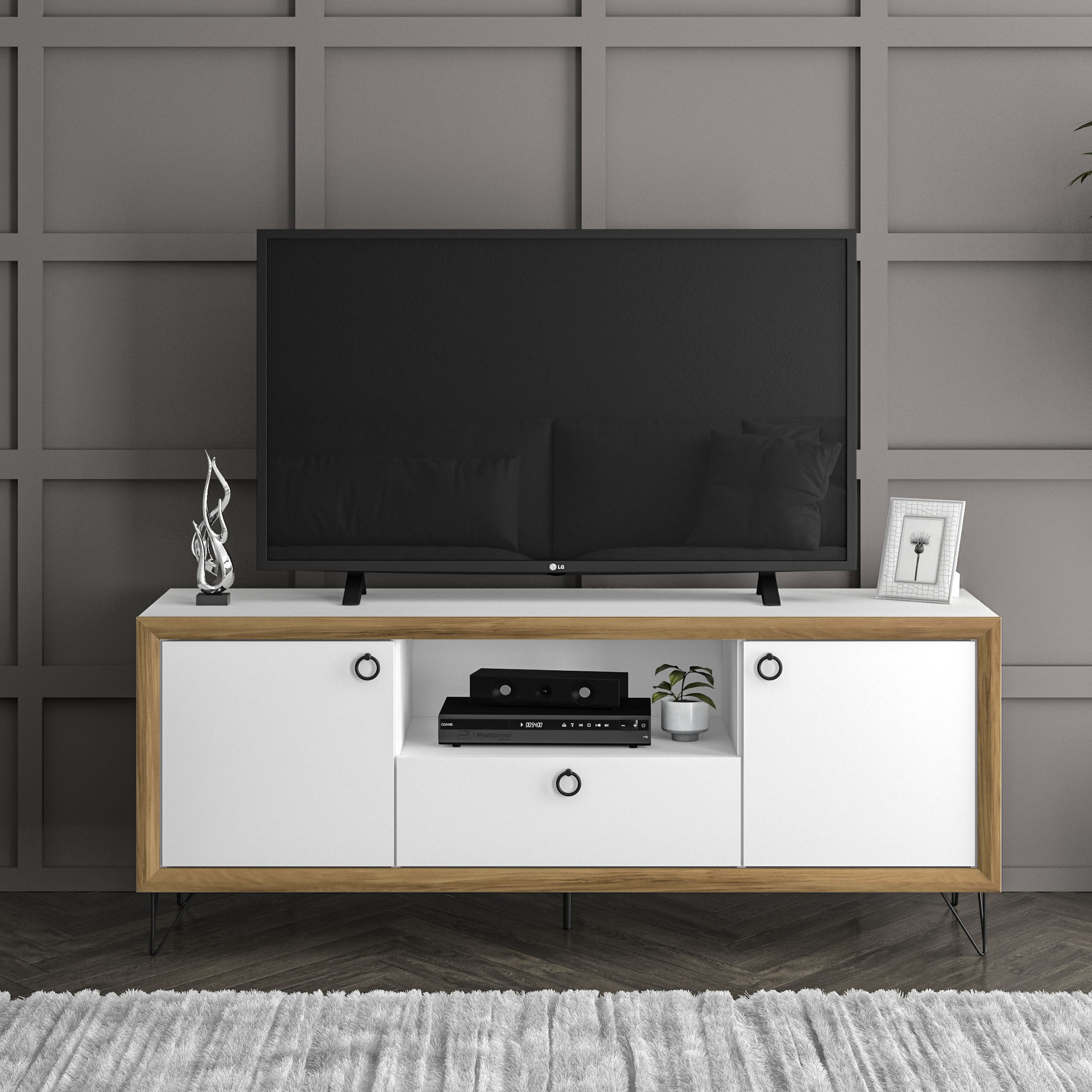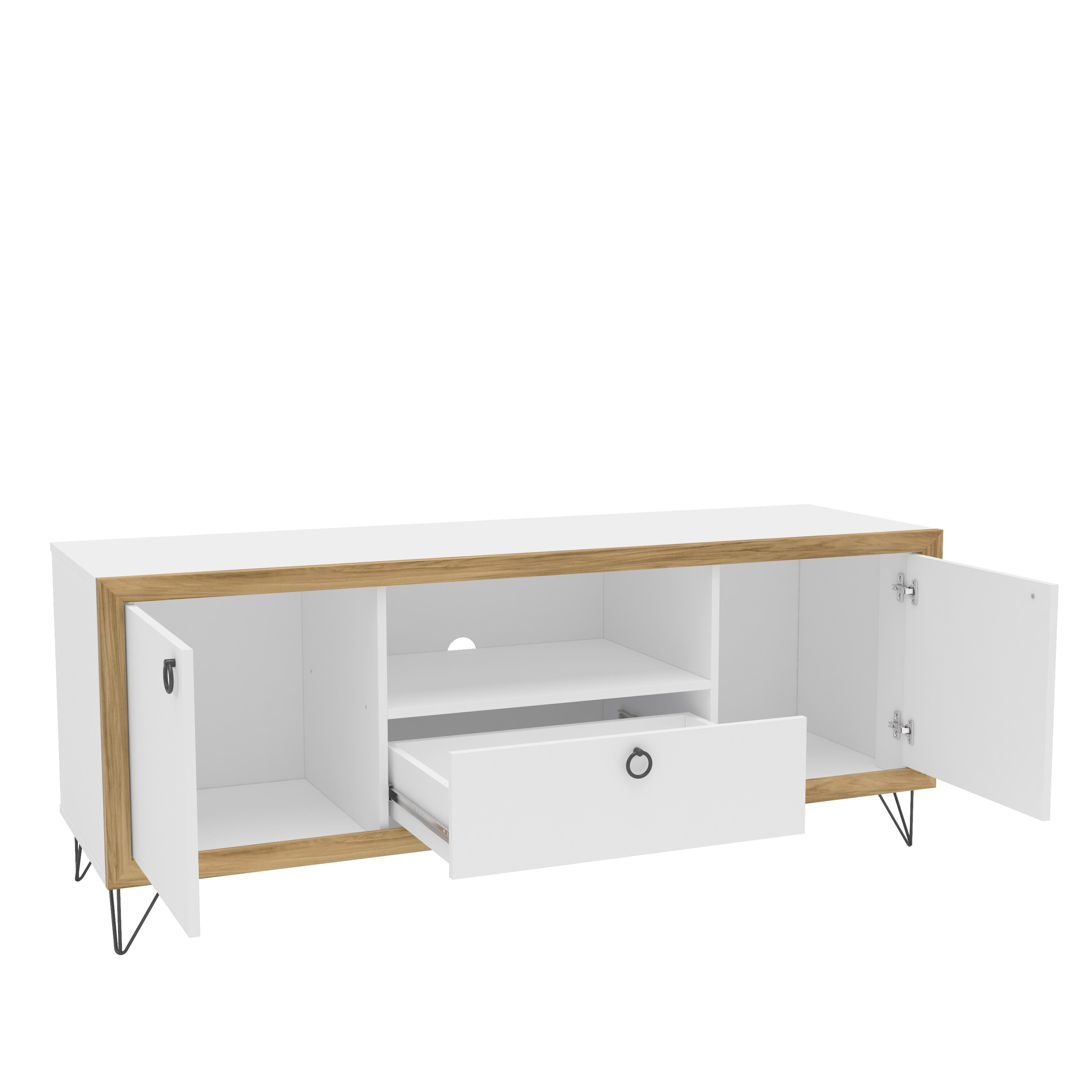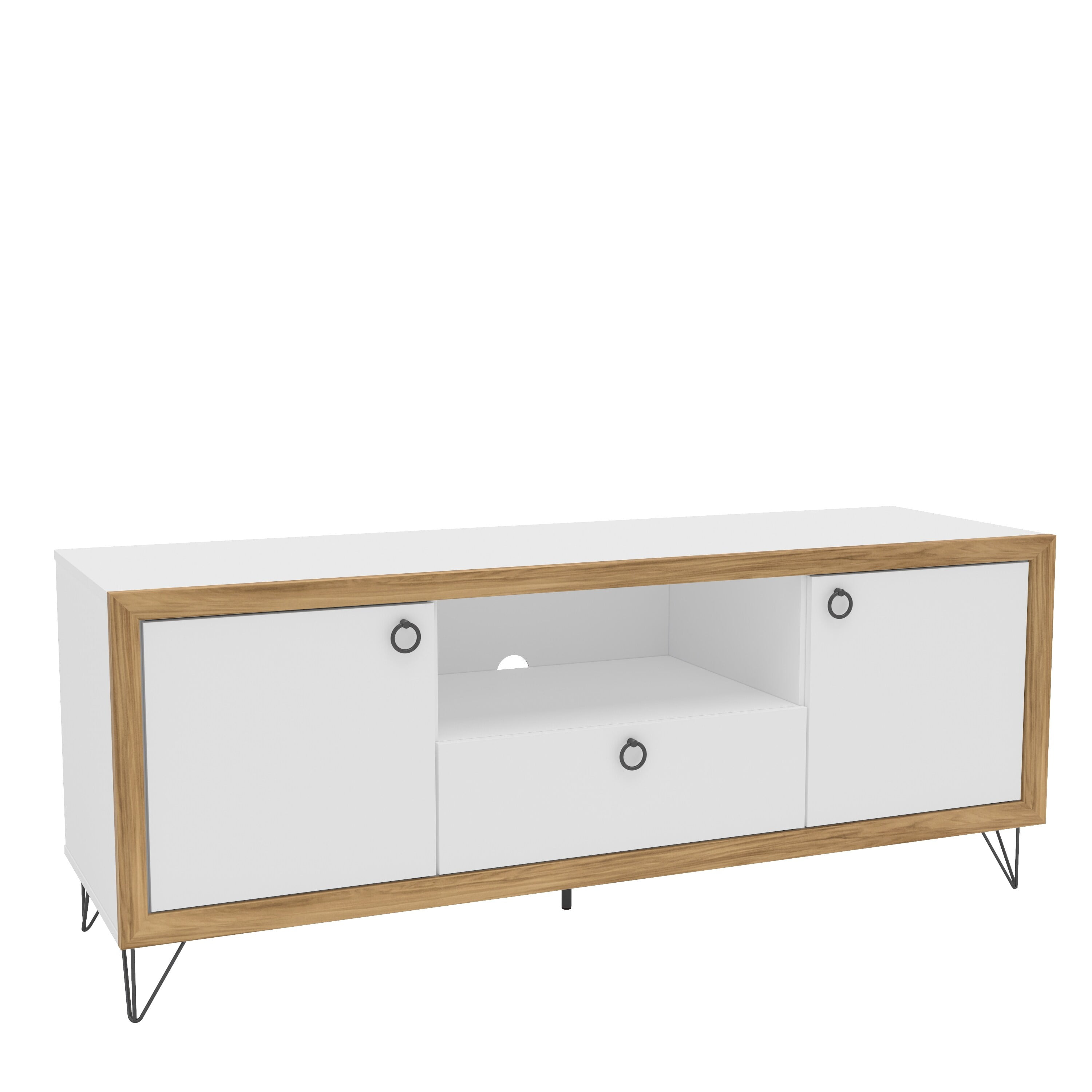 Melamine finish is scratch, stain and water resistant Constructed from engineered wood 2 cabinets for concealed storage 1 open storage section perfect for electronic components Large drawer on metal glides Cable / cord management cutout to keep electronic wires organized Metal handles and legs Fits TVs up to 65 inches Assembly required; instructions provided Assembled dimensions: 59 in. W x 18.5 in. D x 23.5 in. H