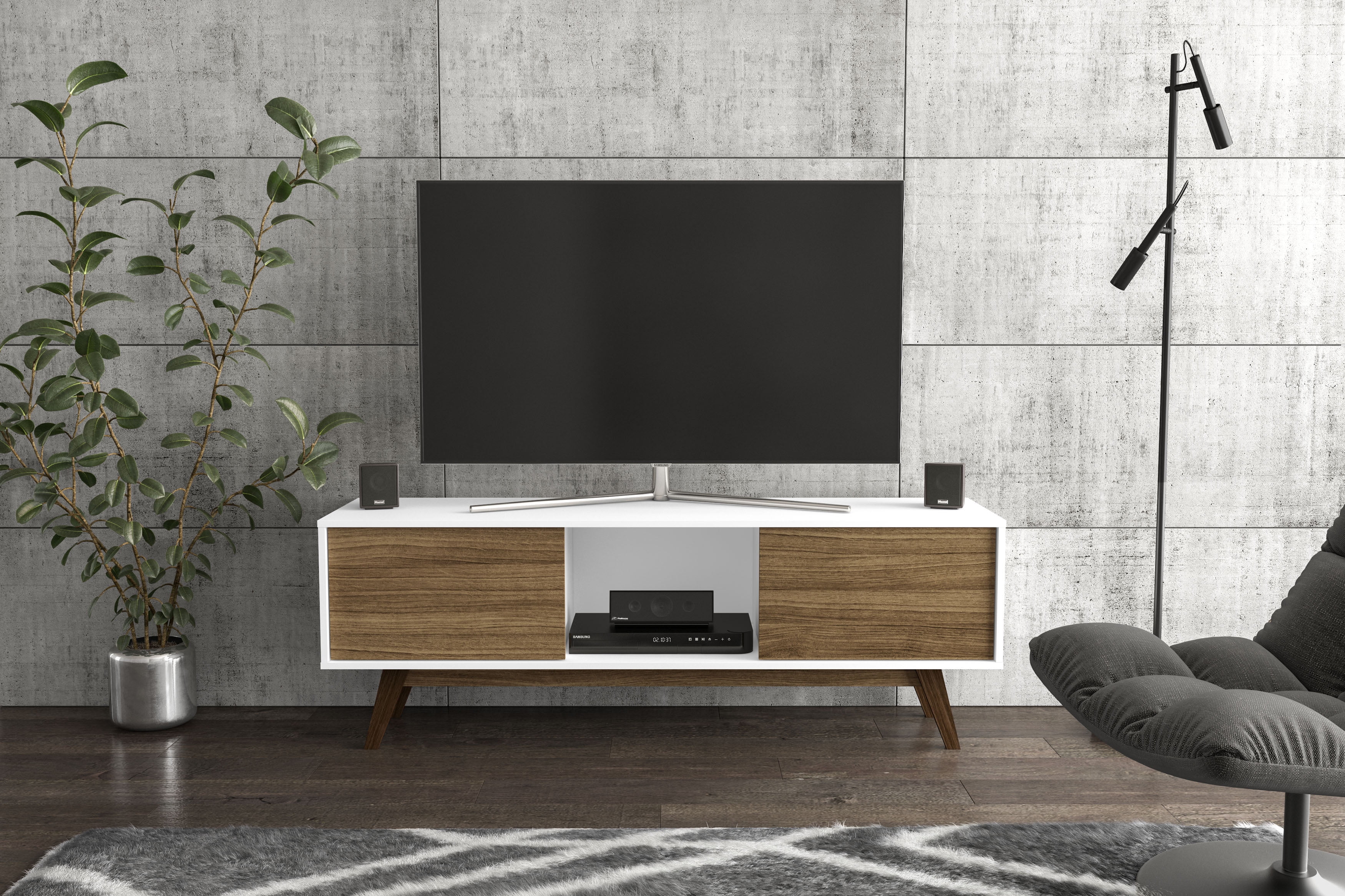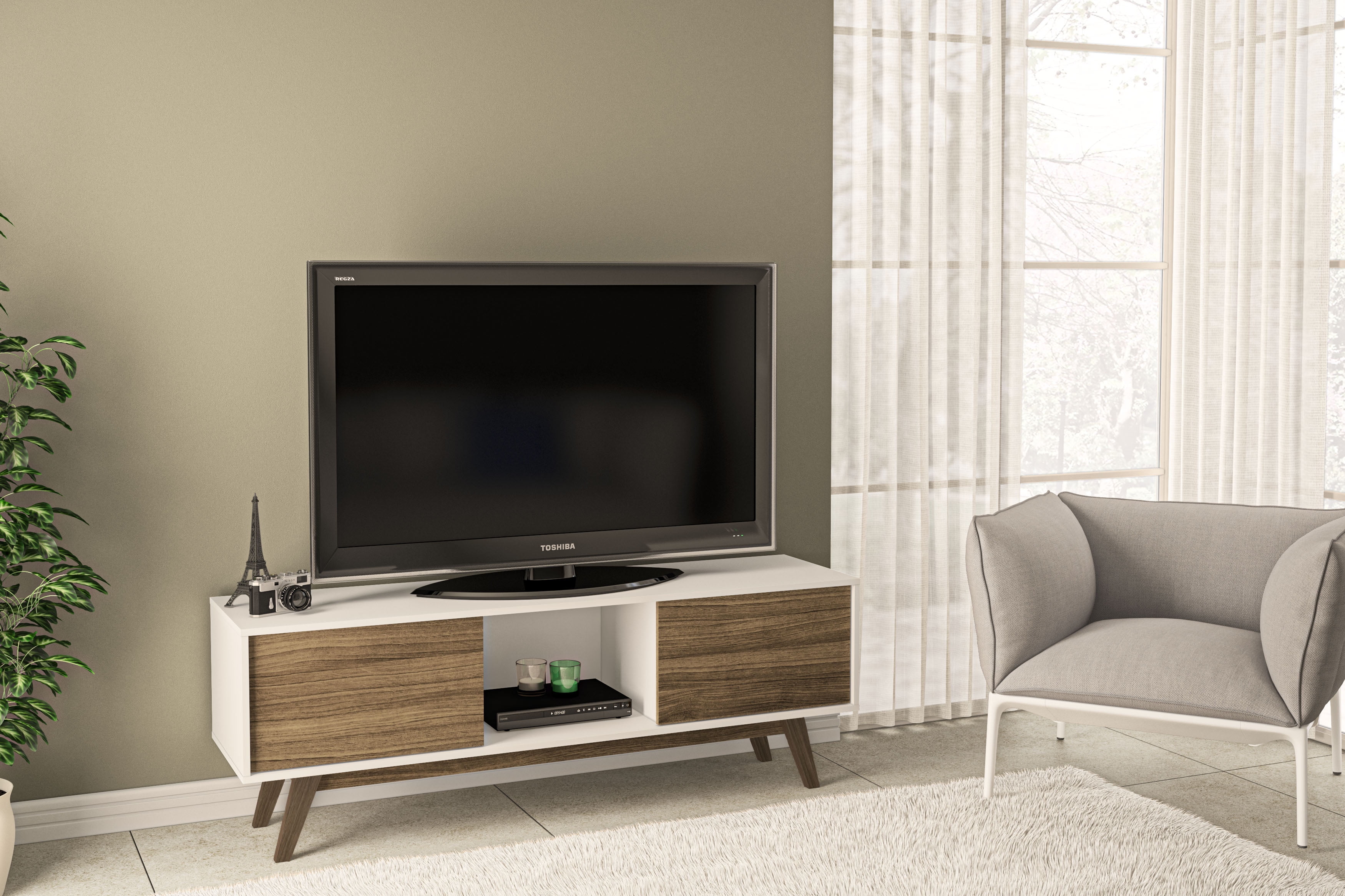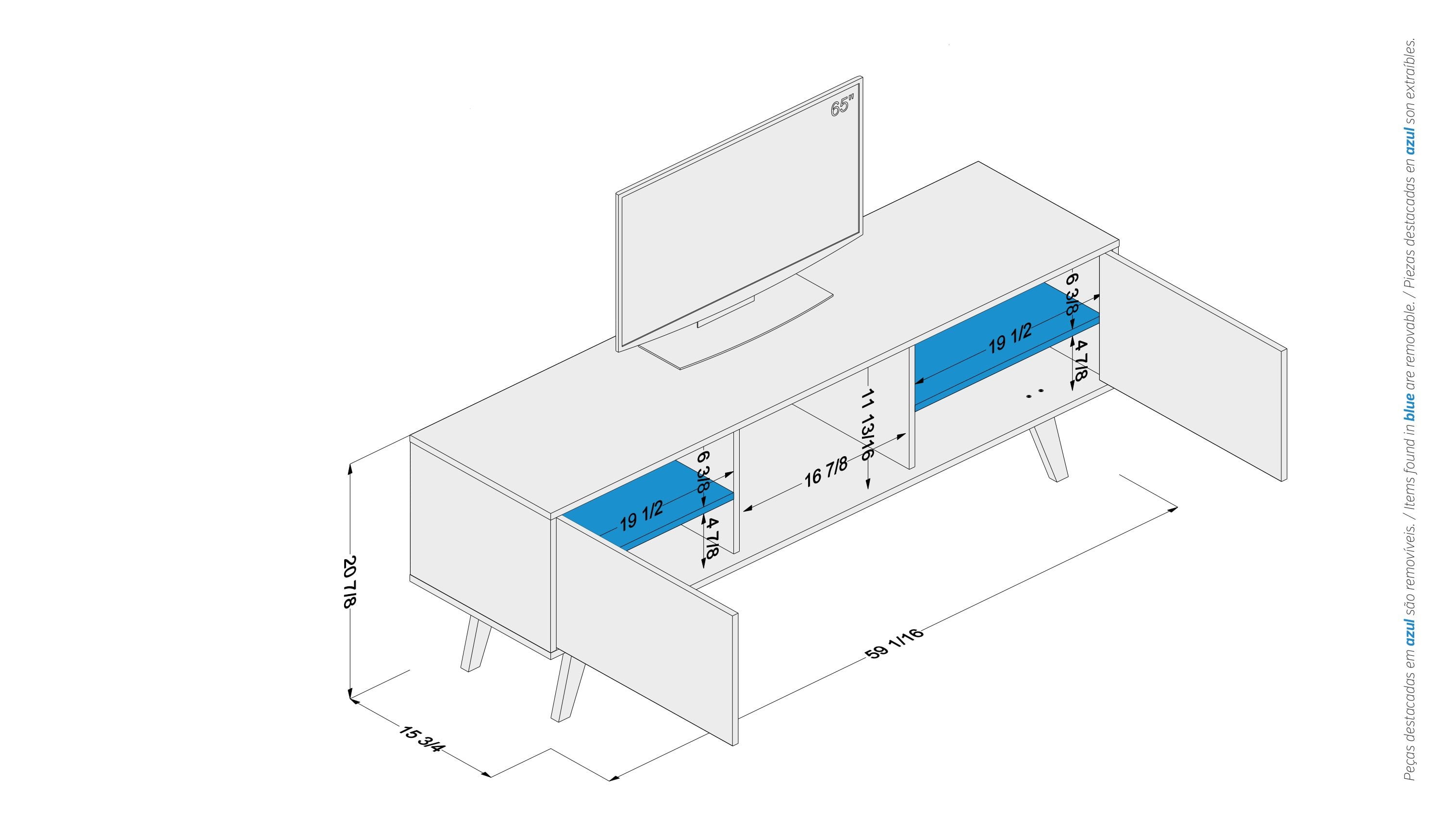 Melamine finish is scratch, stain and water resistant Constructed from engineered wood 2 cabinets provide concealed storage 2 removable shelves allow you to customize your storage space Open storage section perfect for electronic components Cable / cord management cutout to keep electronic wires organized Fits TVs up to 65 inches Modern wood legs Assembly required; instructions provided Assembled dimensions: 59 in. W x 15.75 in. D x 20 in. H