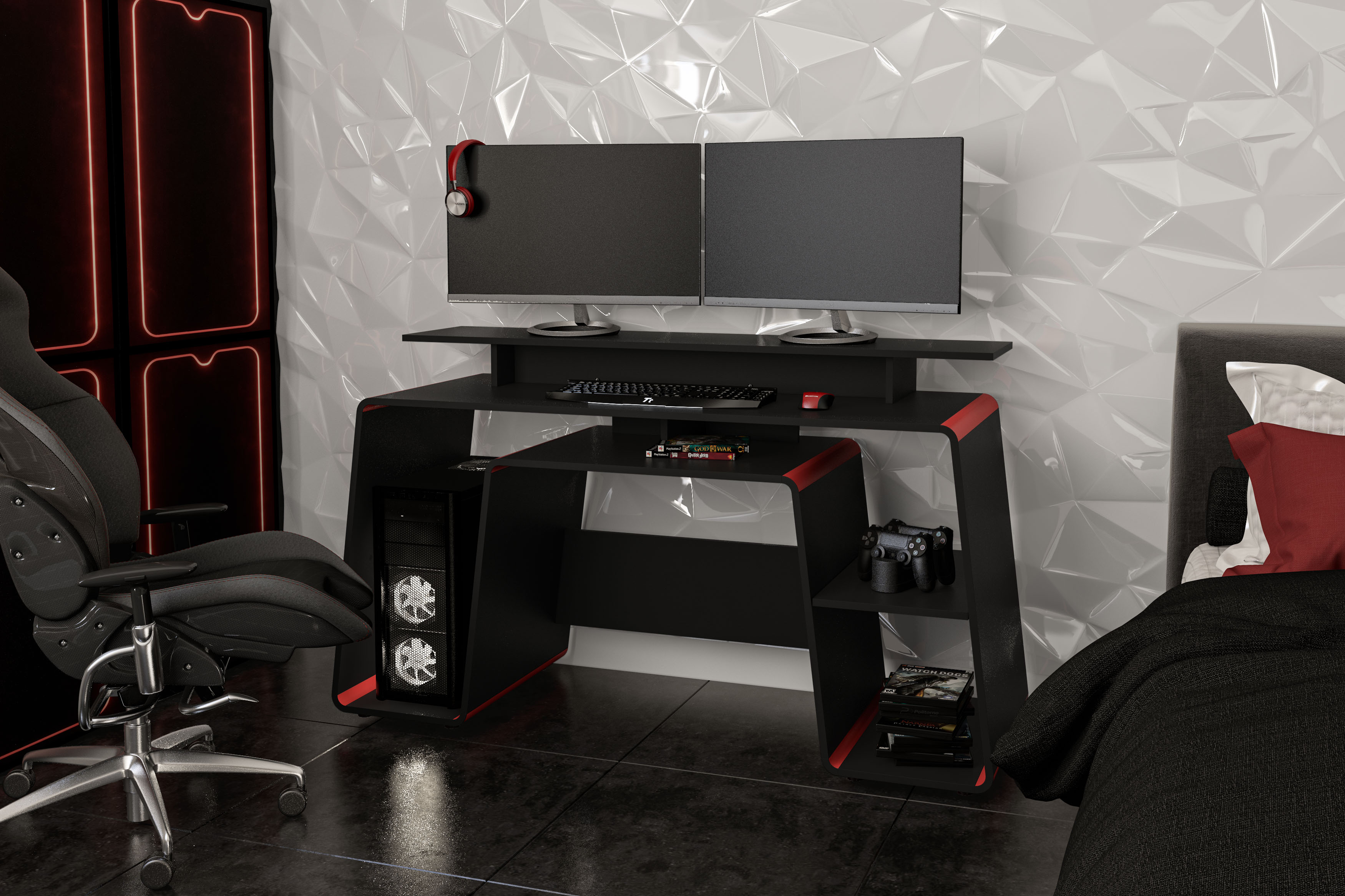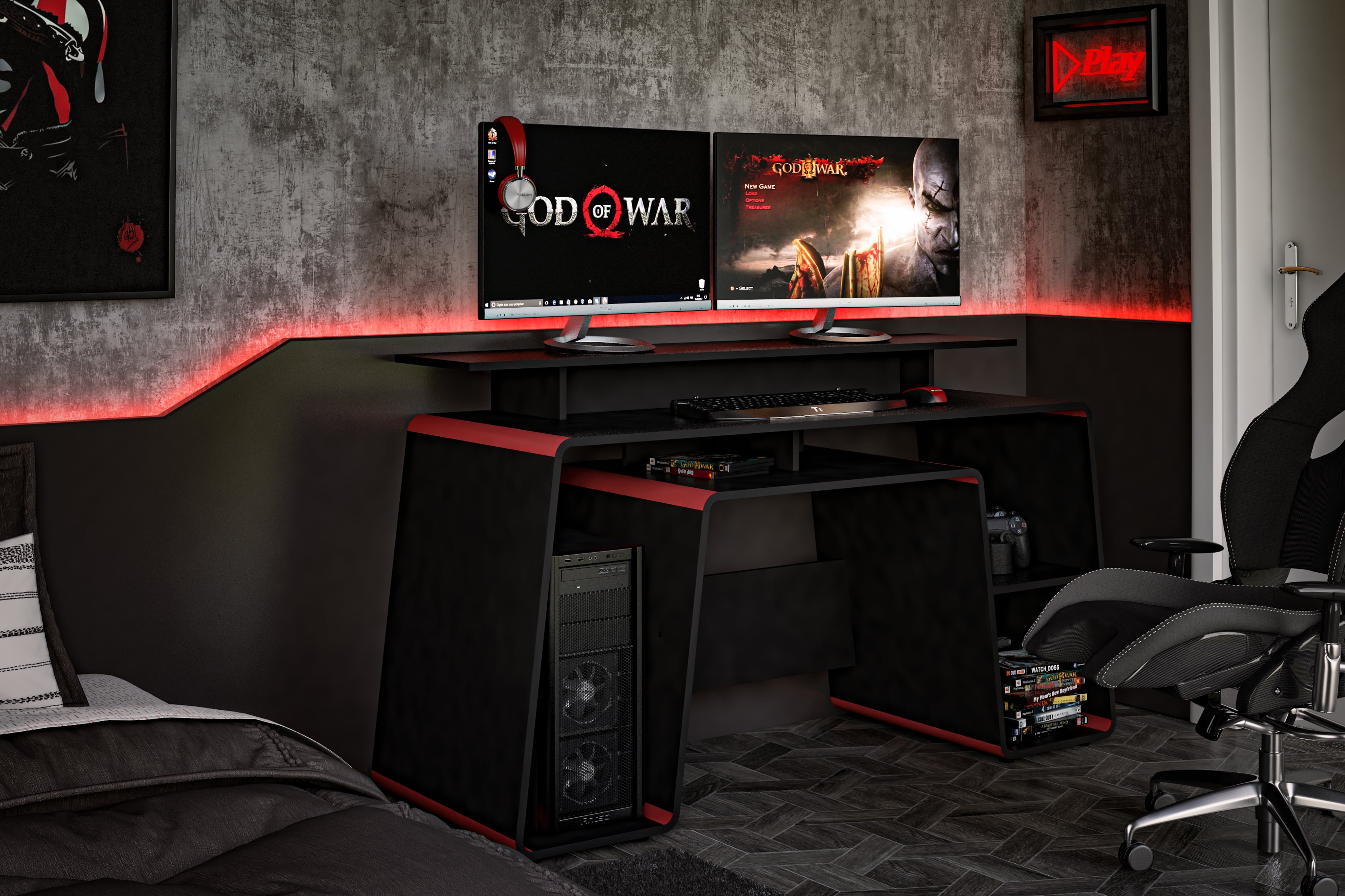 Polifurniture San Diego 57 in. Computer Gaming Desk with Storage, Black and Red Finish