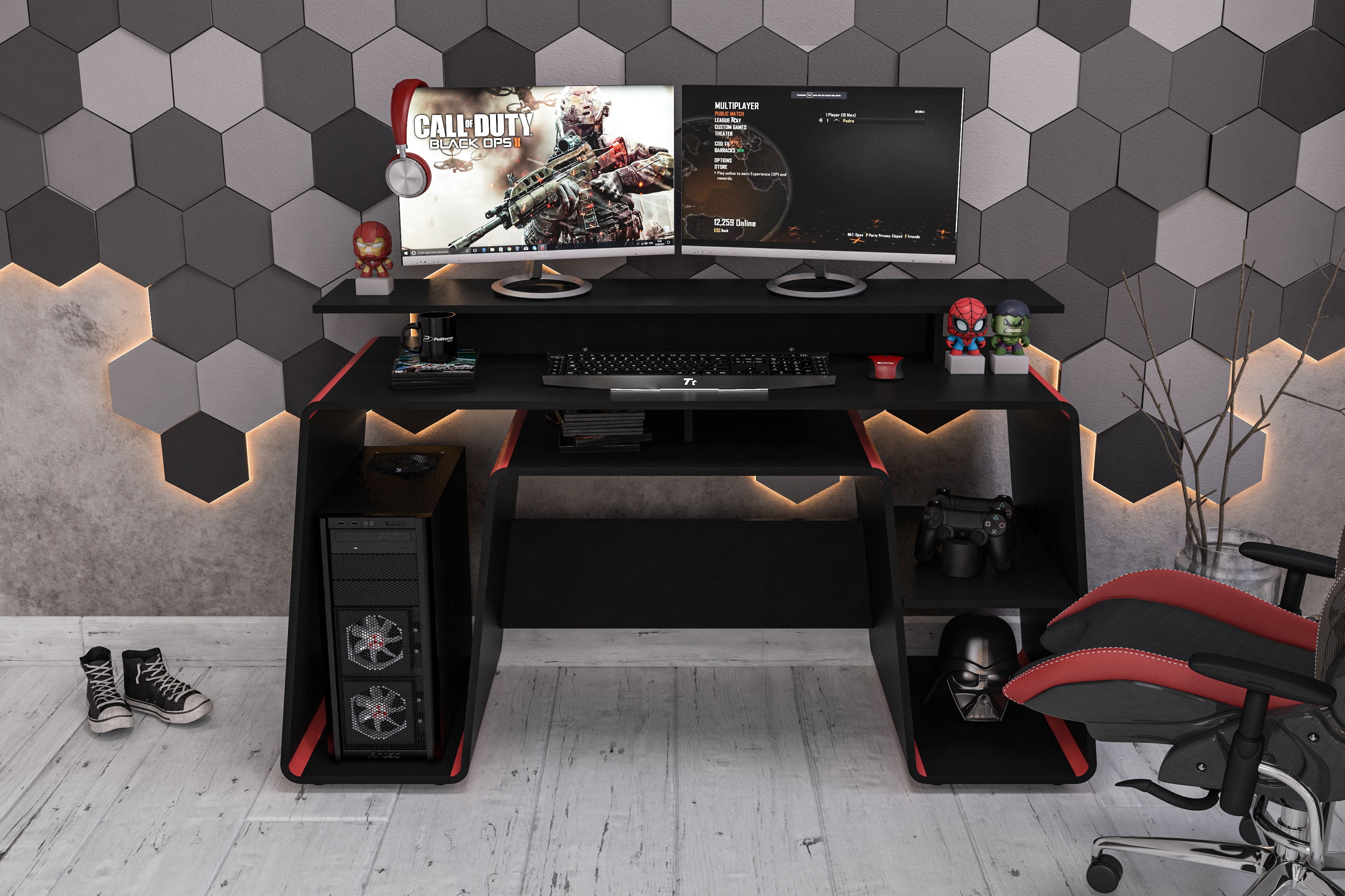 The San Diego Gaming Desk from Polifurniture was designed to provide you with the best gaming experience. This gaming desk comes in a red and black finish and is constructed from engineered wood with a melamine finish to protect against everyday use. This gaming desk has a wide rectangular desktop that provides plenty of space for all your gaming components. The elevated shelf measures 53 in. wide and will easily fit two monitors. There also are multiple open shelves that provide plenty of storage and 1 shelf is removable so you can customize the space to fit your needs. Assembly required. Overall assembled dimensions: 57 in. W x 21 in. D x 33 in. H.