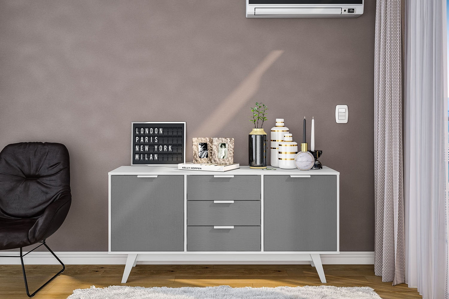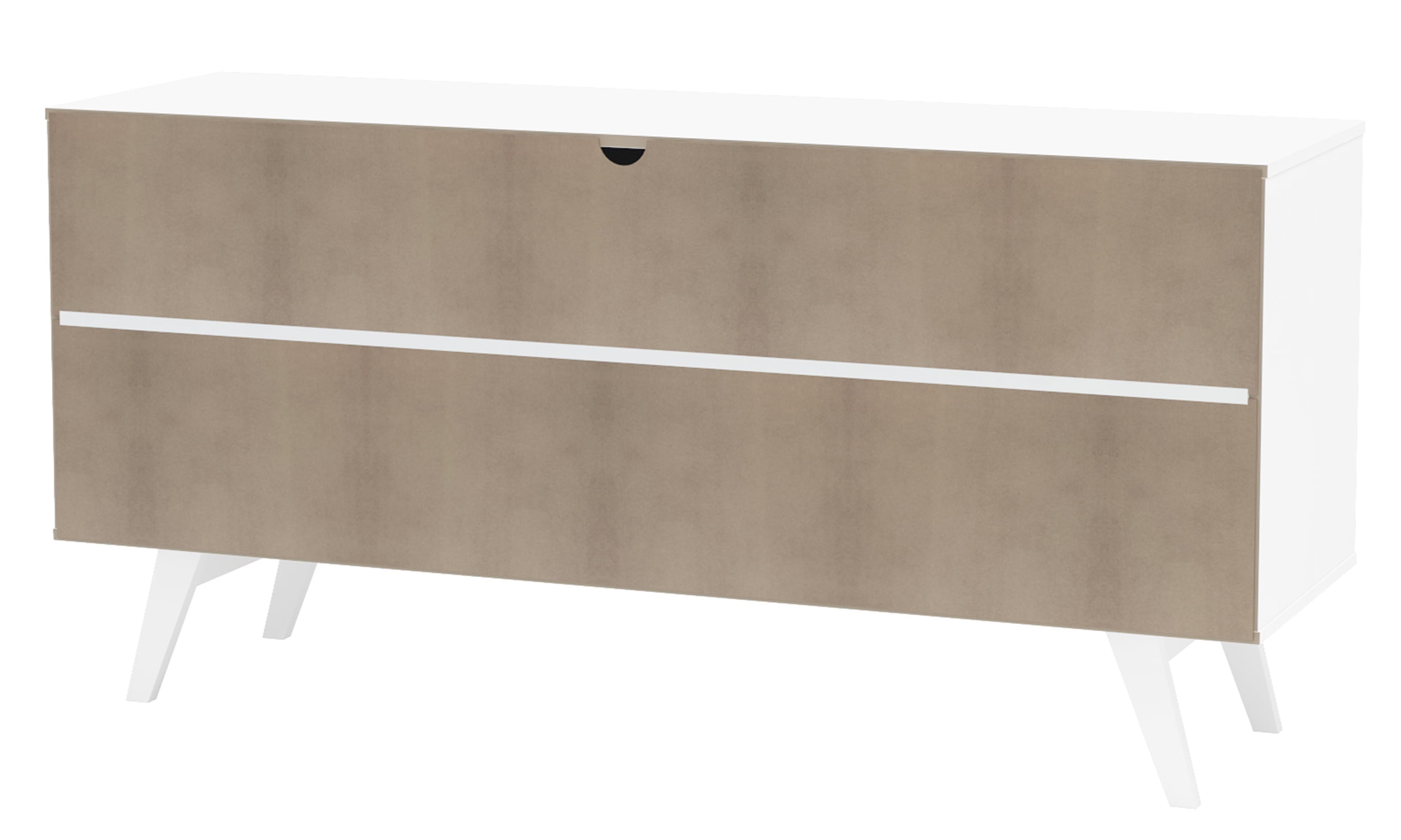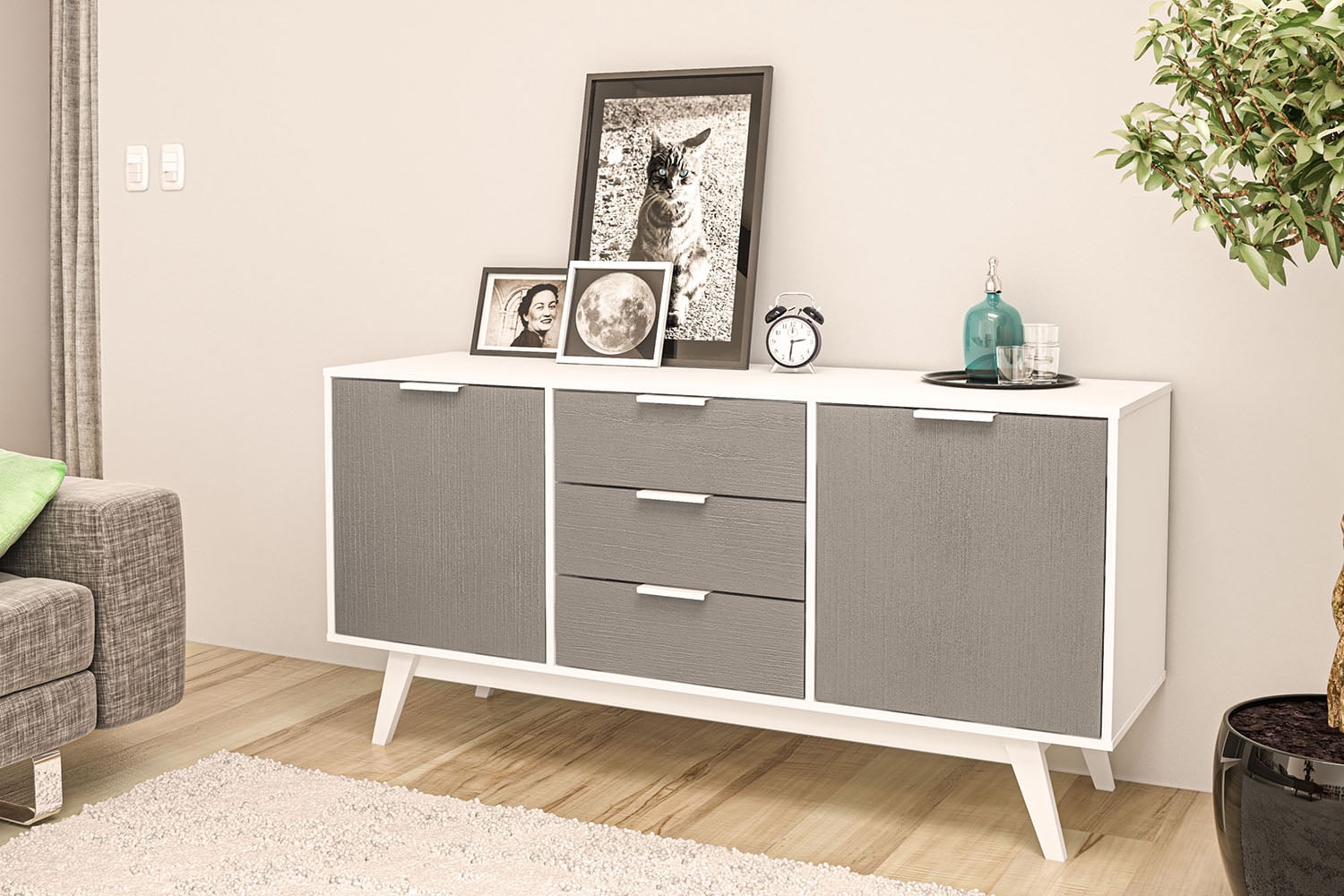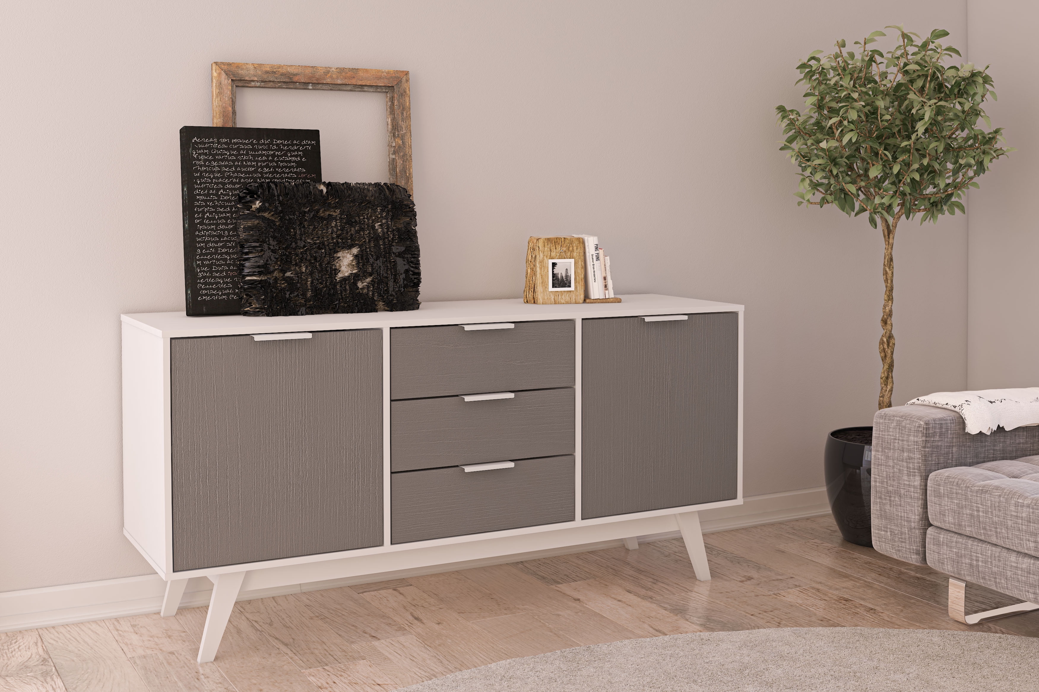 Melamine finish is scratch, stain and water resistant Constructed from engineered wood 3 large drawers on metal glides 2 spacious cabinets with 2 shelves Each shelf is removable allowing you to customize your storage space Modern design will complement any home décor Metal handles on doors and drawers Assembled Dimensions: 59 in W x 17.75 in D x 29 in H