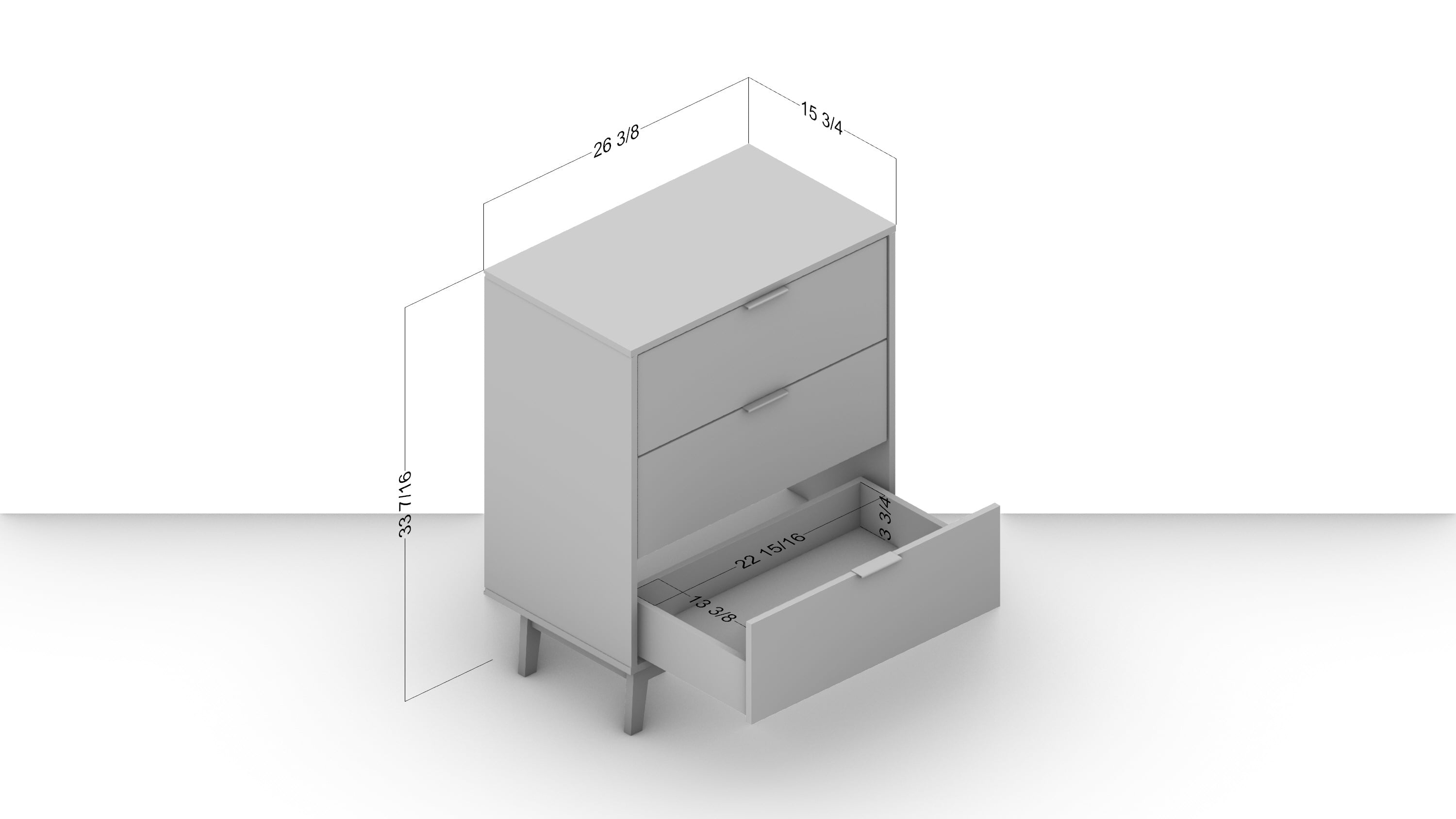 Melamine finish is scratch, stain and water resistant Constructed from high quality engineered wood 3 spacious drawers on metal glides Metal handles Modern design will complement any bedroom Available in multiple color options Pair with other items from Polifurniture’s Victoria Collection for a complete bedroom set Assembly required; instructions provided Assembled dimensions: 26.25 in. W x 15.75 in. D x 33.5 in. H