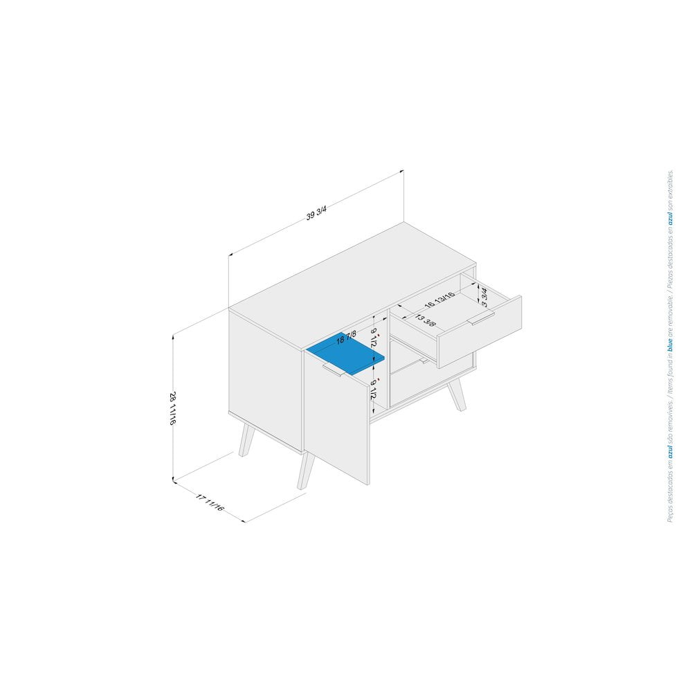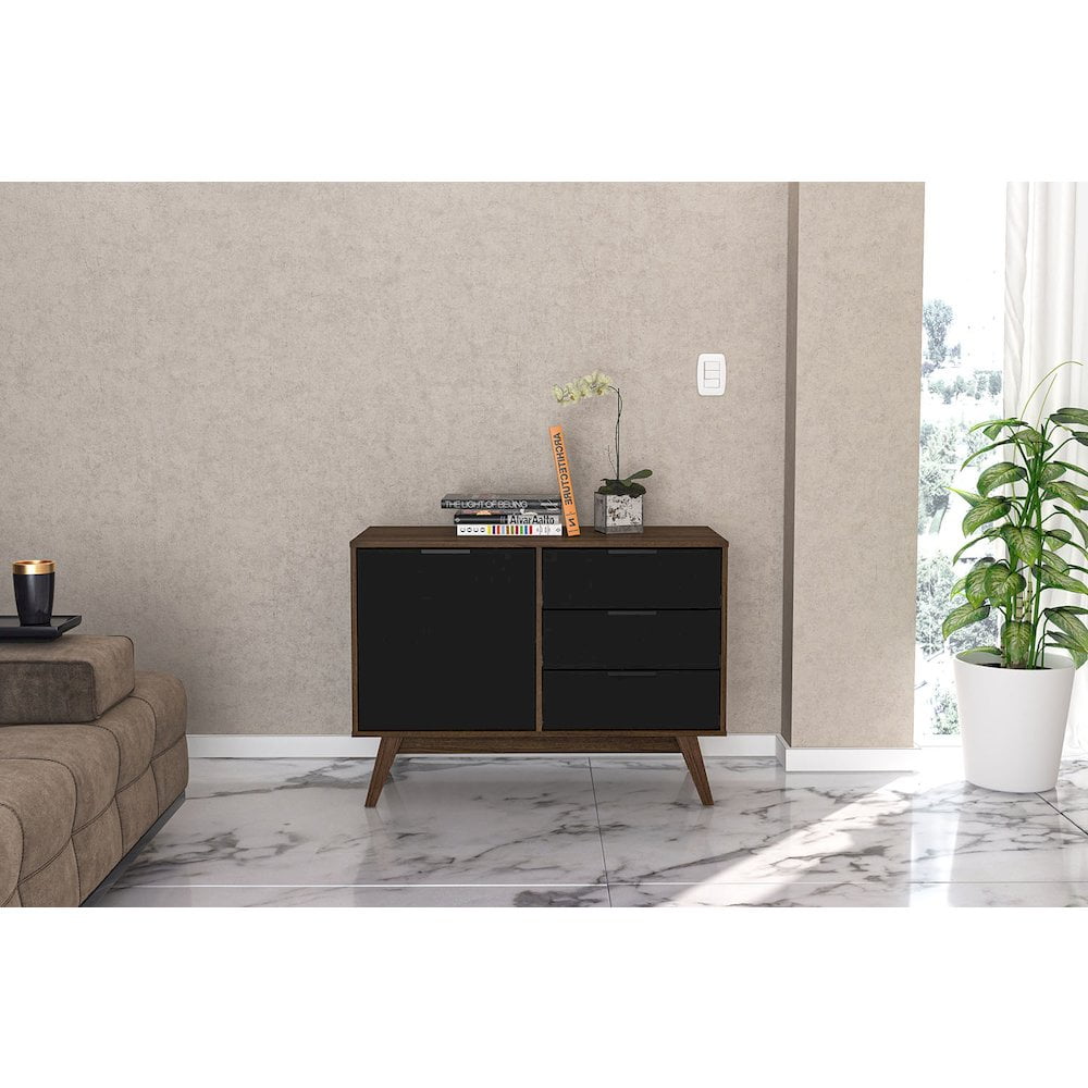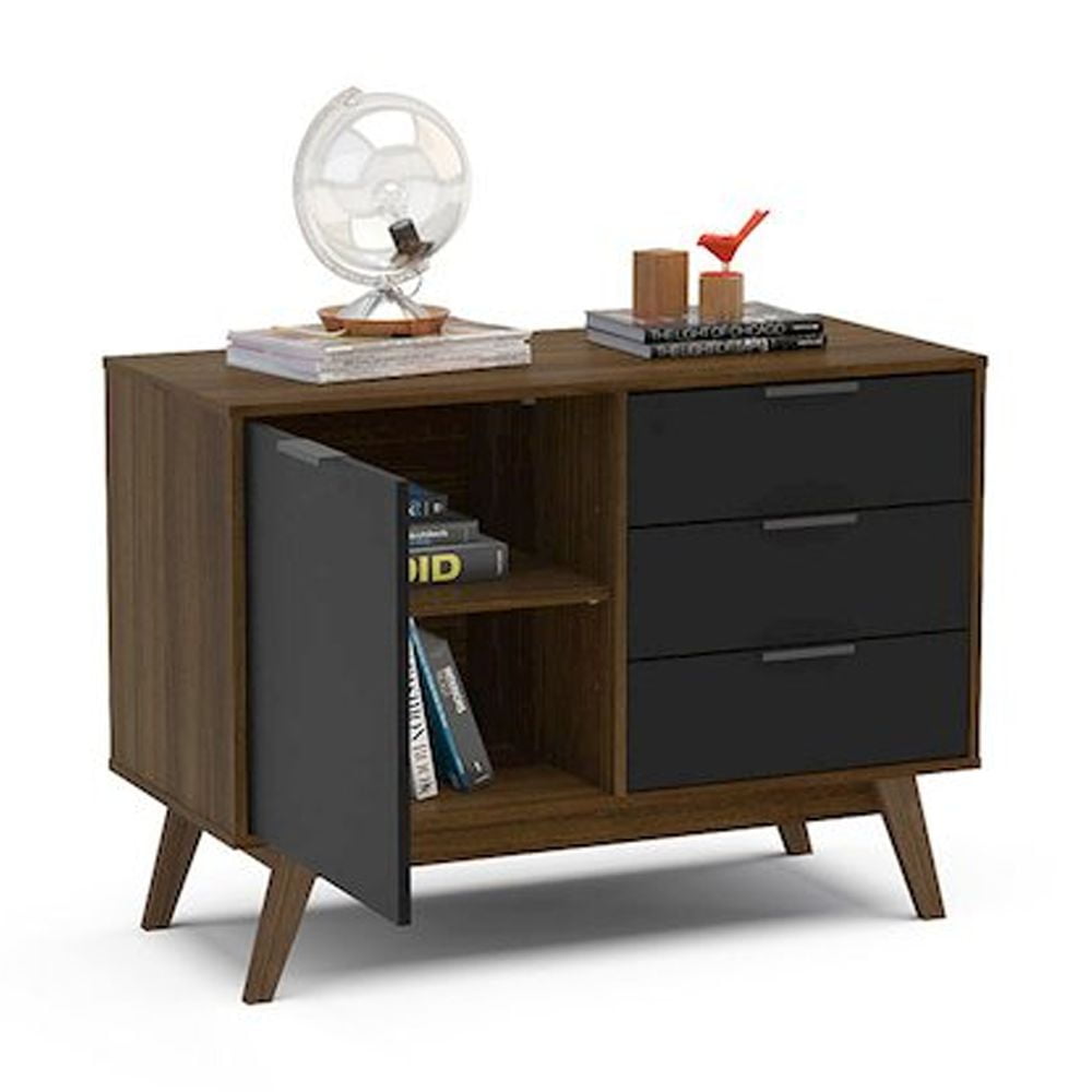 Polifurniture Zafra 1 Door Sideboard with 3 Drawers, Black & Walnut Update the look of your home and add extra storage with the Zafra Sideboard from Polifurniture. This sideboard is available in multiple color options and is constructed from engineered wood with a durable melamine finish to protect against everyday use. It has a compact design allowing it to fit into tight places while adding extra storage. The 1-door cabinet provides includes a removeable shelf so you can customize the space to fit your storage needs. The 3 drawers on metal glides provide additional concealed storage to keep your home looking neat and tidy. This modern sideboard is a great addition to your dining room, living room or any room! Melamine finish is scratch, stain and water resistant Constructed from engineered wood 1 door cabinet with removeable shelf 3 drawers on metal glides Metal handles – Design: Modern – Number of Pieces: 1 – Item Depth: 17.75 – Item Height: 29 – Item Width: 40 – Item Weight: 68 – Outdoor (Y/N): No – Item Material: Engineered Wood – Vendor Color: Black and Walnut – General Item color: Multi