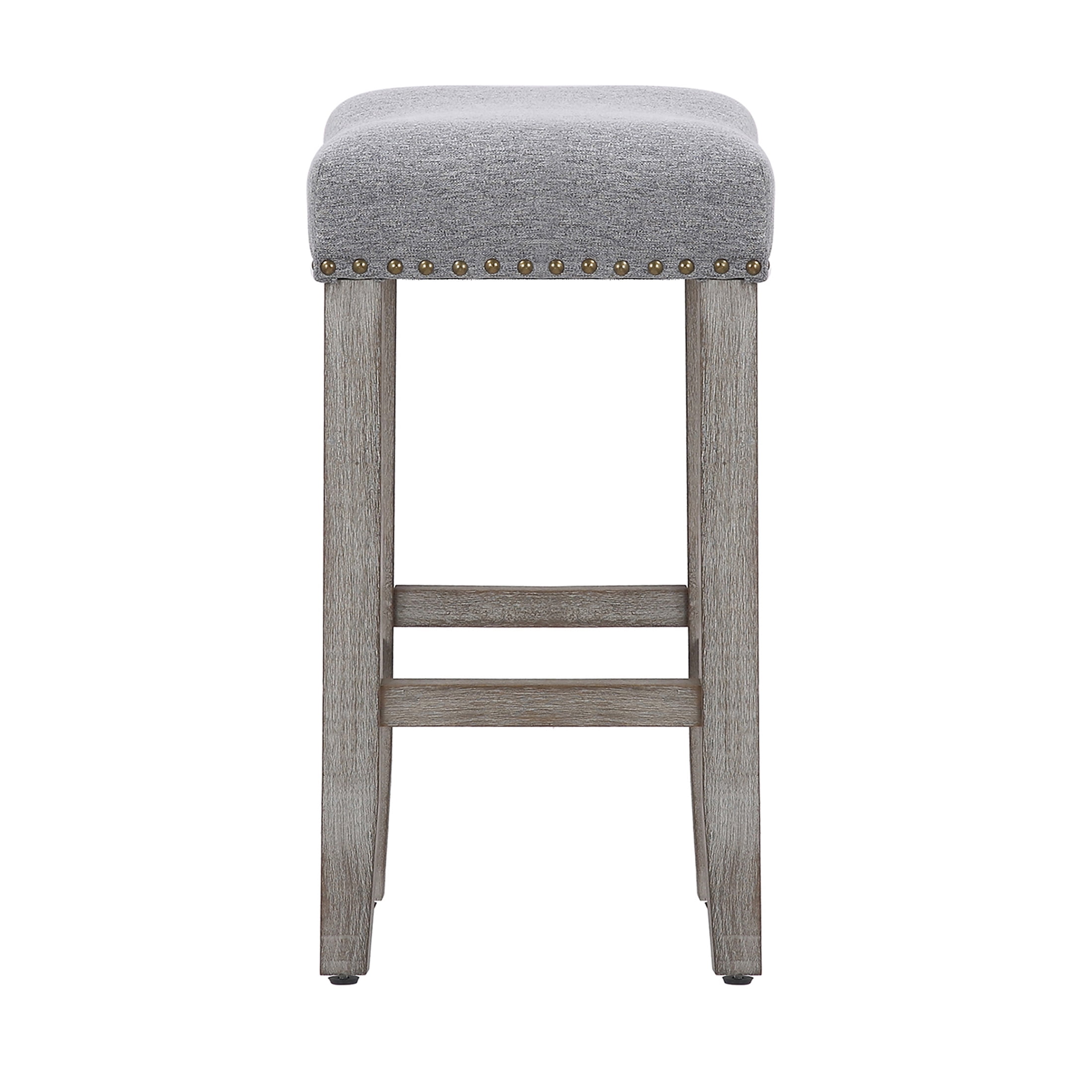 Antique Gray Solid Rubberwood Legs Add a Touch of Vintage Charm to the Design for Aesthetic Appeal Adjustable Feet Levelers Balance the Chair on Uneven Floors, Ensuring Stability Without Wobbling Saddle-Style Seat with Bronze Nail Head Trim Enhances Comfort and Style, Offering a Cozy Seating Experience with Added Visual Appeal