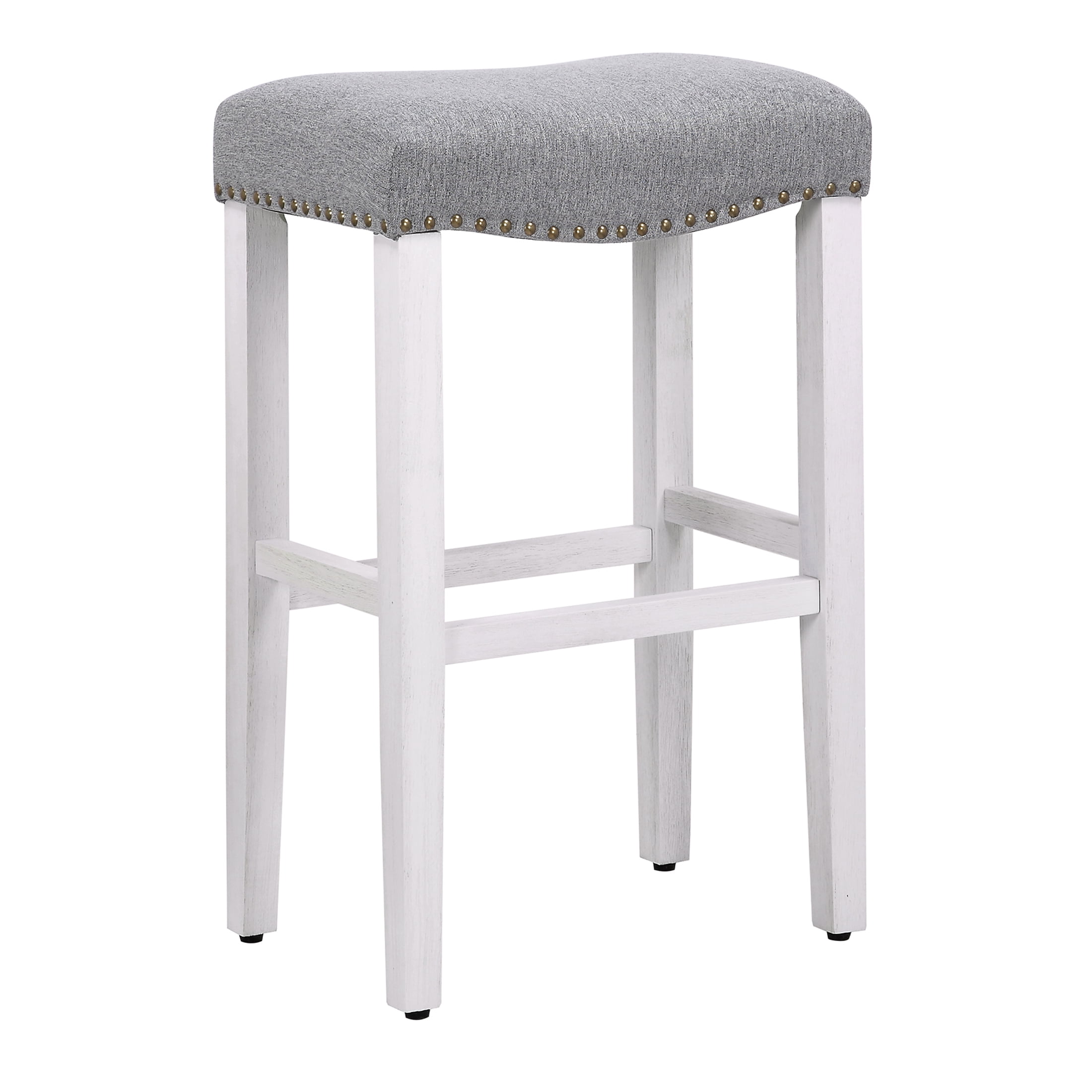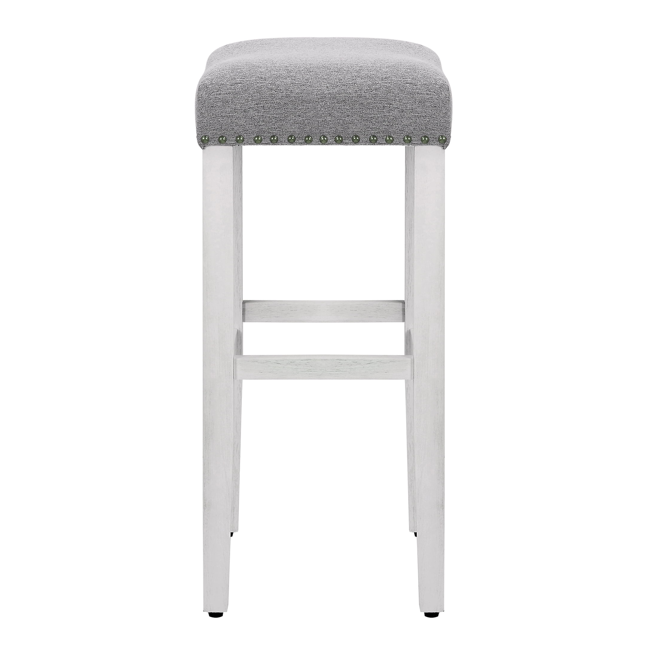 Sink into serenity with the Jameson Upholstered Polyester 29″ Bar Stool – Saddle Seat/ White Legs. Crafted for solitary comfort, this stool features antique gray solid rubberwood legs that add a touch of vintage charm. The saddle-style seat with bronze nail head trim offers an intimate seating experience, perfect for quiet reflection or enjoying a moment of personal leisure. Features: Antique White Solid Rubberwood Legs Add a Touch of Vintage Charm to the Design for Aesthetic Appeal Adjustable Feet Levelers Balance the Chair on Uneven Floors, Ensuring Stability Without Wobbling Saddle-Style Seat with Bronze Nail Head Trim Enhances Comfort and Style, Offering a Cozy Seating Experience with Added Visual Appeal Solid Rubberwood Frame and Legs Ensure Lasting Durability and Stability for Reliable Support Generously Padded with Dense Polyurethane Foam for Comfort and Resilience S-Shaped Springs and Elastic Construction Ensure Long-Lasting Shape and Support Dimensions: Assembled Dimensions: 18.5″ W x 13.2″ D x 29″ H Seat Height – Floor to Seat: 29″ Seat Width: 18.5″ Seat Depth: 13.4″ Additional Details: Item Weight: 12.2 lbs. Weight Capacity: 260 lbs. Recommended Uses: Bar Stool