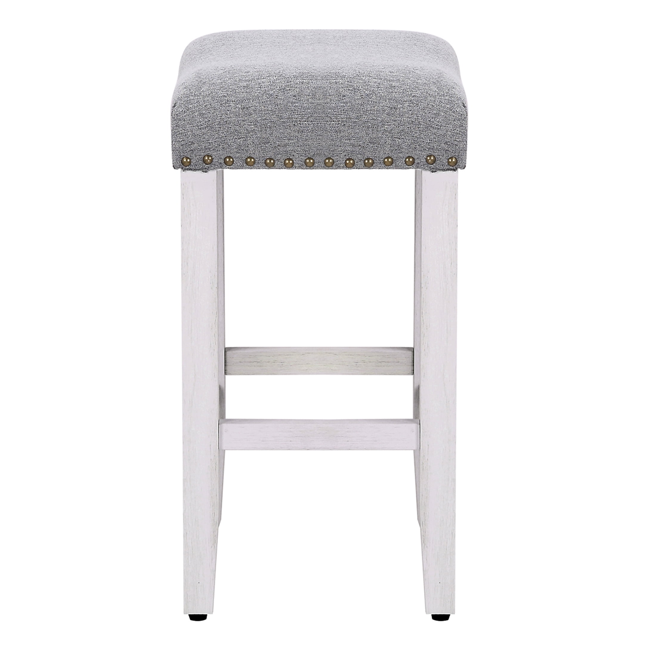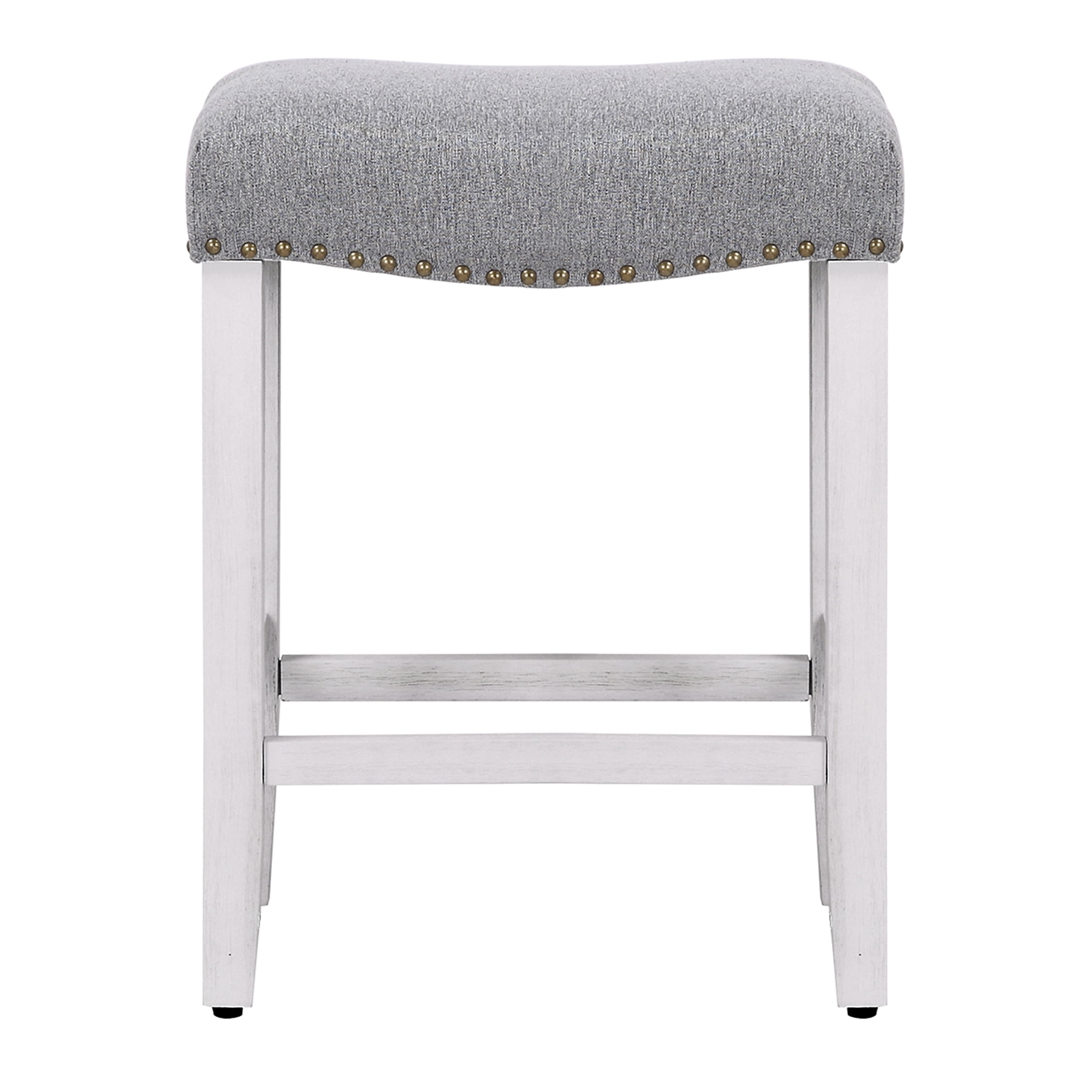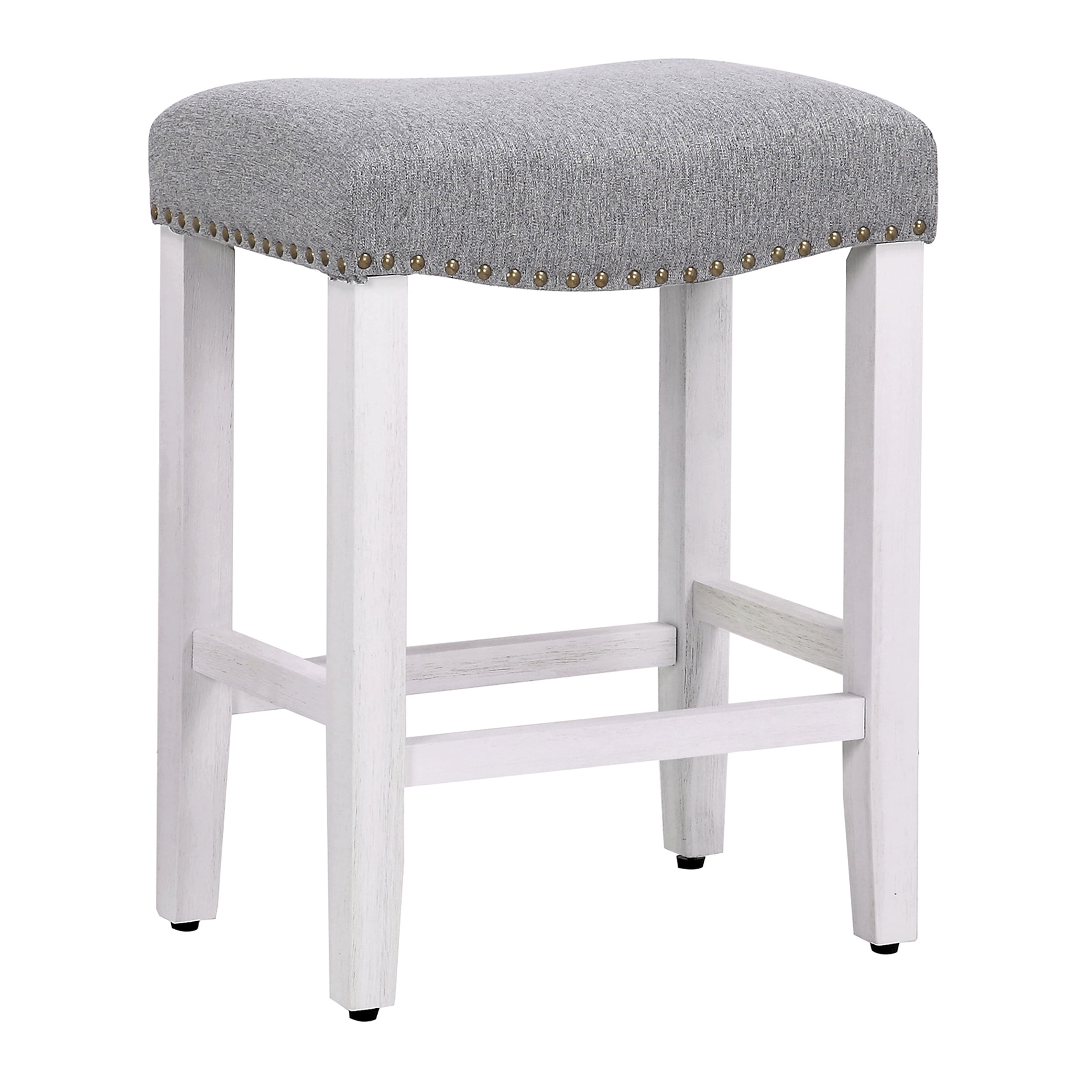 Create a space for private conversations with the Jameson Upholstered Polyester 24″ Counter Stool with White Legs – (Set of 2). The dense polyurethane foam padding ensures comfort and resilience, while the antique white solid rubberwood legs add a touch of elegance. Whether you’re sharing heartfelt talks or simply enjoying each other’s company, these stools provide the perfect seating experience for cozy togetherness. Features: Set Includes: Two (2) Jameson 24″ Saddle Seat Bar Stools Antique Gray Solid Rubberwood Legs Add a Touch of Vintage Charm to the Design for Aesthetic Appeal Adjustable Feet Levelers Balance the Chair on Uneven Floors, Ensuring Stability Without Wobbling Saddle-Style Seat with Bronze Nail Head Trim Enhances Comfort and Style, Offering a Cozy Seating Experience with Added Visual Appeal Solid Rubberwood Frame and Legs Ensure Lasting Durability and Stability for Reliable Support Generously Padded with Dense Polyurethane Foam for Comfort and Resilience S-Shaped Springs and Elastic Construction Ensure Long-Lasting Shape and Support Dimensions: Assembled Dimensions Per Stool: 18.5″ W x 13.4″ D x 29″ H Seat Height – Floor to Seat Per Stool: 29″ Seat Width Per Stool: 18.5″ Seat Depth Per Stool: 13.4″ Additional Details: Item Weight Per Stool: 11 lbs. Weight Capacity Per Stool: 260 lbs. Recommended Uses: Counter Stool, Art Stool, Bar Stool