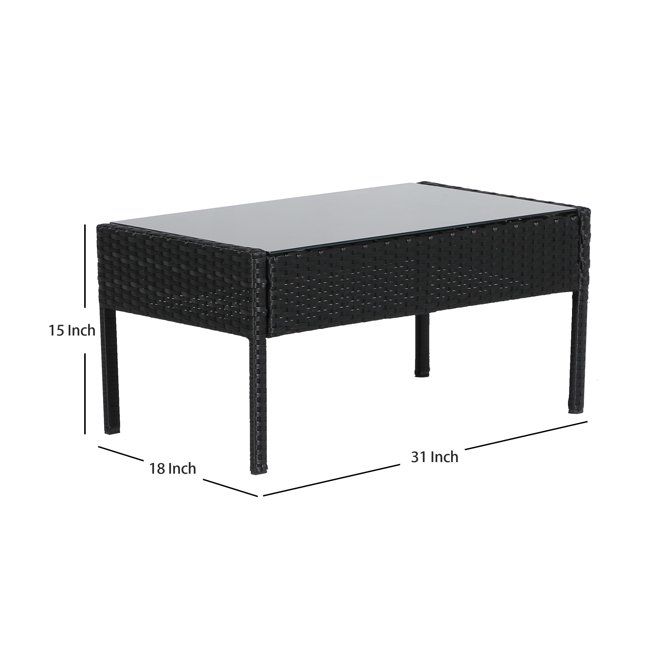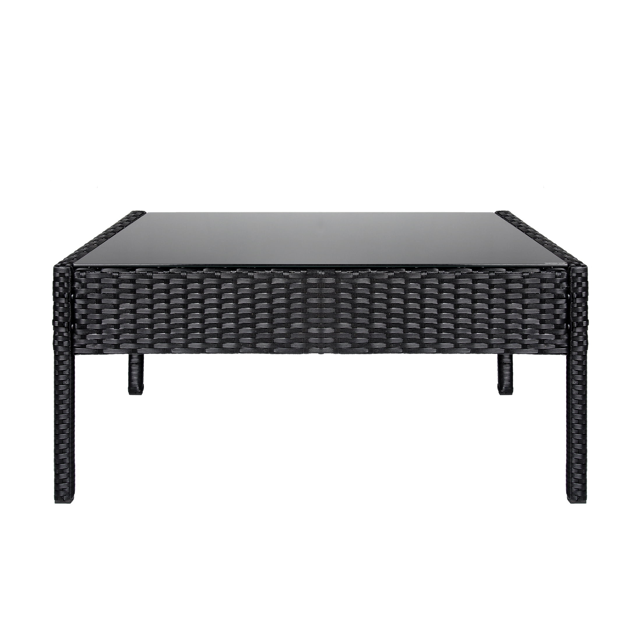 1 loveseat, 2 arm chairs, and 1 coffee table Rust-resistant steel frame with powder coating All-weather resin woven wicker