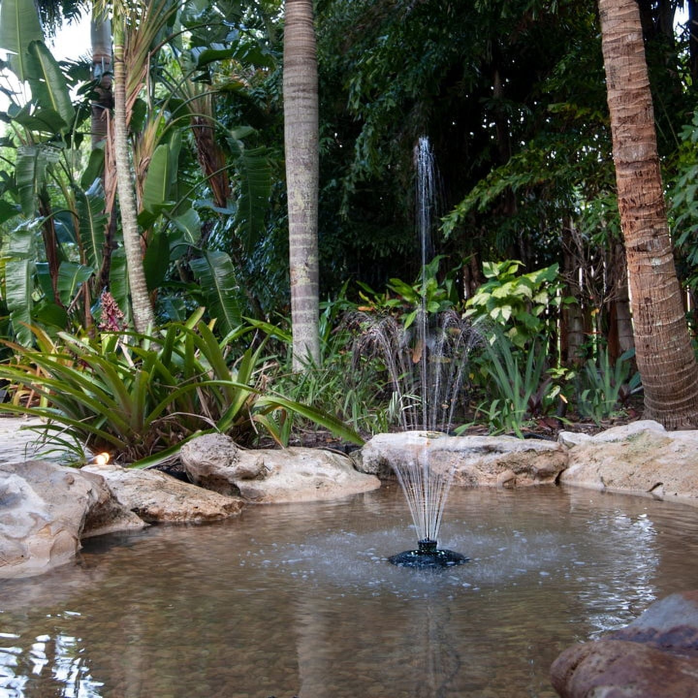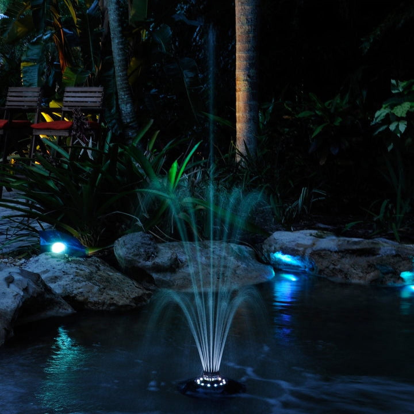 The pond boss Floating Fountain with White LED Lights is a 3-in-1 decorative pond system that pumps, aerates, and illuminates water in ponds up to 750 gallons Simply place in your pond, plug in, and enjoy Creates water effects up to 5.25 ft in height and 3.3 ft in diameter LED lights illuminate the water for a beautiful glow effect Built-in automatic dusk to dawn sensor shuts off the lights during the daytime and turns them back on at night Includes protective mesh barrier bag to prevent debris from clogging the pump Anchor ring allows you to secure the fountain in your pond Includes: ETL-listed 400 GPH pump, a float body with an integrated dusk-to-dawn sensor, light ring with 12 white LED lights, a waterspray nozzle, and a pumpshield® mesh barrier bag Product dimensions: 11 x 11 x 11 in.