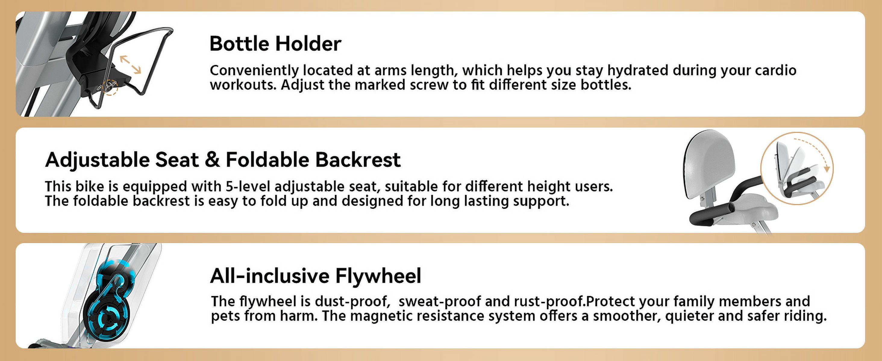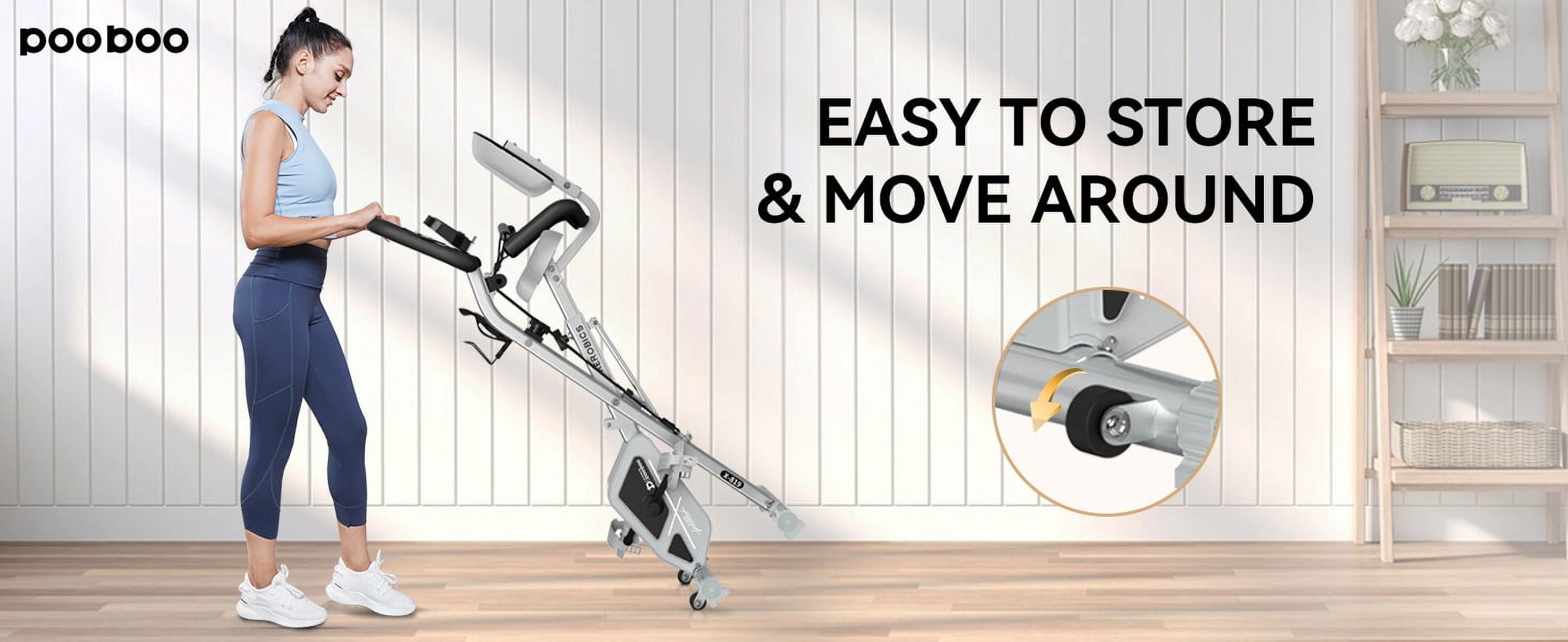 【4-IN-1 Folding Exercise Bike for Home Workout】The upright posture of this bike provides you with high-intensity exercise, helping you burn more calories. The semi-recumbent posture offers a low-impact and more comfortable riding experience. Additionally, this bike comes with arm resistance bands to help tone your upper muscles and provide a complete body workout. 【Bottle Holder】We’ve intentionally added a Bottle Holder to this bike, which is something that other X-BIKE models don’t have. Conveniently located at arm’s length, it helps you stay hydrated during your cardio workouts. The adjustable size design accommodates different bottle types. 【Compact Design & Easy to Move】The folding exercise bike is extremely suitable for the small living room because it doesn’t take up too much space. And it can be fully folded up to occupy minimal space for storage when not in use. It comes with transport wheels for you to move this exercise bike easily from room to room in your home gym. 【Stable & Suitable for Different Heights】This foldable fitness stationary bike is constructed with thicker, higher-quality steel, supporting a maximum load of 300 pounds. Its stable triangle structure ensures safety during intense workouts. The recommended user height for this bike ranges from 4’11” to 6’3″. Please refer to the image on the page for instructions on fully unfolding the bike and correctly placing the PIN. 【8-Level Adjustable Magnetic Resistance】The upright indoor cycling bike offers a wide range of adjustable resistance levels. We utilize silent and smooth magnetic flywheels to ensure a noise-free home exercise experience. The 8-level magnetic resistance adjustment caters to your diverse fitness needs. 【Multifunctional LCD Display & iPad Holder】Our LCD monitor tracks your time, speed, distance, calories burned, and heart rate while you cycle, providing you with real-time exercise data. You can also place your phone or iPad on the holder and enjoy your favorite shows while working out. What a fun way to stay motivated! 【Oversized Adjustable Seat Cushion】 With the aim of enhancing the home fitness experience, we have incorporated a large, soft seat cushion to offer you the utmost comfort and support. Thanks to the adjustable seat, it accommodates most members of your family. 【Great Gift for Your Family/Friends】The POOBOO X-Bike is a MUST-HAVE, thoughtful gift for the well-being of your loved ones. It produces minimal noise, requires little space, and is easy to assemble, move, and store. You won’t regret making this choice!