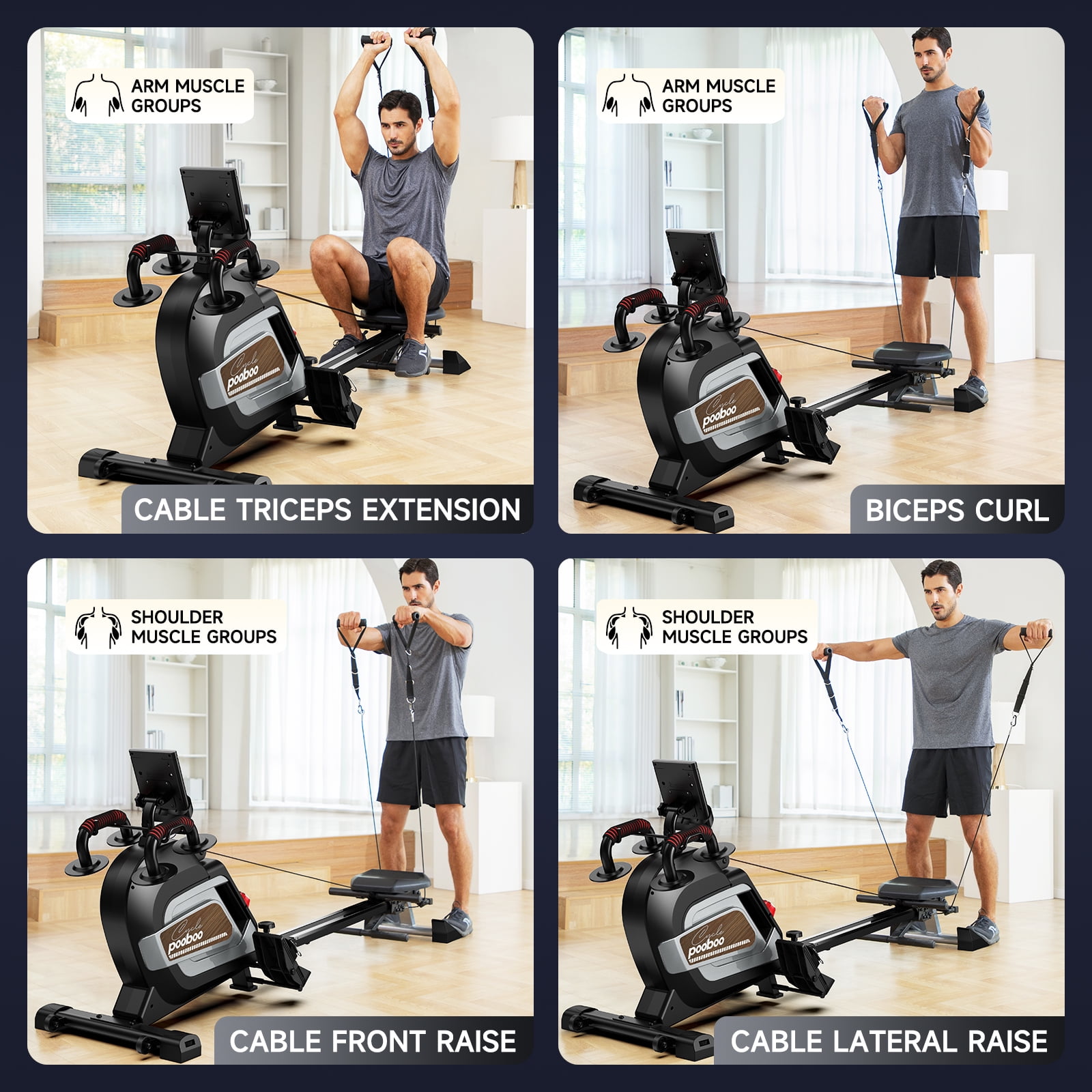 About Pooboo H015 Rowing Machine Pooboo H015 rowing machine is different for traditional rower, it added arm strength training and calf stretching for full body workout, it integrate aerobic and anaerobic exercise training. You can also use it strength workouts by completing rowing. Please note, two actions cannot be operated at the same time. H015 is pooboo newest rowing machine, which inclued 14 levels of adjustable magnetic resistance, the machine will fit for the different workout plans for beginner or expert