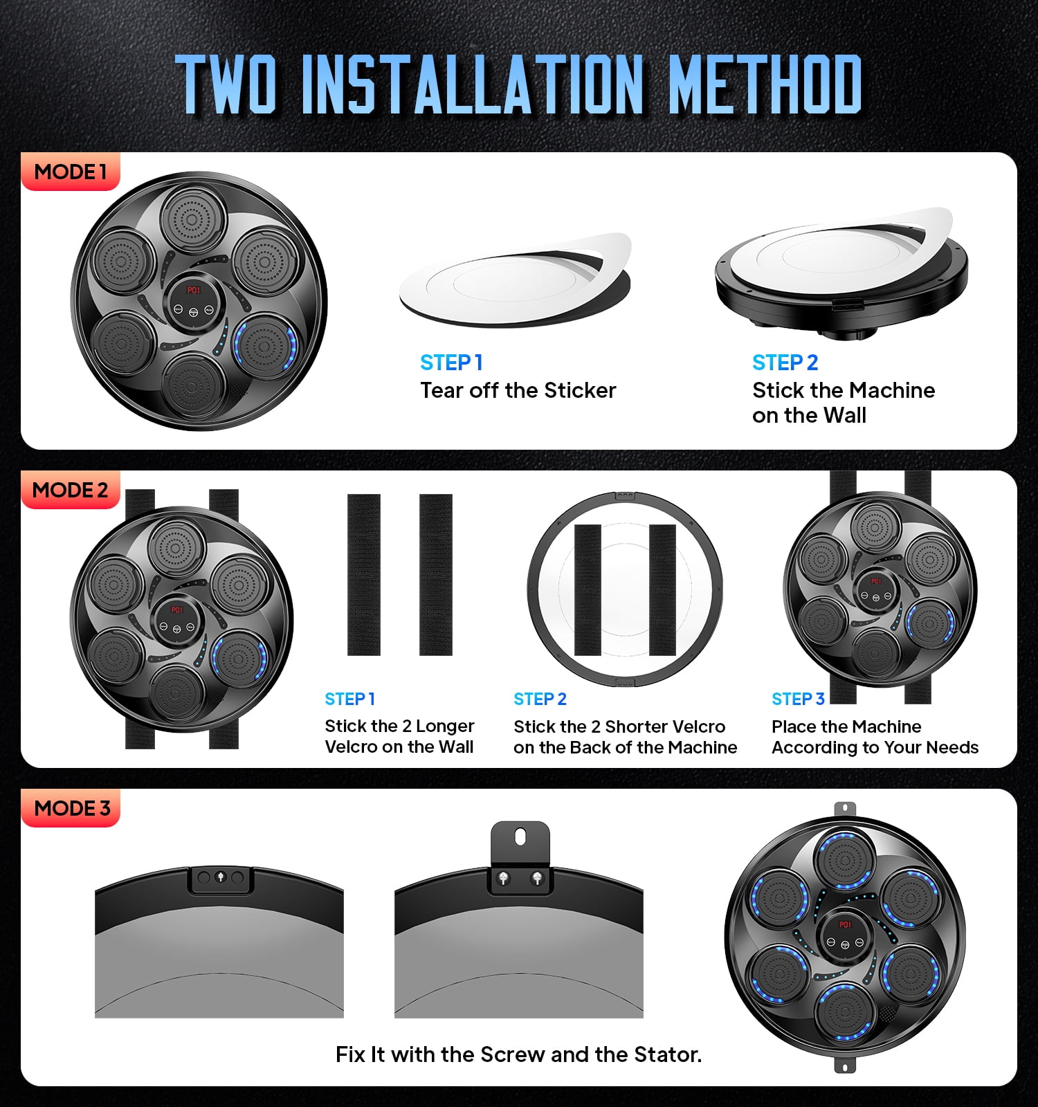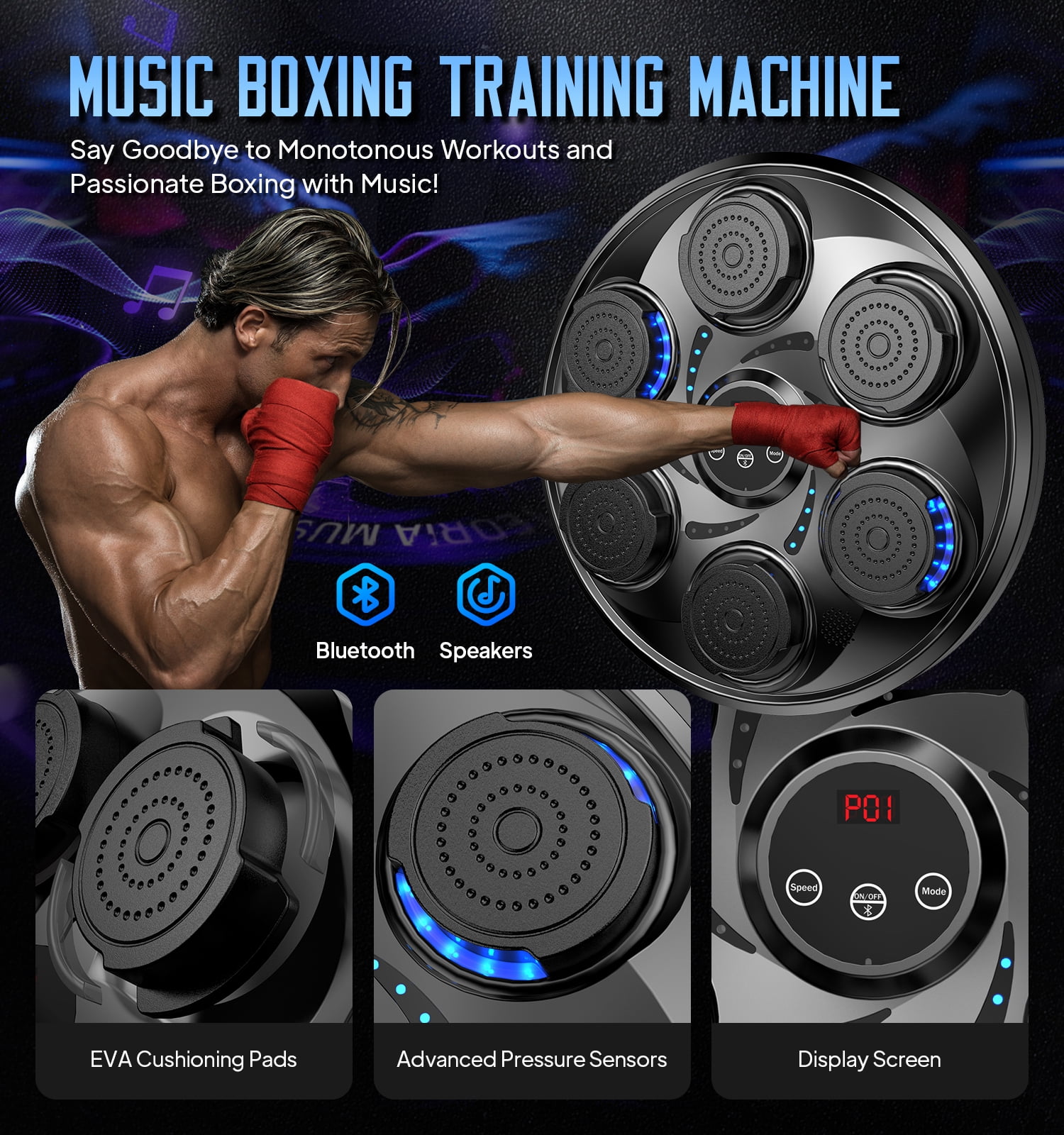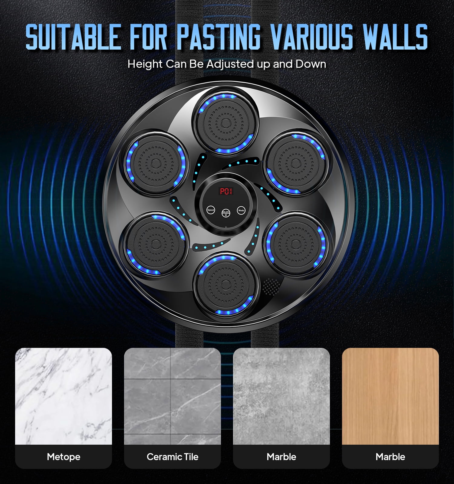 VARIOUS CHOICE OF SPEED MODES – With the smart touchscreen, adjust speed and lighting effects to match your workout intensity. This music boxing machine is designed to meet all your exercise needs, making every session dynamic and engaging. Perfect for boxing training equipment enthusiasts! INTELLIGENT MUSIC BOXING MACHINE – Upgraded with 9 precise volume levels and professional sound optimization, this music punching machine delivers exceptional music quality. The high-capacity battery ensures long-lasting performance, so you can focus on enjoying your workout music without interruptions. SIMPLE AND EFFICIENT INSTALLATION PROCESS – Featuring velcro height adjustment and flexible mounting options, this boxing equipment saves 90% of setup time. No additional punching bag accessories are needed, making it a hassle-free addition to your home, office, or gym. BLUETOOTH MUSIC BOXING – Connect your device via Bluetooth and play your favorite songs. The smart counting function tracks every punch, creating a motivating and energetic workout environment. Ideal for music punch lovers! SUITABLE FOR DIFFERENT PEOPLE – Perfect for men, women, kids, and seniors, this boxing machine for adults and kids can be used anywhere—living room, bedroom, office, or gym. Enjoy a fun and effective way to release stress without leaving your home!