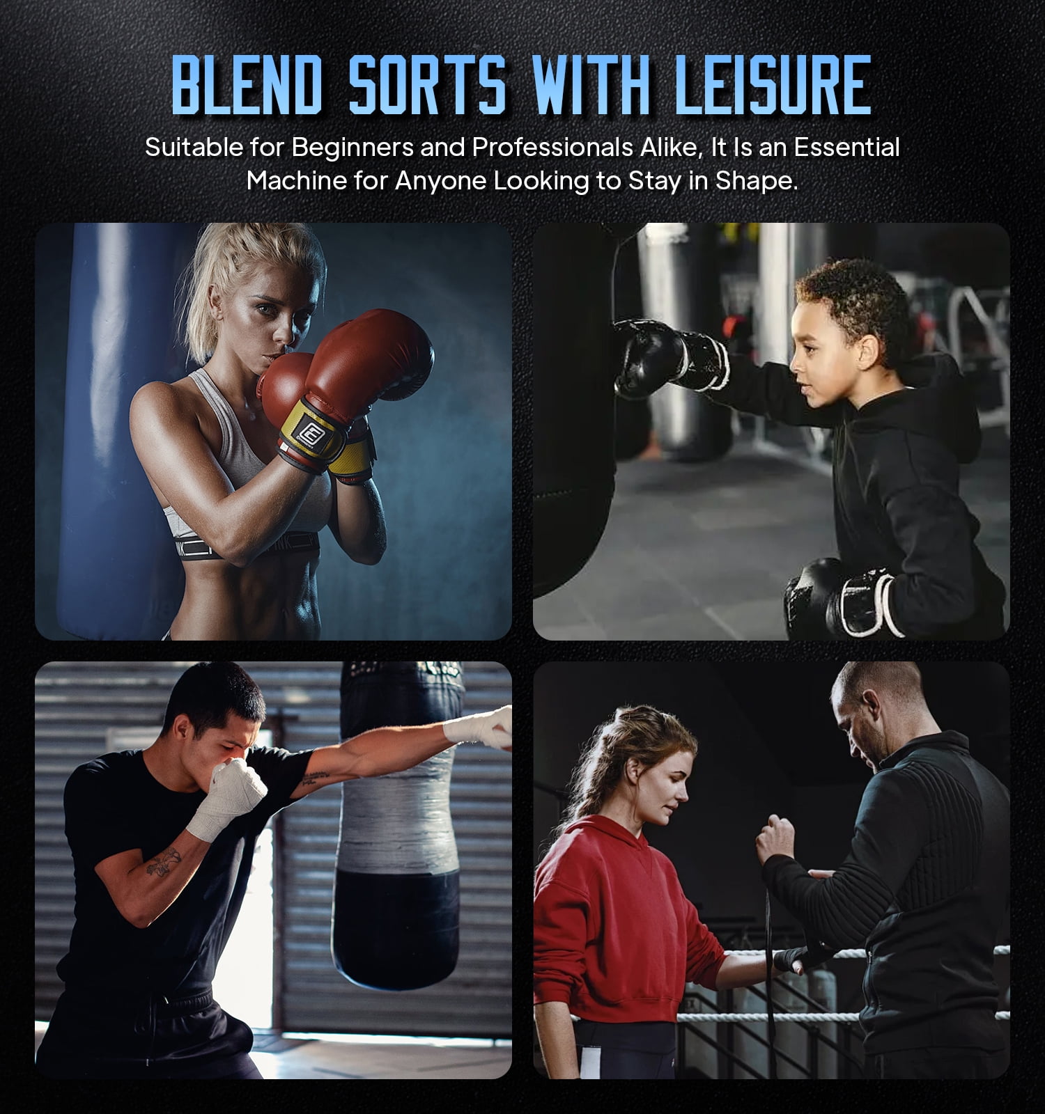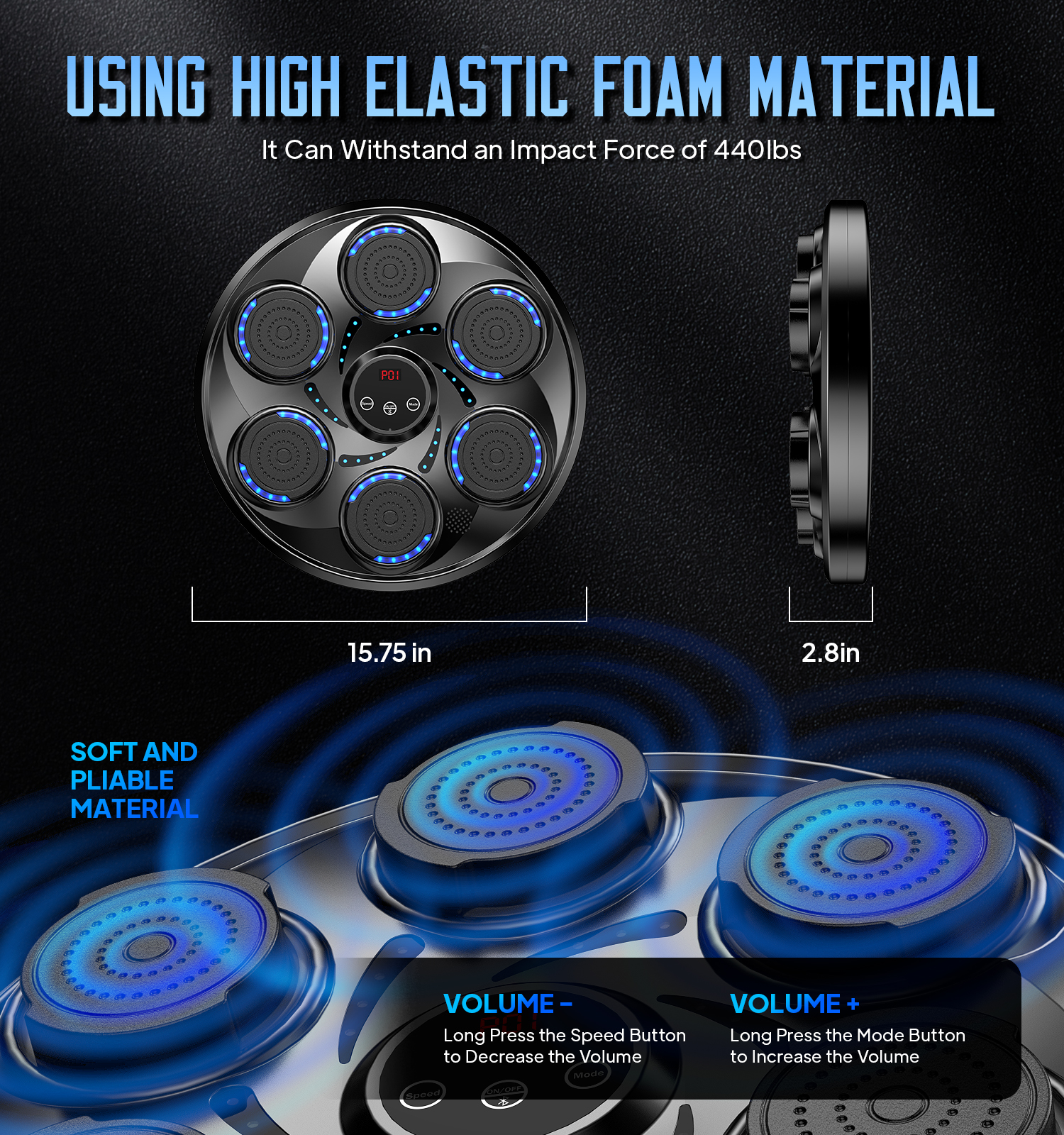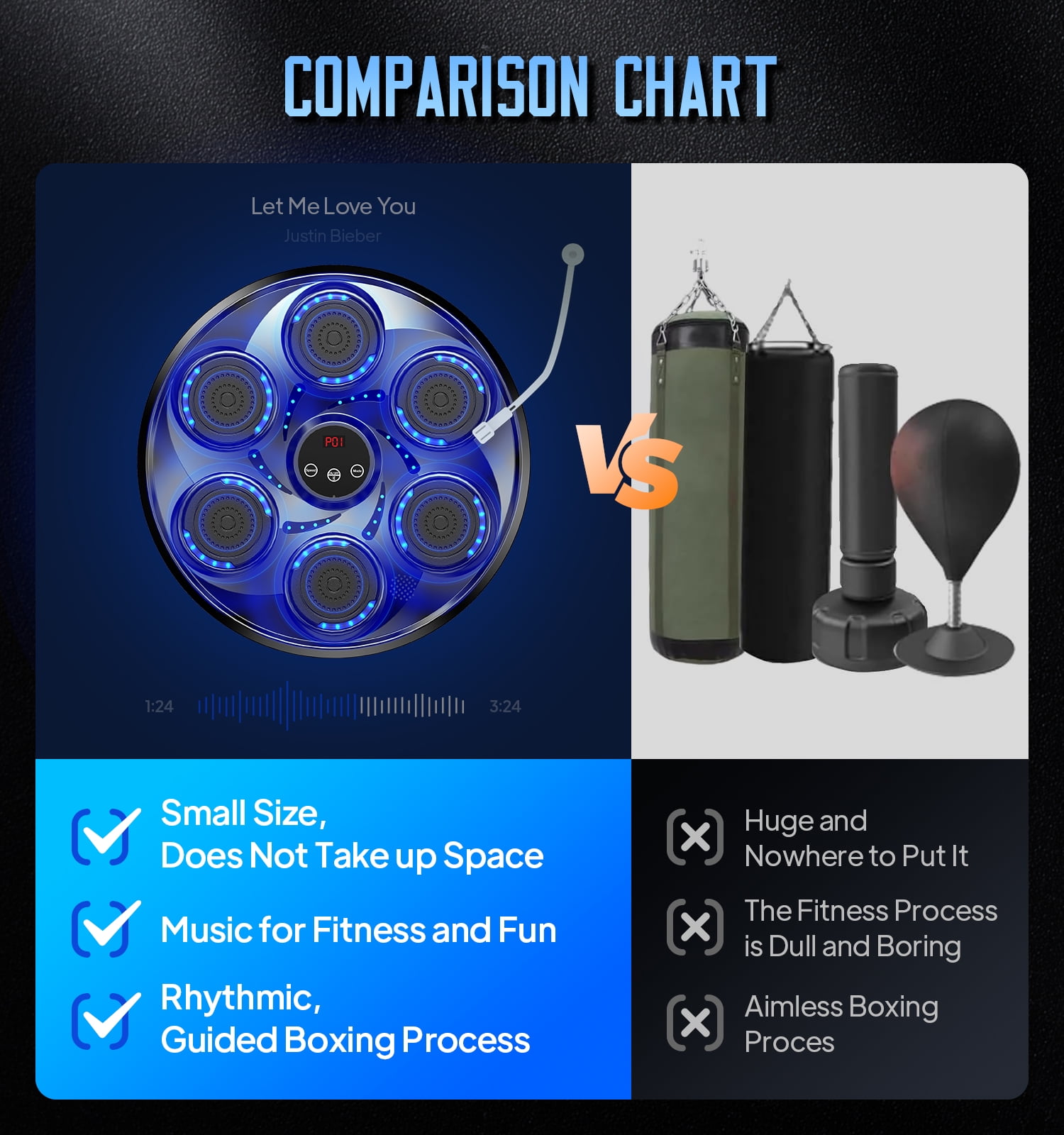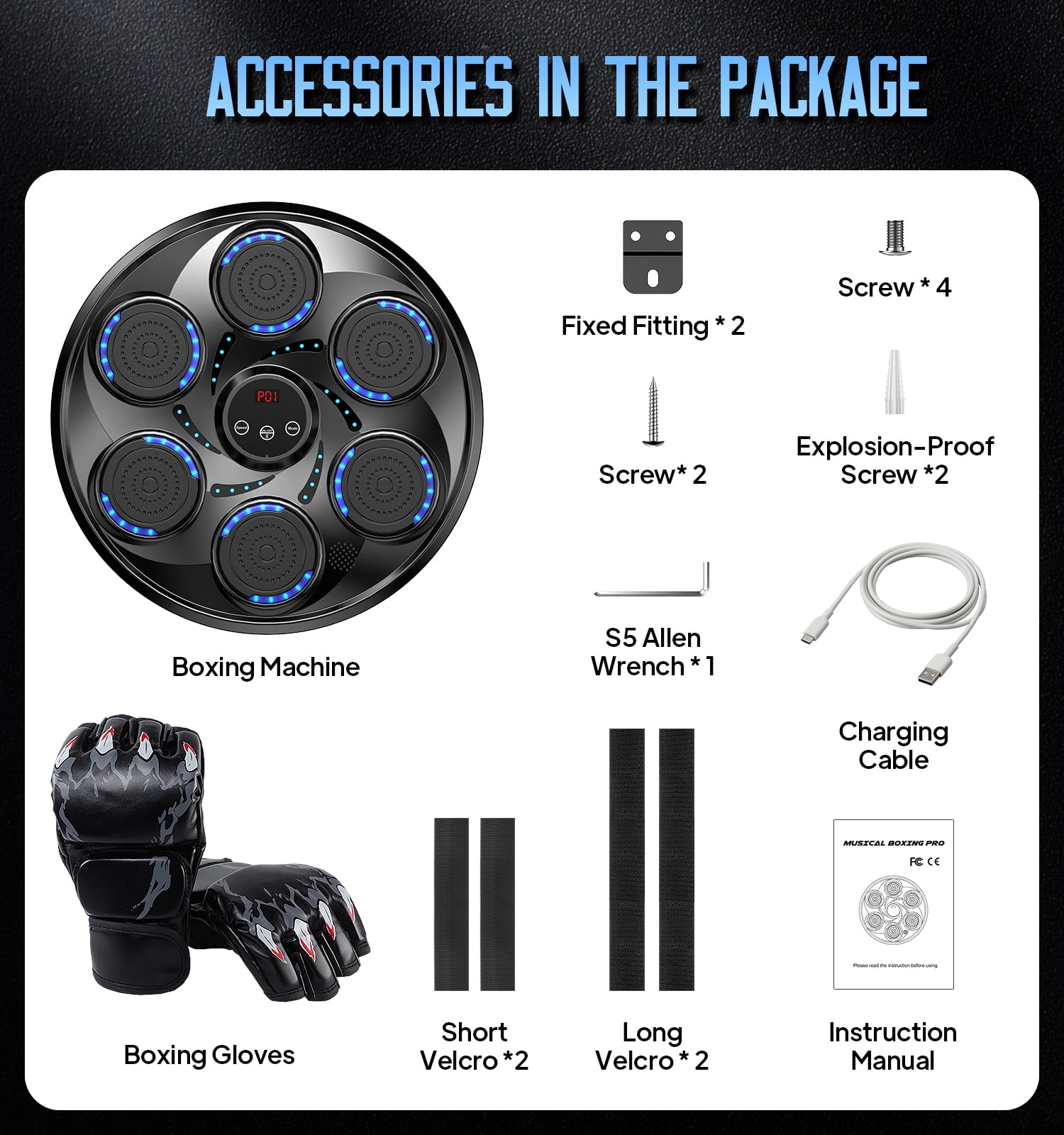 VARIOUS CHOICE OF SPEED MODES – With the smart touchscreen, adjust speed and lighting effects to match your workout intensity. This music boxing machine is designed to meet all your exercise needs, making every session dynamic and engaging. Perfect for boxing training equipment enthusiasts! INTELLIGENT MUSIC BOXING MACHINE – Upgraded with 9 precise volume levels and professional sound optimization, this music punching machine delivers exceptional music quality. The high-capacity battery ensures long-lasting performance, so you can focus on enjoying your workout music without interruptions. SIMPLE AND EFFICIENT INSTALLATION PROCESS – Featuring velcro height adjustment and flexible mounting options, this boxing equipment saves 90% of setup time. No additional punching bag accessories are needed, making it a hassle-free addition to your home, office, or gym. BLUETOOTH MUSIC BOXING – Connect your device via Bluetooth and play your favorite songs. The smart counting function tracks every punch, creating a motivating and energetic workout environment. Ideal for music punch lovers! SUITABLE FOR DIFFERENT PEOPLE – Perfect for men, women, kids, and seniors, this boxing machine for adults and kids can be used anywhere—living room, bedroom, office, or gym. Enjoy a fun and effective way to release stress without leaving your home!