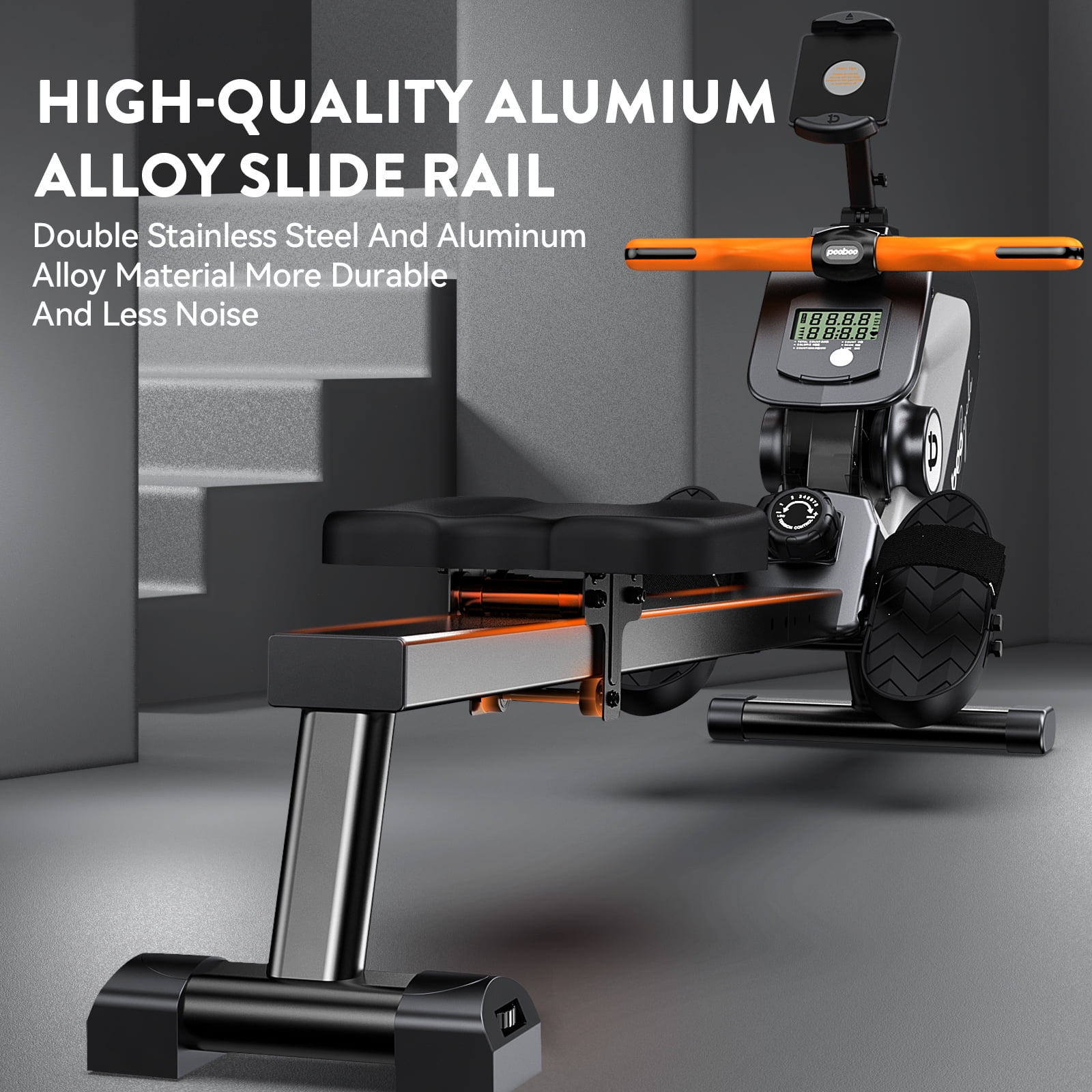 【8-Level Adjustable Magnetic Resistance】The H799 rowing machine offers 8-level adjustable magnetic resistance, allowing you to adjust the intensity of your workout. Super quiet flywheel design provides a silent rowing experience, no need worry to about bothering your families or neighbors 【180° Rotating & Ergonomic Silicone Handlebar】 180° Rotating handlebar allows you to adjust suitable training posture, and H799 is designed with ergonomic silicone that perfectly fits your hands which could give you a stable and comfortable exercise experience 【Widening and Thickening Rope】 0.95″ widen and thickening rope is made of high-quality nylon material, durable for use. It is stable, smooth, and quiet to pull 【High Quality & 350 LBS Capacity】 This rower is constructed with a sturdy frame and quality steel so it is very sturdy and safe, weighing up to 350 LBS 【Enhanced Slide Rail System】 The H799 rowing machine includes an upgraded slide rail system designed for smooth and safe exercise. The super smooth rail provides an expansive range and amplitude, perfect for high-intensity endurance training. 【Stretchable Rotating Phone Holder】 To meet different phone needs, H799 is designed with a stretchable rotating phone holder, you can adjust the phone holder according to your phone size. Besides, the phone holder with a non-slip back pad which could ensure your phone’s safety 【Adjustable Anti-Slip Big Pedals】 Big anti-slip pedals could meet different customers’ needs, you could adjust the most comfortable condition and start your training 【Comfortable Large Seat】 The rowing machine with a big comfortable seat, so you need not hurt your hip when training. 【Full Body Muscle Workout】 Equipped with a heavy flywheel and a high-quality magnetic control system, such a system could activate 92% of your body’s muscles. To build for reaching your training goals 【Vertically Place & Save Space】 H799 could be placed vertically in your room’s corner, it will help you save space when you do not use it. 【Transportation Wheels】 The rowing machine is designed with a smooth transportation wheel, you can move it anywhere easily without hurting your floor. 【Built-in Bluetooth Connectivity】 You can conveniently check your workout data, count, time, calories burned, and scan, by connecting Bluetooth.