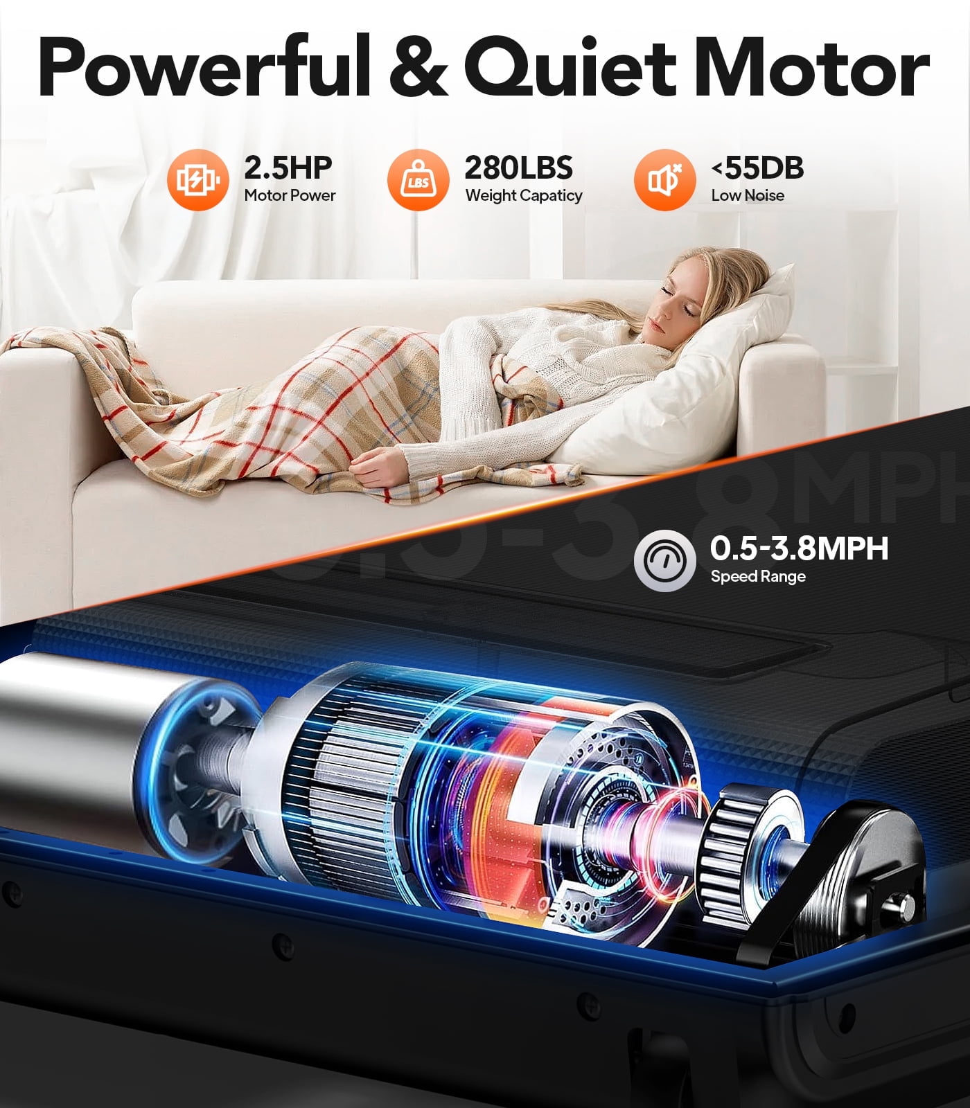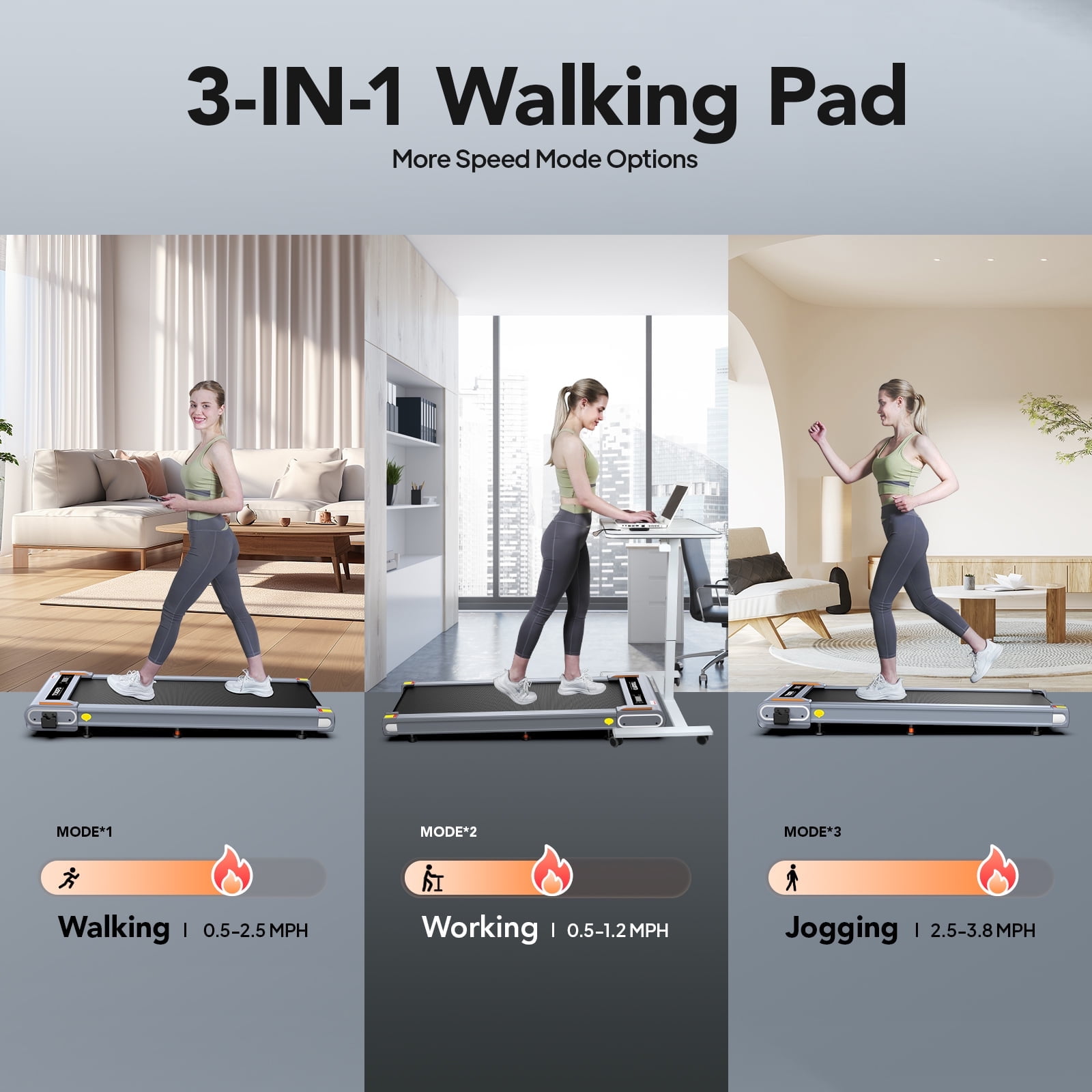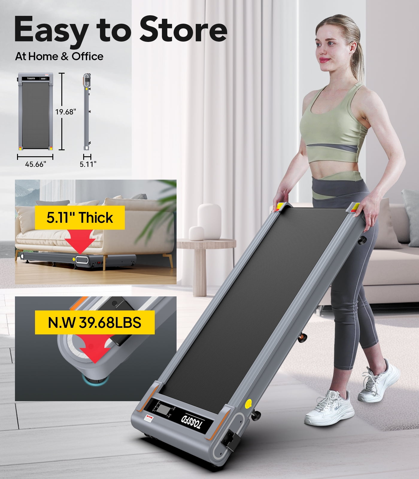 【Powerful Quiet Motor 2.5 HP】You won’t disturb others when you run or walk with this 2.5HP walking pad. Pooboo under desk treadmill is made of extra-thicken commercial steel and a high-quality motor for long-lasting durability, which makes your daily home exercise safe and stable, supporting a maximum weight capacity of 265 lbs. 【Walking Pad with Handle】Treadmill with handle provides provides added stability and support during your workout, promoting a safer and more comfortable exercise experience. It’s a valuable feature for users of all fitness levels, providing confidence and security while you train. 【Durable Shock Absorption】The walking treadmill is equipped with 5-layer anti-slip belt, providing 38.6″*15.7″ large running area for free movement. It can not only offer you with a comfortable experience,but also effectively reduce joint impact and protect your knees. 【Fully Assembly & Easy to Move】You could use the walking pad after open the box, don’t need waste your time to assemble. The compact, foldable design and built-in transport wheels make it easy to move and store the treadmill to save space.
